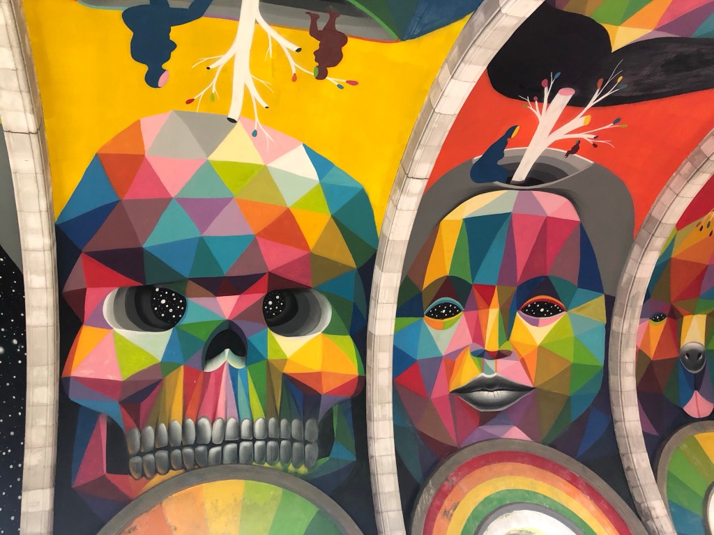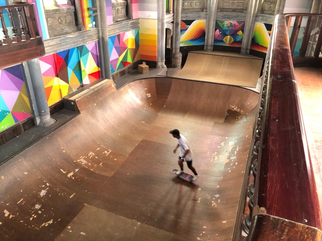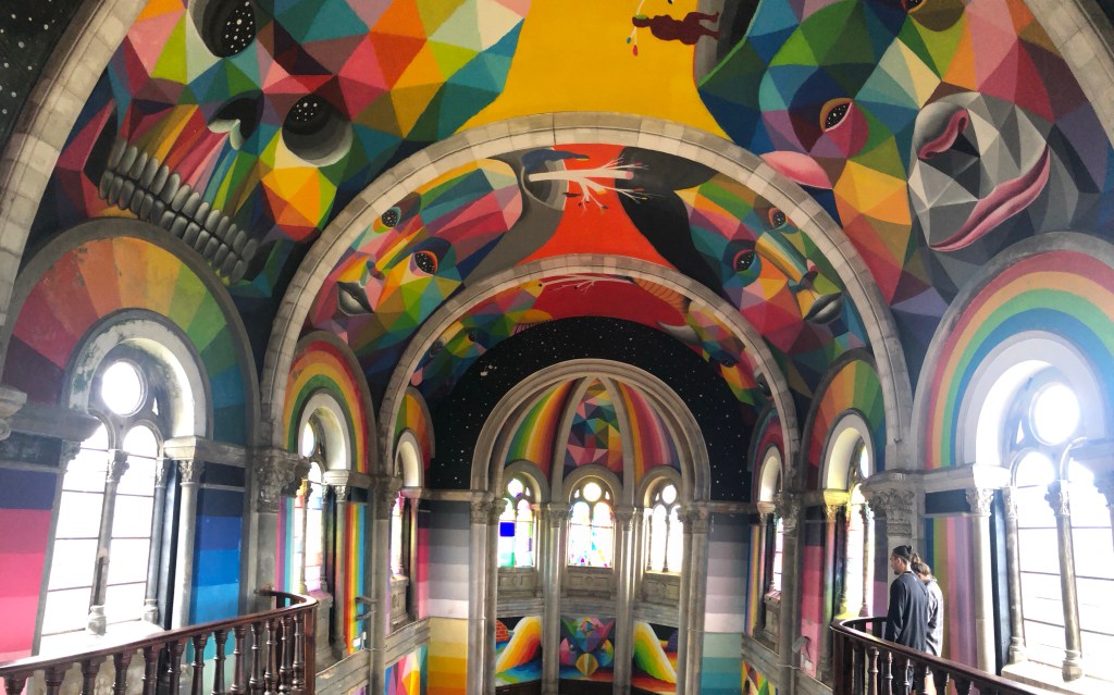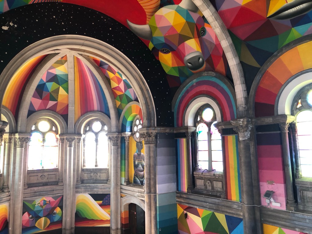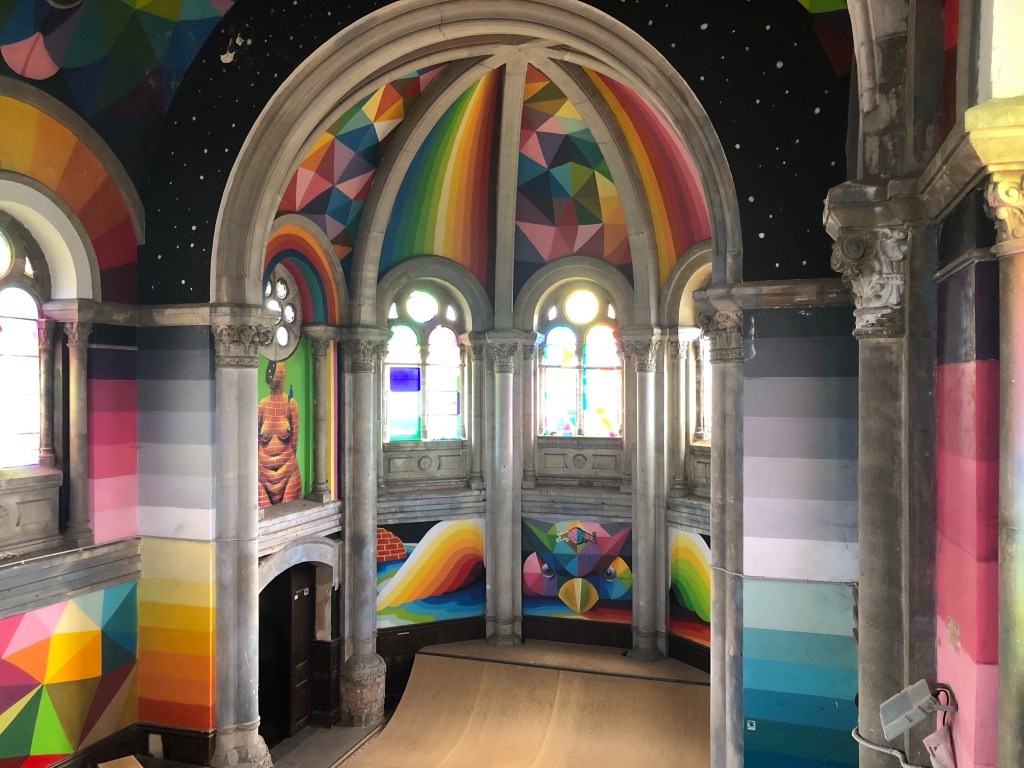 In die rund 100 Jahre alte Kirche wurde eine Halfpipe eingebaut und die Wände wurden vom spanischen Streetart-Künstler Okuda San Miguel gestaltet. Keine Heiligen zieren die Wände. Bunte graphisch gestaltet Figuren verleihen dem Raum durch den Lichteinfall einen mystischen Charakter. Der Besuch in der Kirche hat sich wirklich gelohnt. Das historistische Kirchlein wirkt unscheinbar, aber die Transformation innen zu einem Skatepark macht sie besonders. Die künstlereische Gestaltung lockt viele Interessenten an, nicht nur Sakter.