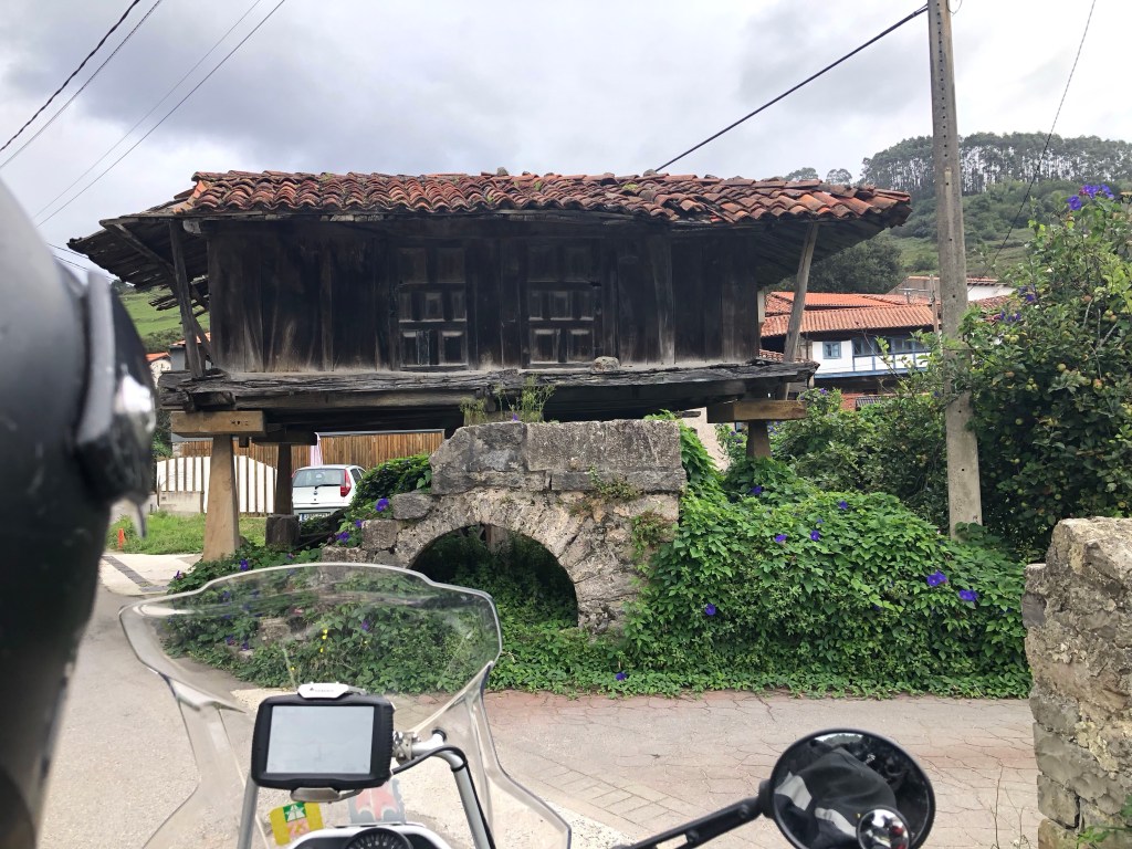 Schon in Asturien waren mir viele Speicherbauten aufgefallen, vier Pfeiler mit Plattenkapitellen, darauf ein quadratischer hausförmiger Holzaufbau, gedeckt mit einem flachen Zeltdach, seitlich eine Stiege, die aber mit einem Abstand knapp unterhalb des Speicherbodens endete. Die Kapitelle und die abgesetzte Stiege verhinderten, dass Mäuse oder andere Tiere hoch klettern konnten. Ich habe leider nur einen etwas schon ramponierten asturischen Speicher fotografiert. Es gibt im ländlichen Bereich sehr viele gut erhaltene, die heute zwar nicht mehr als Speicher dienen, manchmal parkt eine Auto darunter, oder irgendwelche Gerätschaften werden dort gelagert, bzw. wird die Fläche unterhalb für Tiere umzäunt – ein praktisches Häuschen für viele Zwecke.