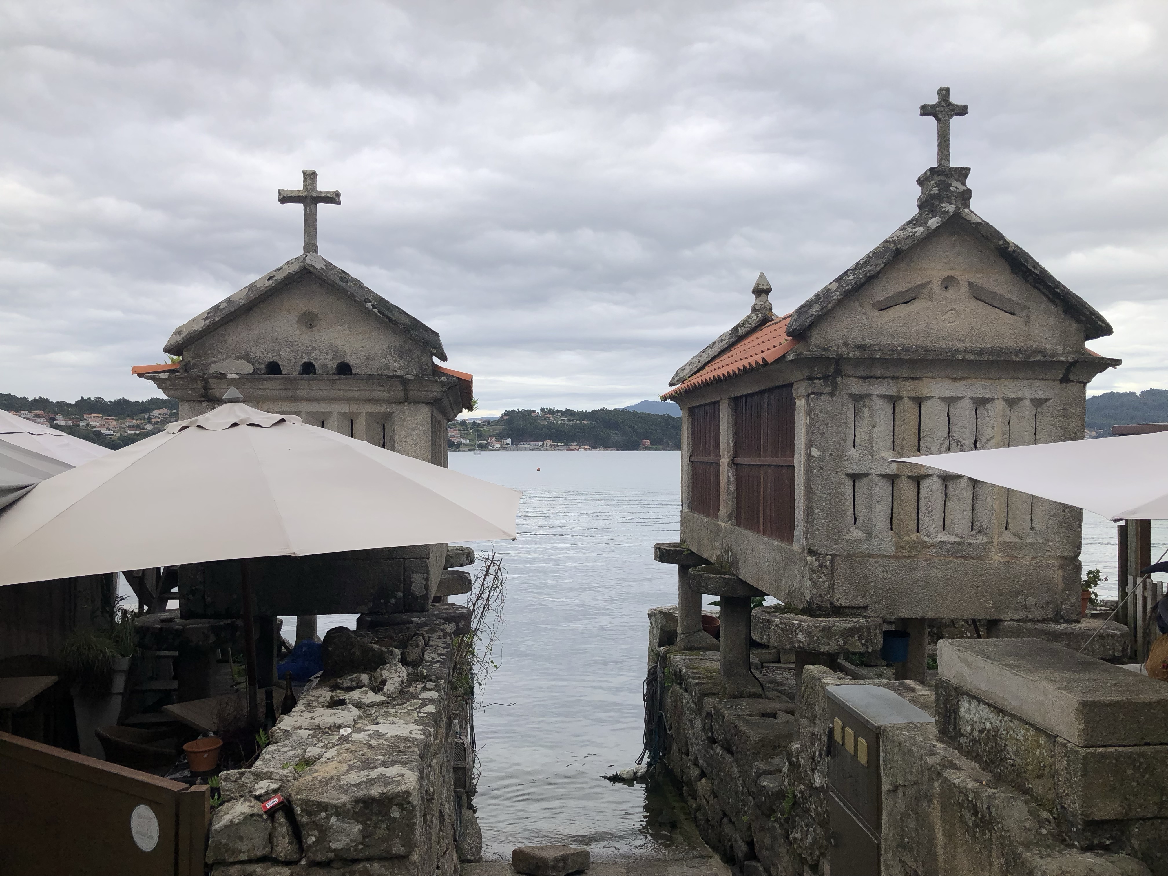 Jetzt habe ich mich schon über die asturischen Speicher ausgelassen. Die galizischen Speicherbauten – Horreo – sind gefühlt überall. Jedes Haus, das einen solchen Speicher hat, hegt und pflegt ihn und das nicht nur im ländlichen Bereich. Auch in A Coruna mitten in der Stadt hab ich einen gesehen. Die galizischen Bauten sind von der Form anders, sie sehen oft wie steinerne Sarkophage auf Pfeilern aus. Und weil ich so begeistert von den unterschiedlichen Konstruktionen war, machten wir sogar einen Abstecher nach Combarro, denn dort stehen eine ganze Reihe von Horreos direkt am Meer. Ich habe extra in Santiago de Compostella die Postkarte gekauft, damit wir den richtigen Platz finden. Unterwegs verzichtete ich, um von dem einen oder anderen besonders schönen Exemplar ein Foto zu machen. In Combarro sollte es genügend Gelegenheiten und Motive geben.