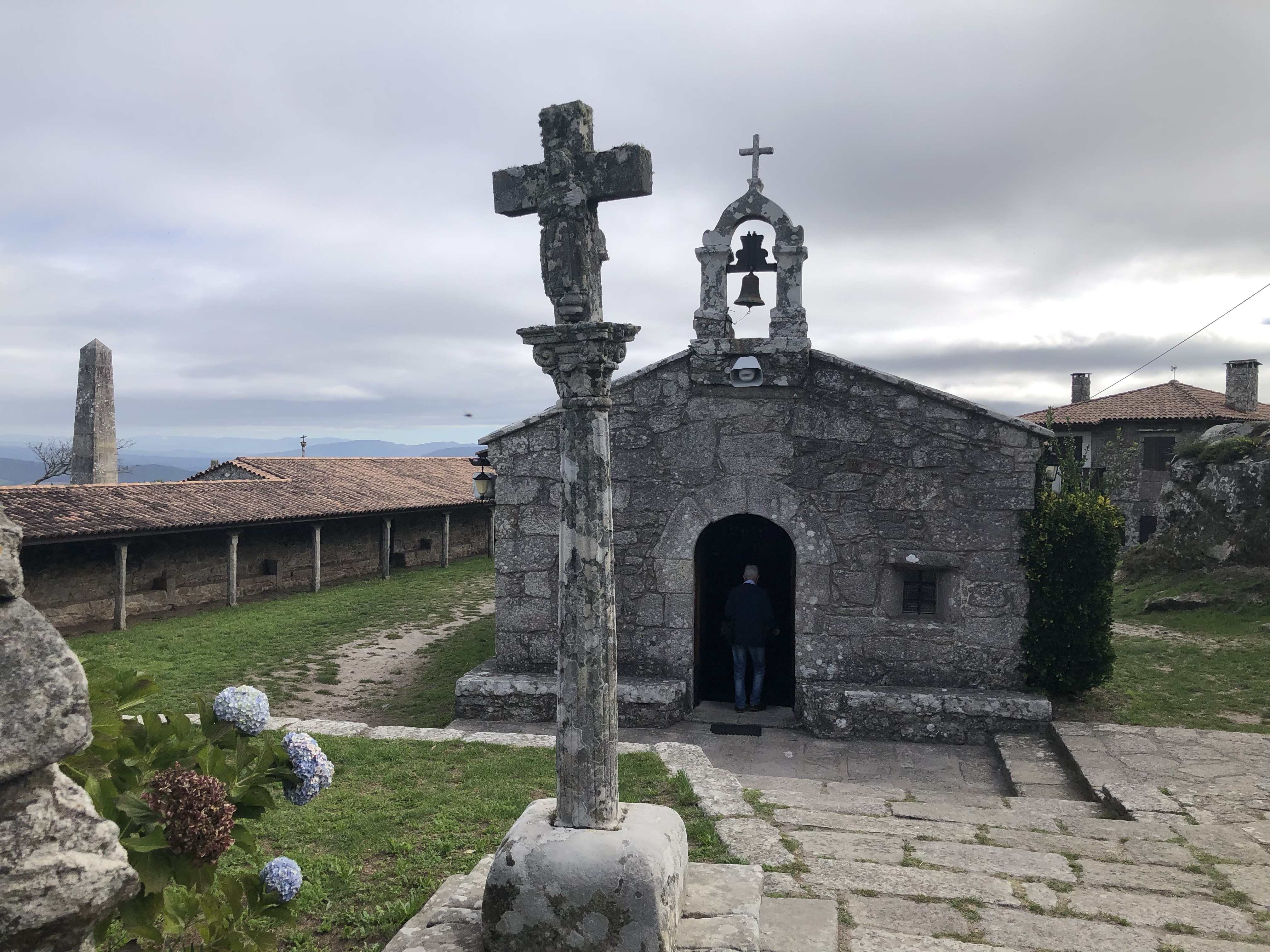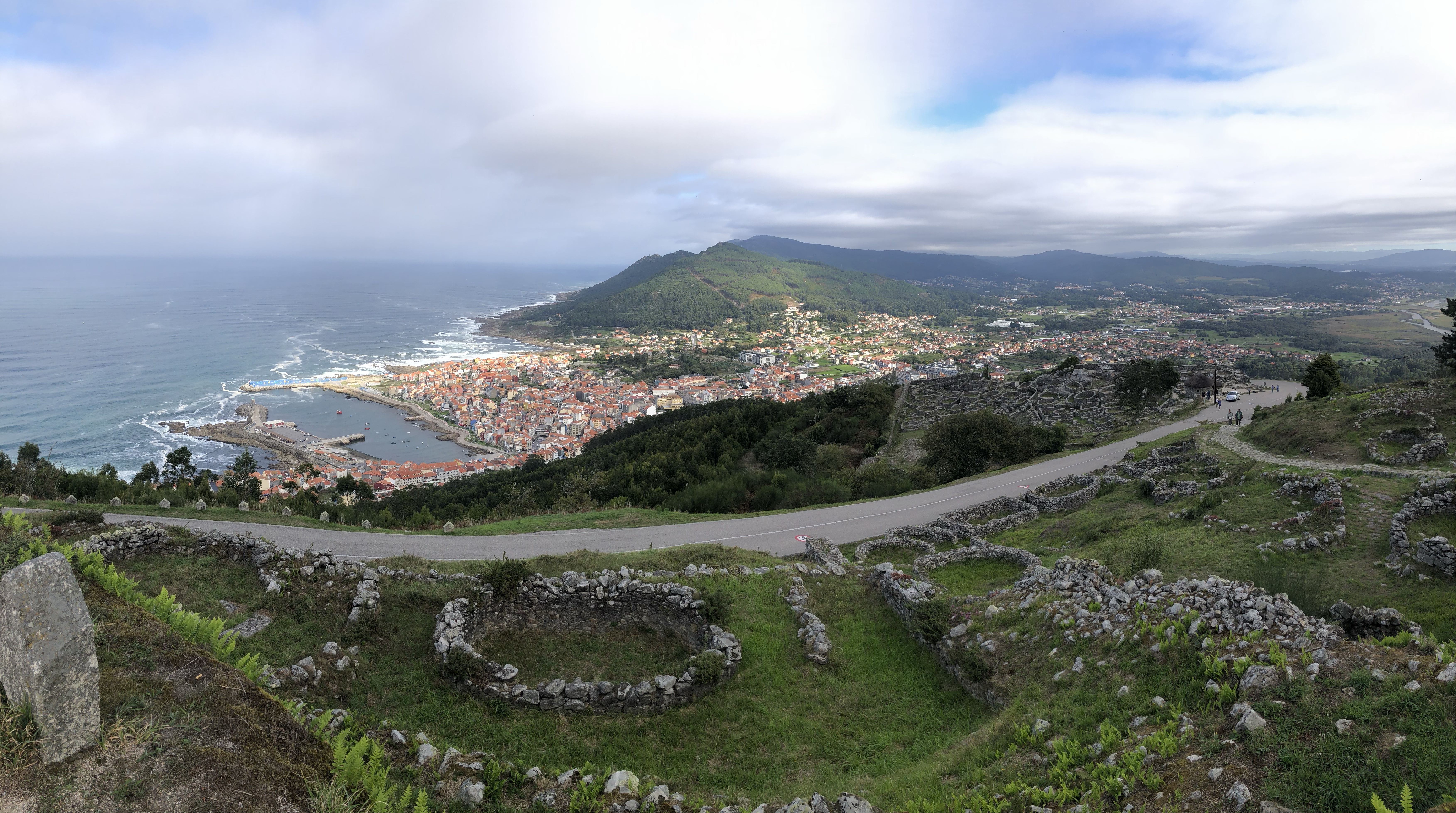 Wir wollen nicht nach Indien, uns reicht bei unserer Umrundung der Iberischen Halbinsel, die Eroberung der portugiesischen Sehenswürdigkeiten. Unser Startpunkt dafür war das für Entdecker nicht unbedeutenden Baiona. Denn, die Karavelle La Pinta, das Lieblingsschiff von Christoph Kolumbus, landete 1493 nach der ersten Reise in die Neue Welt in Baiona. Unser motorisiertes Schlachtschiff „der Bock“ legte beim Hotel Tre Carabellas ab und schipperte bei prächtigen Wetterbedingungen entlang der galizischen Küste weiter südwärts zum Monte Santa Trega. Der Berg ist aus mehreren kulturellen Aspekten interessant. Beim Bau der Straße stieß man auf eine Citania – eine Besiedelung, die auf das 4. vorchristliche Jahrhundert zurück geht. Zahlreiche aneinandergrenzende Rundbauten, umgeben von einer Mauer, bedecken eine Fläche von 20 Hektar. Nur eine Teil davon ist ausgegraben, aber die Struktur ist gut erkennbar. Bis zu 5000 Personen sollen hier gelebt haben. Am Berggipfel befindet sich eine Einsiedelei, die auf das 12. Jahrhundert zurück geht. Davor steht ein dem Heiligen Franziskus geweihtes Steinkreuz. Solche Steinkreuze sind eine besondere galizische Erscheinung. Ich habe gelesen, dass es 12.000 solche Wegkreuze in der Provinz noch geben soll.