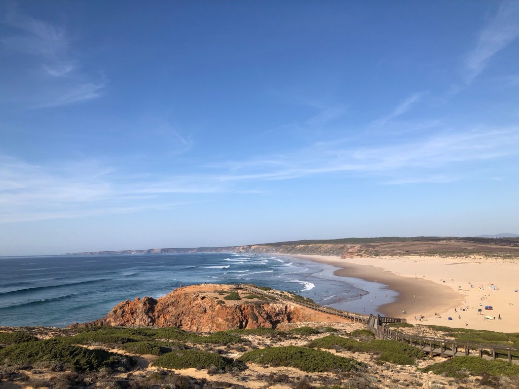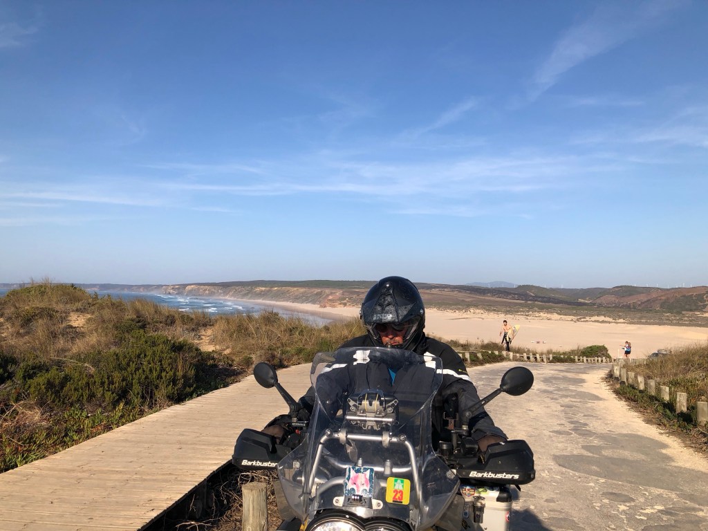In einem kleinen Irgendwo-Dorf (5 Häuser, eine Taverne, ein Bus-Häuschen und ein öffentliches Klo, keine Kirche, ein paar staubige klapprige alte Autokisten am Straßenrand) machten wir halt für eine Kaffeepause. Die Tische unter dem Vordach der Taverne waren bis auf einen alle voll besetzt. Bei unserer Ankunft hatten wir gar nicht richtig hingehört, es hat uns nur verwundert, dass uns der Wirt gleich in Deutsch ansprach als er die Bestellung aufnahm. Wir mussten in einer deutschen Auswandererenklave gelandet sein. Alle unterhielten sich in Deutsch. Niemand sah wie ein Tourist aus und die Gespräche handelten von den Alltagsproblemen, z.B.: Krankenhausbesuchen und Autoreparaturen. Mit einem „Tschüs“ wurden wir freundlich verabschiedet. Wir zogen weiter. Die Landschaft wurde wegen der Trockenheit immer karger, die Dörfer mit den weißen Häusern blitzen in der Sonne. Wie konnte es an der wunderbaren Atlantikküste anders sein, natürlich musste noch ein Wellensurfer-Unterbrechungs-Stopp gemacht werden. Der Pontal da Carrabadeira hat uns magisch angezogen, eine riesige Sanddüne, eine gelber Sandstrand, tief blaues Meer, Schaumkronen, die von den anbrandenden Wellen dahingetrieben wurden und zahlreiche Wellenreiter, die auf die perfekte Welle im Wasser auf ihren Brettern warteten.