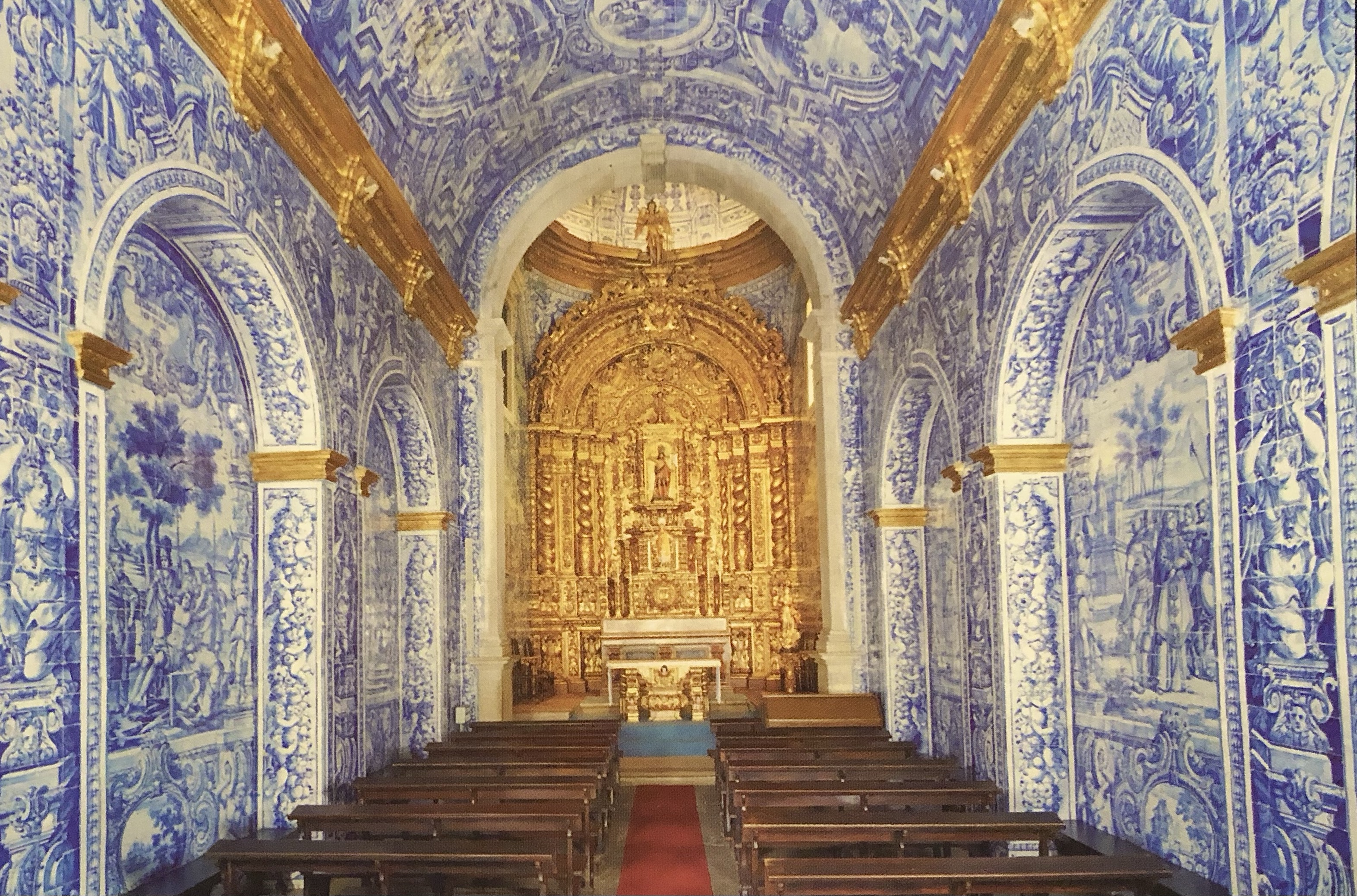 Einen besonders aussergewöhnlichen Kirchenbau entdeckten wir bei Almancil – Igreja de Sao Lourenco. Die Barockkirche ist im Innenraum vollständig mit Kacheln bedeckt, die Szenen aus dem Leben des Hl. Lorenz erzählen. Die Fliesen kommen aus Lissabon und sind von Policarpo de Oliveira Bernardes, 1730, signiert. Zu erwähnen sind natürlich die vergoldeten Holzschnitzarbeiten des Altares, die einem der bedeutendsten Bildhauer seiner Zeit an der Algarve, Manuel Martins, zugeschrieben wurden. Leider herrschte in der Kirche absolutes Foto-Verbot. Die Damen bei der Kassa hatte scheinbar eine versteckte Kamera irgendwo. Mit der war nicht zu spassen. Auf alle Fälle kurbelte sie mit ihrer Taktik den Verkauf von Postkarten an. Nun, der Innenraum der Kirche ist einfach einzigartig. Die Kirche ist ein vollendetes Zeugnis der Azulejo-Kunst in Portugal. Die Verwendung von Fliesen hat hier eine lange Tradition und sie werden sowohl in Innenräumen als auch bei Aussenfassaden verwendet, wie wir schon an früheren Beispielen gesehen haben. Oftmals werden sie – so wie in der Hl. Lorenz Kirche zu ganzen Bildgeschichten zusammengefügt. Ornamental gestaltete Azulejos weisen meist auf einen islamische Ursprung hin. Portugal ohne Fliesen, das ginge gar nicht.