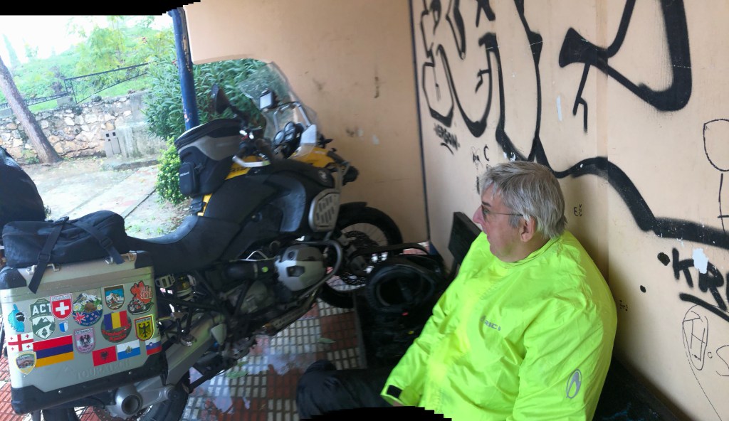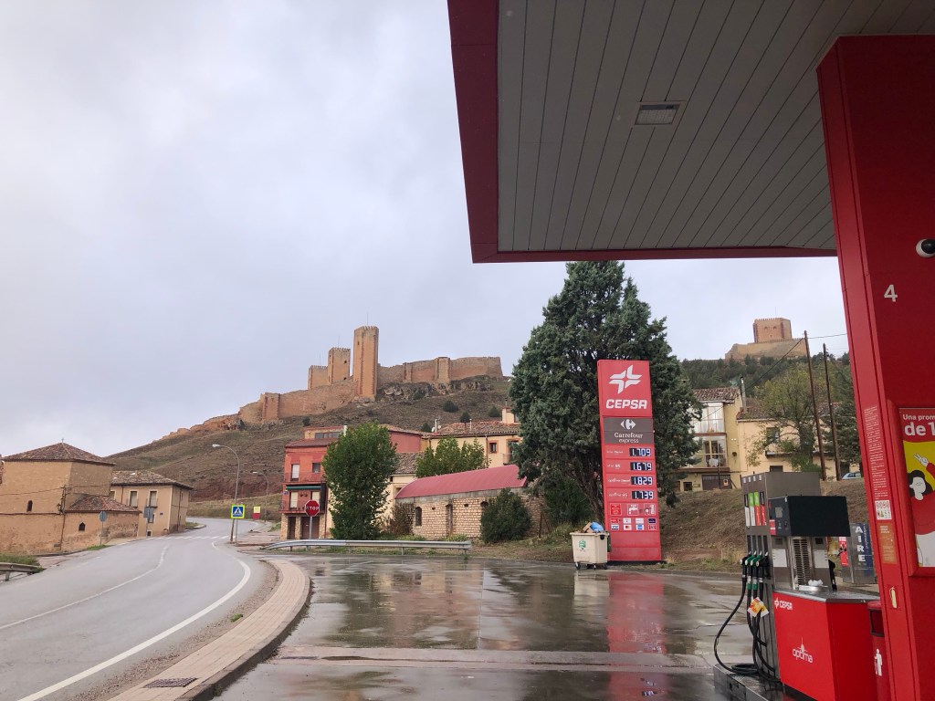 Umgeben von schwarzen Regenwolken, rosa Hagelwolken, kräftigen Sturmböen wirbelten wir nur so über die fast menschenleeren Ebenen, Hochplateaus und Hügeln durch die Provinz Aragon. Es war nicht nur kalt, sondern auch beängstigend, was sich da wettertechnisch um uns herum abspielte. Sintflutartige Regengüsse mussten im Bushäuschen ausgesessen werden. Der Bock-Chef spannte dann richtig ein und wir brausten buchstäblich mit dem Wind um die Wette zwischen hunderten Windrädern und durch zwei mächtige Regenbögen auf Saragossa zu.