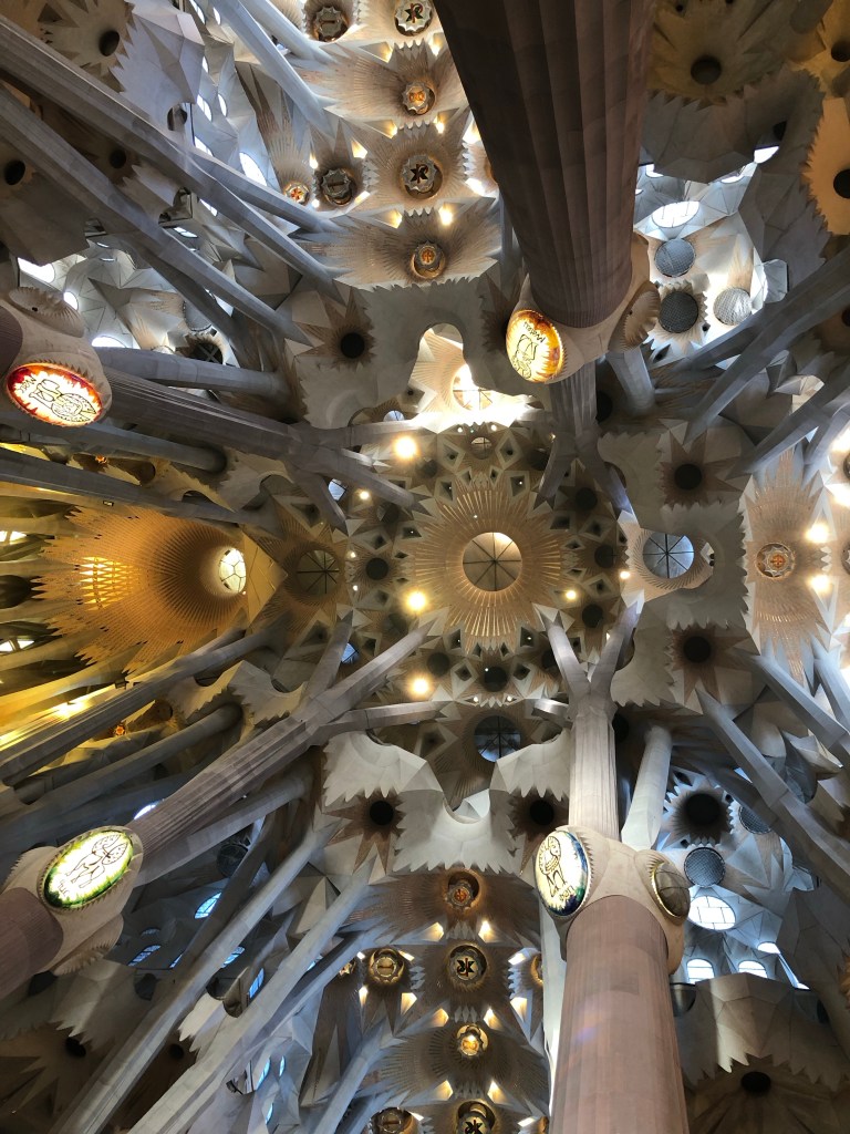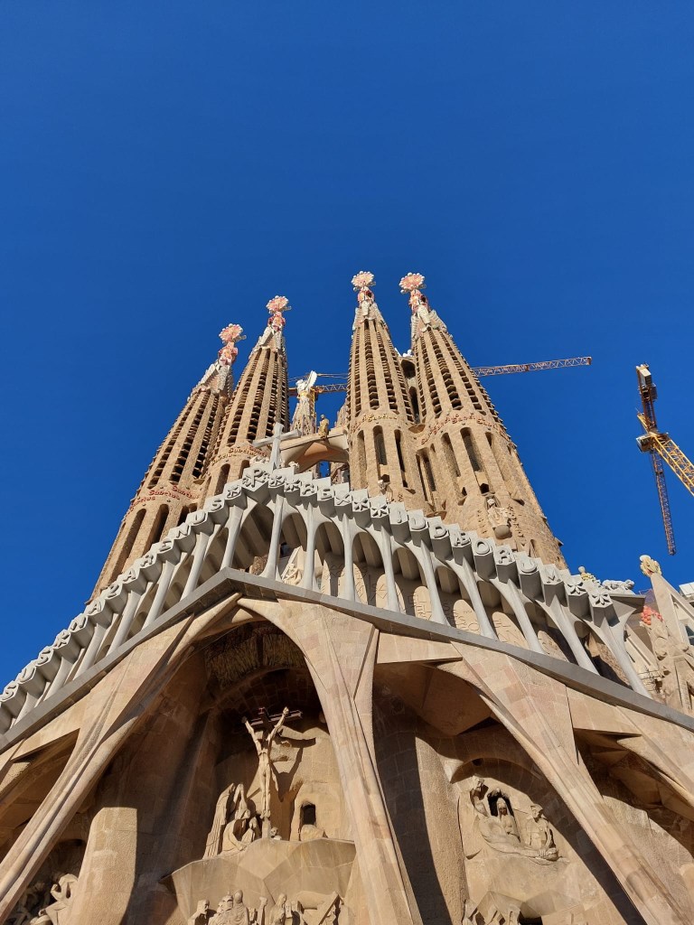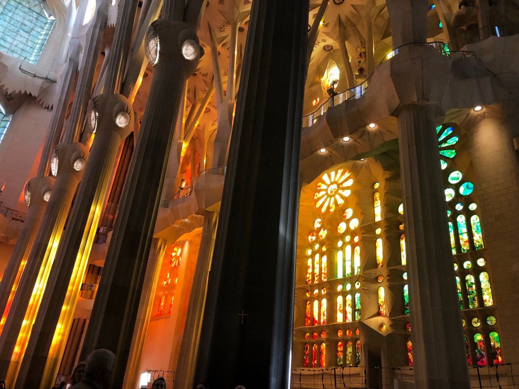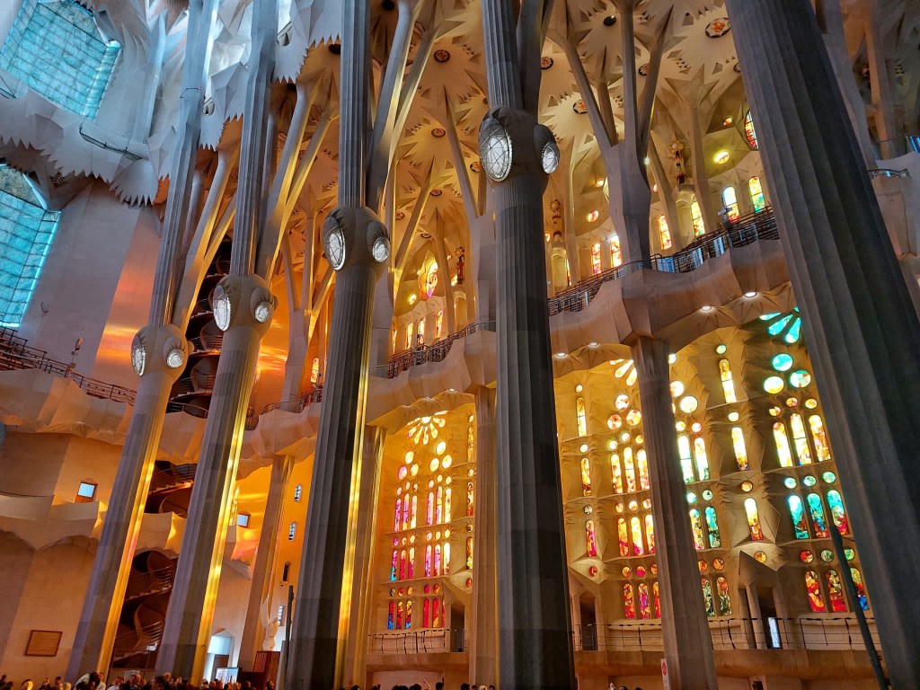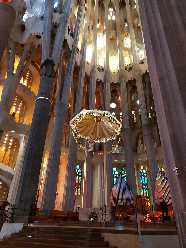 Und noch viel mehr Gewusel gab es in der Sagrada Familia (Bauzeit 1882 bis heute), dem Lebenswerk Gaudis. Auch für dieses gigantische Bauwerk war einiges an Recherchen im Vorfeld notwendig und es bedurfte eines tiefen Griffes in die Brieftasche, um an Tickets für eine Führung und eine Turmbesichtigung zu kommen. Schon vor 29 Jahren war ich einen Sprung in Barcelona und wollte die Kirche sehen. Mein damals fast fünfjähriger Sohn schimpfte mich: „Du intergalaktische Gurke! Immer muss ich mit dir Kirchen anschauen.“ Scheinbar hatte er zu viel Star Wars geschaut! Trotzig verzichtete ich auf den Besuch, bestellte für ihn im Hotel Spaghetti Carbonara und für mich einen üppigen Cheesecake und das war´s mit Barcelona. Nächsten Tag flogen wir weiter nach Mallorca. Heute bin ich ihm dankbar dafür, den mittlerweile ist der Bau zwar noch immer unvollendet, aber weit fortgeschritten. Es gibt ein Dach, bunte Glasfenster und die Idee, die Gaudi mit der biblischen Erzählung in dieser einzigartig gebauten Natur verfolgte, ist hautnah spürbar. Nach der Führung saßen wir noch eine Weile in der Kathedrale und ließen alles nochmals auf uns wirken. Die Sagrada Familia ist für mich so eine überwältigende Schöpfung. Ich weiß gar nicht, wie ich die Eindrücke in Worte fassen kann. Die Ausdrucksformen des Kirchenbaus der Vergangenheit verschmelzen mit einer modernen ausdrucksstarken Interpretation, die schon fast etwas science fiction artiges ausstrahlen. Für mich ist sie einfach „intergalaktisch“ schön. Danke, danke, danke für das phantastische Erlebnis Sagrada Familia.