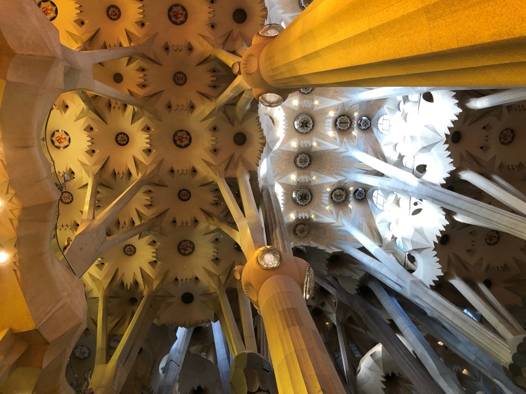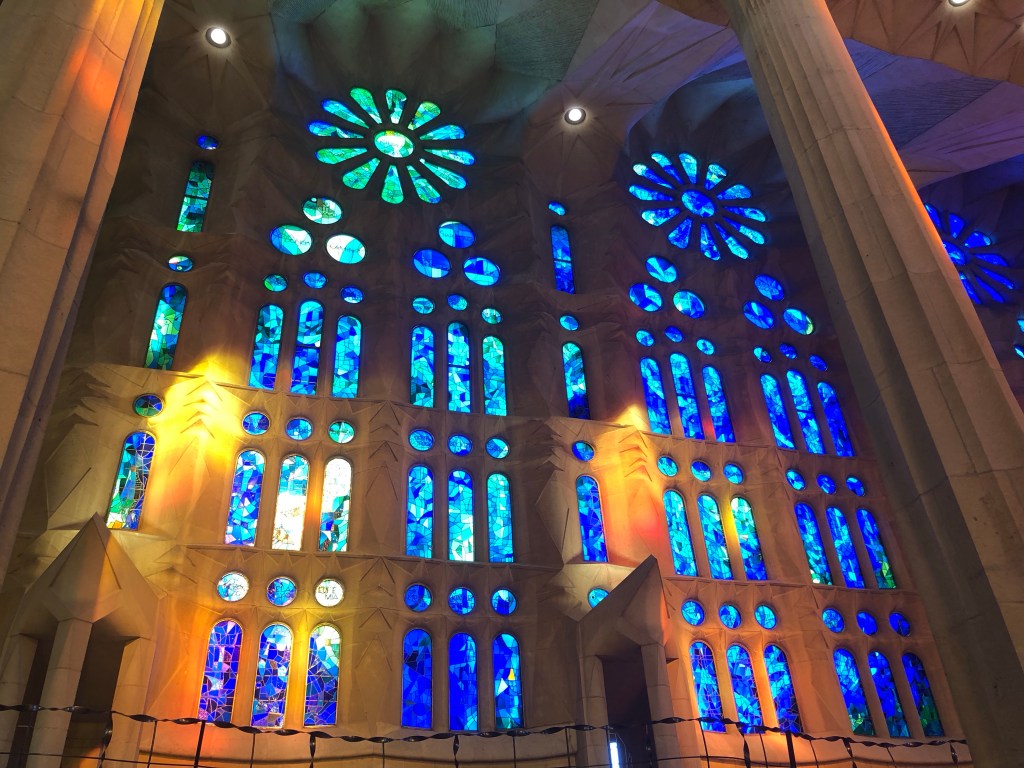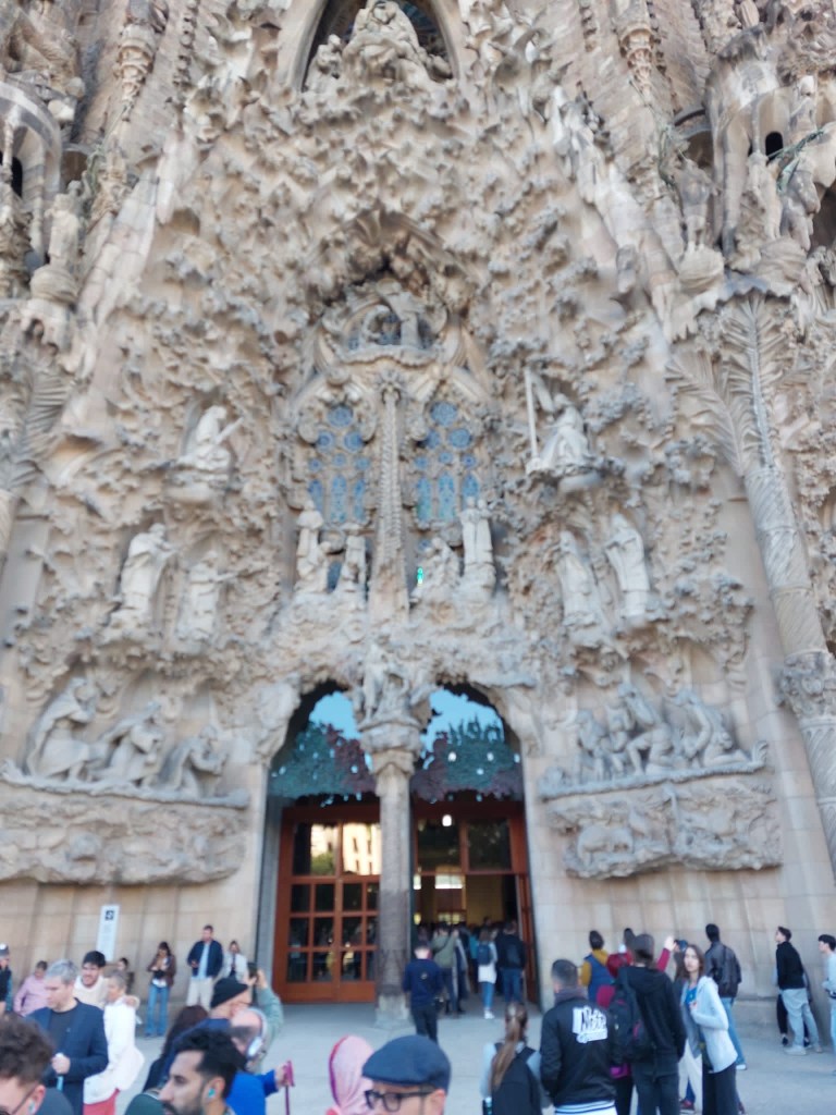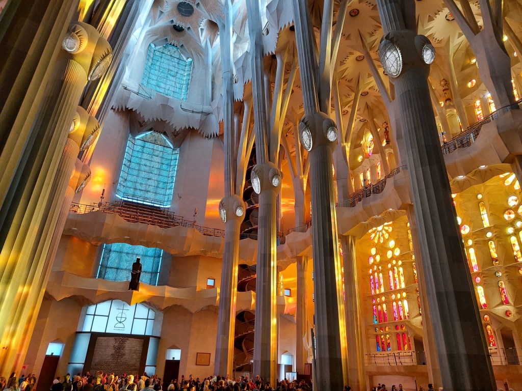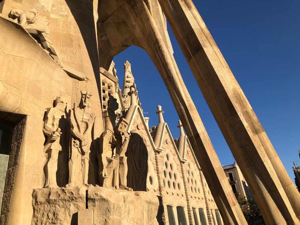 Und noch viel mehr Gewusel gab es in der Sagrada Familia (Bauzeit 1882 bis heute), dem Lebenswerk Gaudis. Auch für dieses gigantische Bauwerk war einiges an Recherchen im Vorfeld notwendig und es bedurfte eines tiefen Griffes in die Brieftasche, um an Tickets für eine Führung und eine Turmbesichtigung zu kommen. Schon vor 29 Jahren war ich einen Sprung in Barcelona und wollte die Kirche sehen. Mein damals fast fünfjähriger Sohn schimpfte mich: „Du intergalaktische Gurke! Immer muss ich mit dir Kirchen anschauen.“ Scheinbar hatte er zu viel Star Wars geschaut! Trotzig verzichtete ich auf den Besuch, bestellte für ihn im Hotel Spaghetti Carbonara und für mich einen üppigen Cheesecake und das war´s mit Barcelona. Nächsten Tag flogen wir weiter nach Mallorca. Heute bin ich ihm dankbar dafür, den mittlerweile ist der Bau zwar noch immer unvollendet, aber weit fortgeschritten. Es gibt ein Dach, bunte Glasfenster und die Idee, die Gaudi mit der biblischen Erzählung in dieser einzigartig gebauten Natur verfolgte, ist hautnah spürbar. Nach der Führung saßen wir noch eine Weile in der Kathedrale und ließen alles nochmals auf uns wirken. Die Sagrada Familia ist für mich so eine überwältigende Schöpfung. Ich weiß gar nicht, wie ich die Eindrücke in Worte fassen kann. Die Ausdrucksformen des Kirchenbaus der Vergangenheit verschmelzen mit einer modernen ausdrucksstarken Interpretation, die schon fast etwas science fiction artiges ausstrahlen. Für mich ist sie einfach „intergalaktisch“ schön. Danke, danke, danke für das phantastische Erlebnis Sagrada Familia.