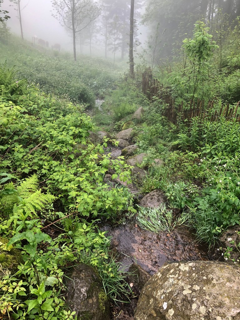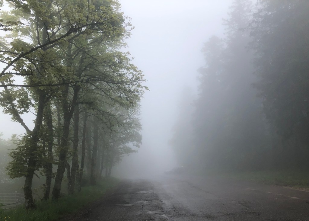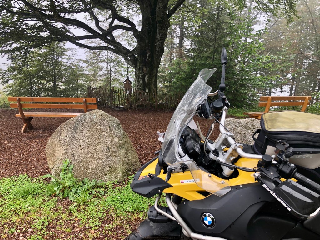 Die Weiterfahrt am nächsten Tag nach Colmar führte uns abermals in den Schwarzwald, grundsätzlich eine tolle Gegend zum Motorradfahren, viel grüne Natur, tolle kleine kurvige „Strässlis“ (Strassen), Hügel auf und Hügel ab, vorbei an malerischen kleinen Dörfern. Bei unserer „extra foggy Tour“ war aber nicht viel vom märchenhaften Schwarzwald zu sehen. Kleine Highlights gab es aber trotzdem. Das ist ja das Schöne am Motorradreisen, dass man sich abseits der großen Routen bewegt und so manch lokalen Kulturschatz entdeckt. Und nicht zu vergessen, dass Meister Garmin ein wildes Schottersträssli auf unserem Weg zur Donauquelle eingebaut hatte. Der Bock-Chef behauptete zwar, dass sich der Meister das selber ausgedacht hätte, aber da bin ich mir nicht ganz so sicher, ob das nicht seiner Planung geschuldet war.