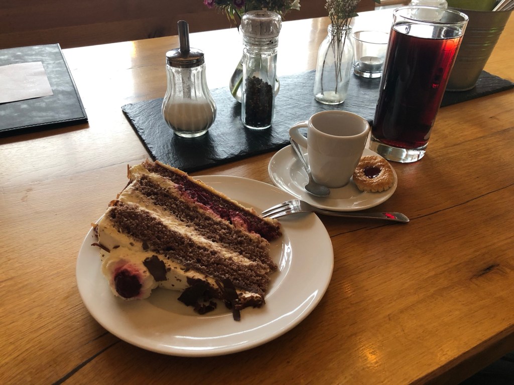 Einige Tage waren wir schon im Schwarzwald unterwegs, aber eine richtige Schwarzwälder Kirschtorte hatten wir noch gar nicht gegessen. Der beste Platz dafür war im Wirtshaus an der Donauquelle im Hochschwarzwald, hmmmm.