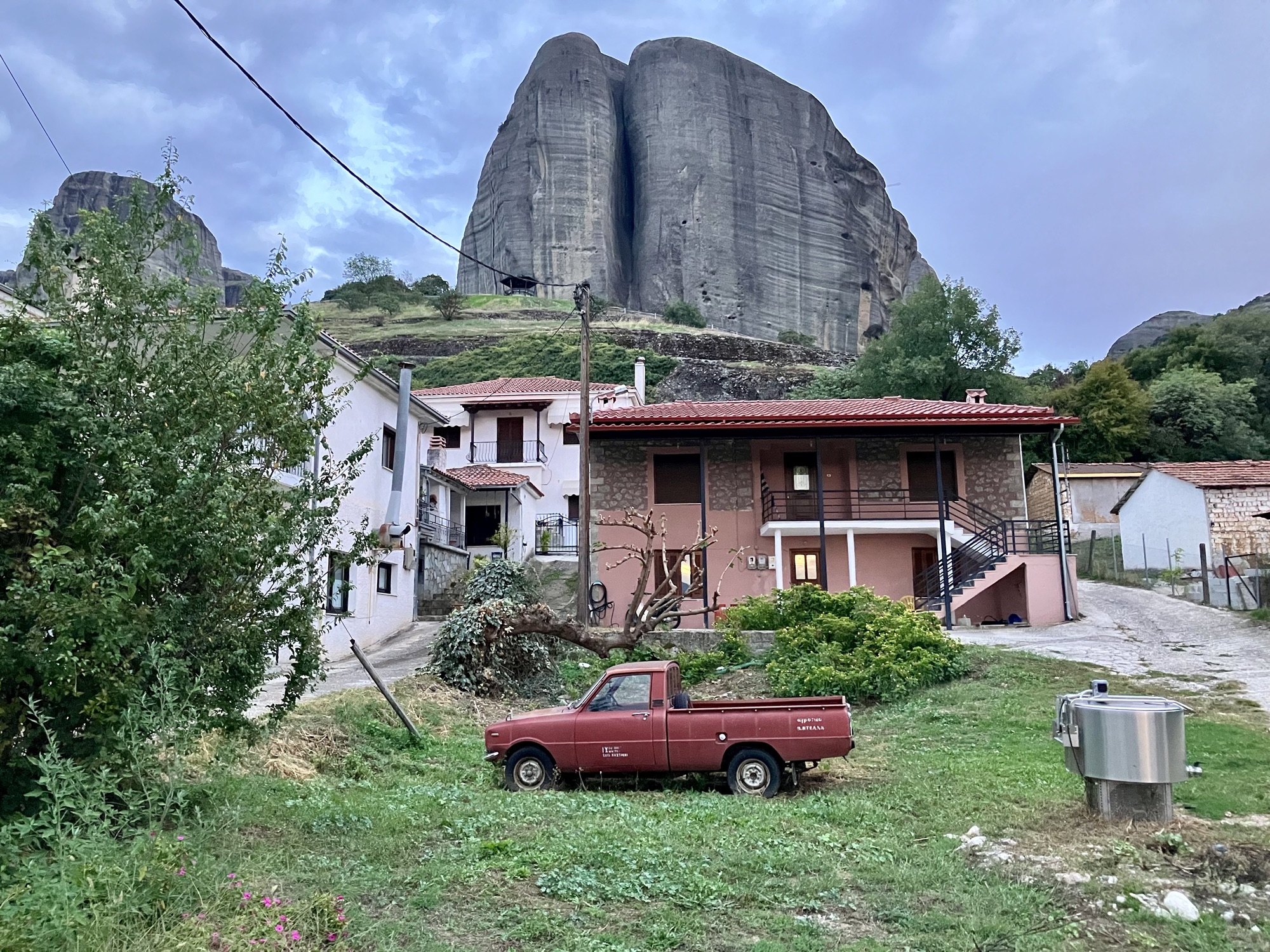 Auch wenn wir schon 2019 in Meteora waren, die Felsen mit den Klöstern sind so spektakulär, dass wir sie diesmal auch nicht auslassen wollten. Immerhin lag Meteora am Weg nach Nafpaktos. Wir nutzten die Gelegenheit mit dem Bock die kurvige Straße hoch zu fahren. Nachsaison und später Nachmittag waren besonders geeignet für ein beschwingtes Fahrvergnügen „himmelwärts“. Ich schreib deswegen himmelwärts, weil es wird gesagt, dass die Klöster so hoch auf den Felsen gebaut wurden, damit die Geistlichen WürdenträgerInnen näher bei Gott seien.