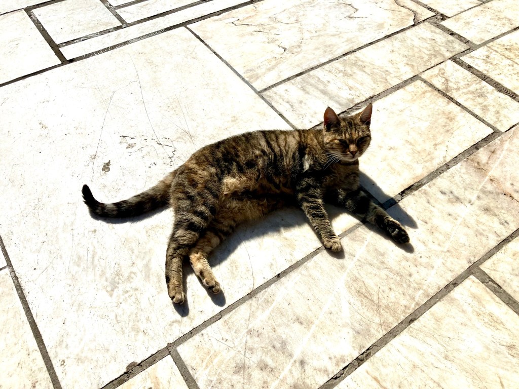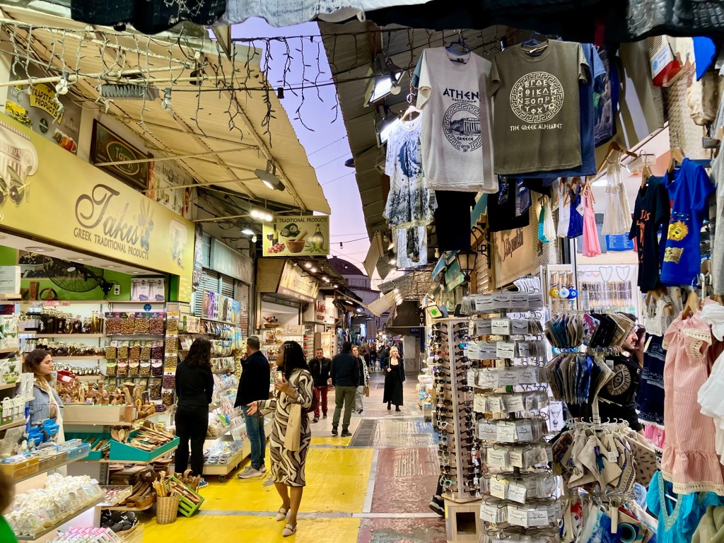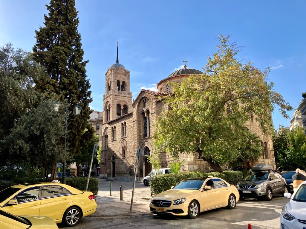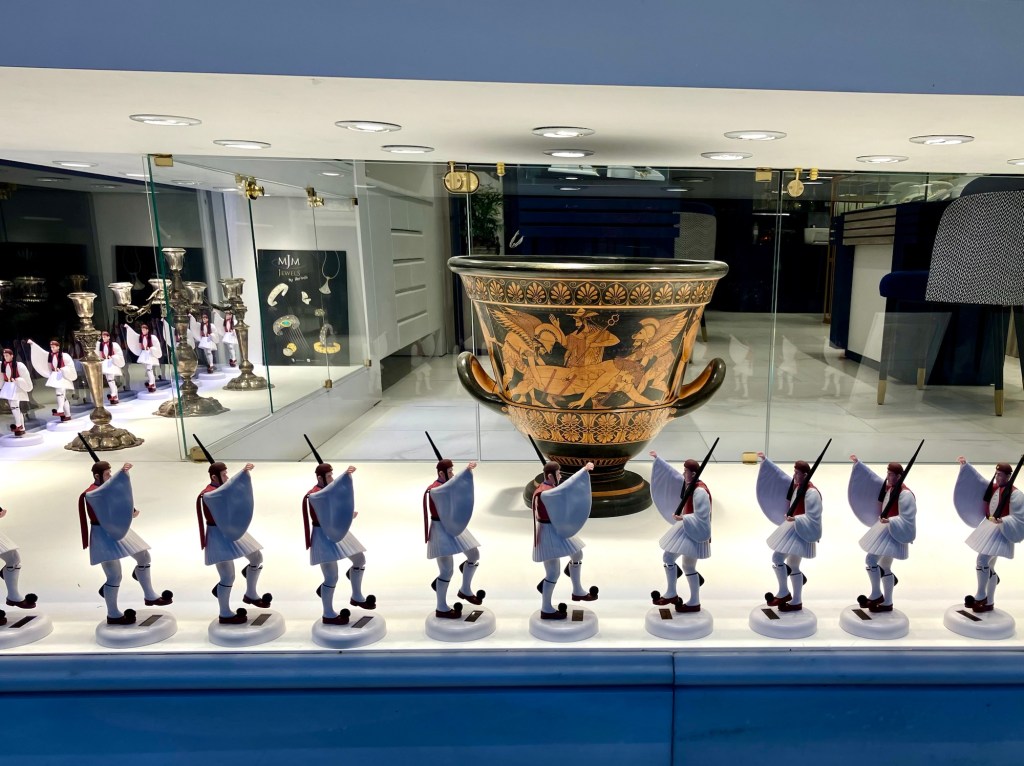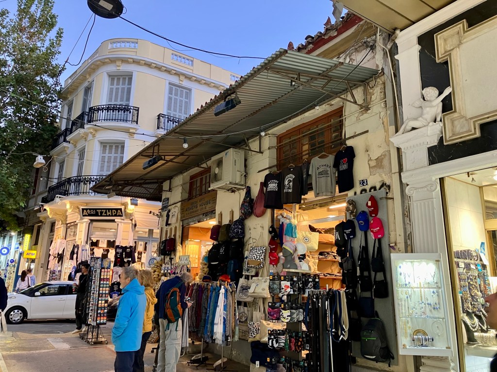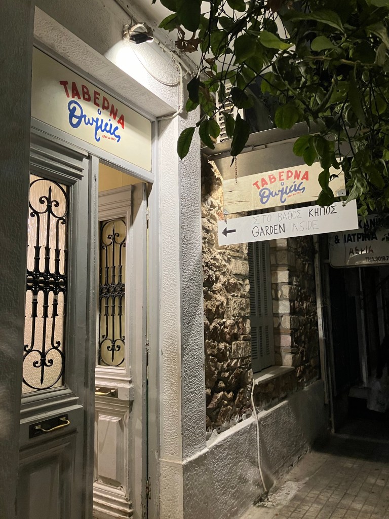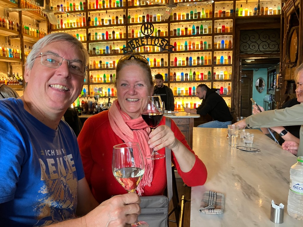 Das muss ich noch erzählen. Was wir in Athen nicht erwartet hatten, eine Taverne von anno dazumal, gleich um die Ecke von unserem Hotel. Die Möbel waren so alt wie der Großvater, der in der kleinen Wirtsstube aufgestützt auf seine Stock bei einem ziemlich voll geräumten Bürotisch saß. Das ganze Lokal war schon etwas in die Jahre gekommen würde man sagen. Die Dekoration war ganzjahrestauglich, glitzernde Weihnachtssterne klebten an den Fensterscheiben und Faschingsgirlanden ringelten sich um die Familienfotos an den Wänden. Irgendwo auf einem Hocker versammelten sich verschiedene Figuren, Plastikblumen und Püppchen. Wir wurden überschwänglich herzlich von der Wirtin empfangen. Elena kam vor 45 Jahren aus Eritrea von Ostafrika der Liebe wegen nach Griechenland, deswegen ist sie jetzt da und sie ist happy. Nach dieser kurzen Lebensgeschichte wurden wir gleich in die angrenzende Küche geschickt, wo der Patron mit seiner fast weissen Schürze seine gut gefüllten Kochtöpfe präsentierte. Was sollen wir nehmen, es sah alles so verlockend aus und es duftete so köstlich. Natürlich haben wir zu viel ausgesucht. Es hat alles so gut geschmeckt. Ziemlich satt verliessen wir die Taverne. Unglaublich, was für ein Überraschung, dass es so was noch gibt.