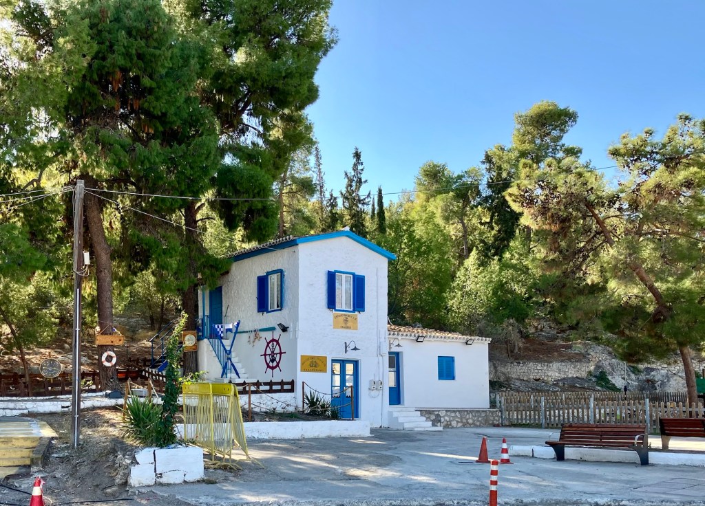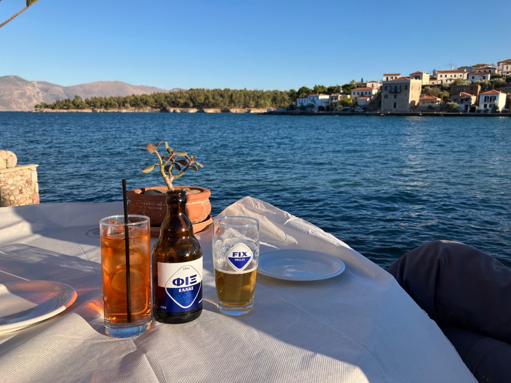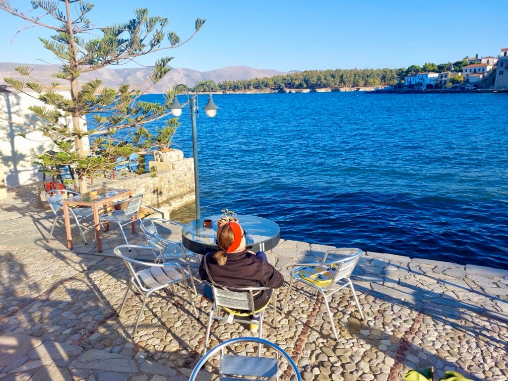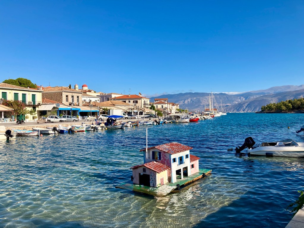 So ergab sich ein overnight Stopp in Galaxidi, einer kleinen Hafenstadt in der Nähe von Delphi. Bemerkenswert, dass es hier zwei Häfen gibt, einen kleinen und einen größeren. Obwohl für heutige Verhältnisse beide Häfen sehr klein sind. Besonders schön ist das Stadtbild, weil es aus alten Häusern besteht. Wie wir erfahren habe, kommen hier hauptsächlich griechische TouristInnen her, weil die alten Häuser seit Generationen in Familienbesitz sind. Es gibt eine baubehördliche Auflage, dass keine Hotels mit mehr als zwei Geschossen gebaut werden dürften. So hat es sich ergeben, dass viele alte Häuser und vor allem die Kapitänshäuser renoviert wurden. Man muss dazu erwähnen, dass im 18. und 19. Jahrhundert in Galaxidi eine der mächtigsten Handelsflotte des Mittelmeeres angesiedelt war, was für Wohlstand sorgte. Wir hatten uns in einem wunderschönen alten Haus am Rand des Ortes einquartiert und wollten zum Hafen gehen. Ein Stück weit kamen wir und dann übermannte uns bereits beim Art Liotrivi Cafe & Restaurant das Bedürfnis, einen Drink zu nehmen und die Stadtkulisse zu bewundern. Ein Drink, drei Ouzos, ein Bier des Tages! Vielleicht doch gleich hier was essen? So orderten wir nach und nach die Köstlichkeiten der handgeschriebenen Speisekarte. Nachdem wir auch den köstlichsten Orangenkuchen verputzt hatten, schlenderten wir gemächlich wieder zurück zum Hotel, ohne den zweiten Hafen überhaupt gesehen zu haben. Vor der Abreise holten wir das nach und fuhren mit dem Motorrad noch schnell zum zweiten Hafen.