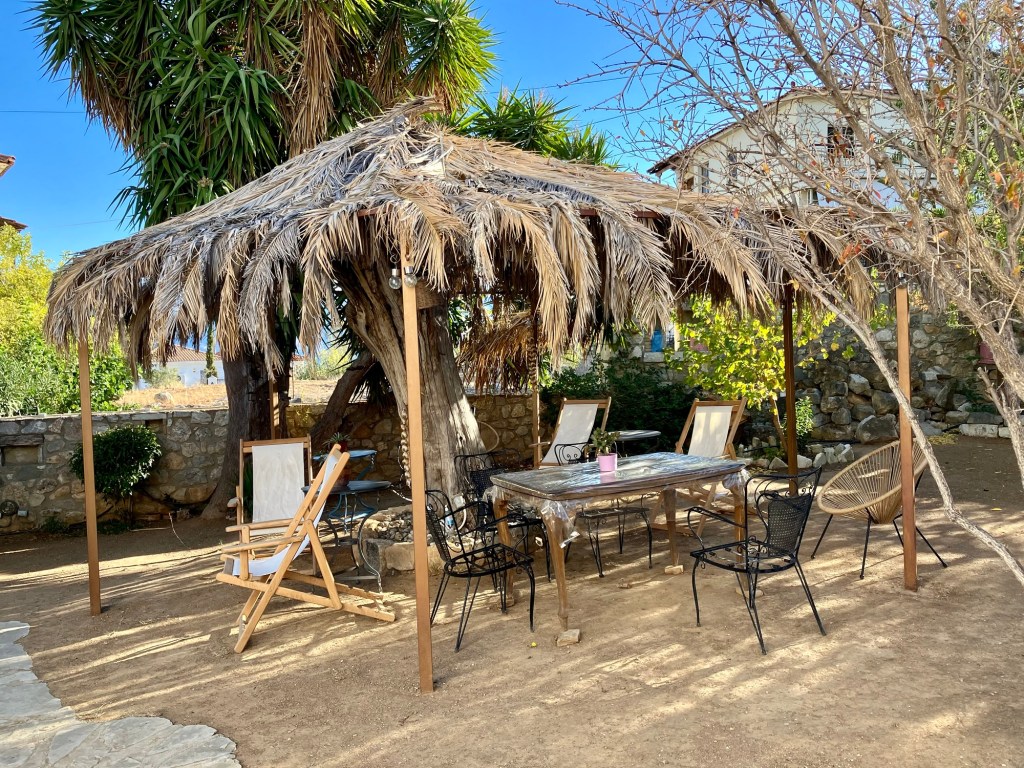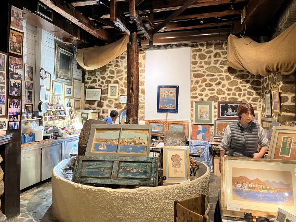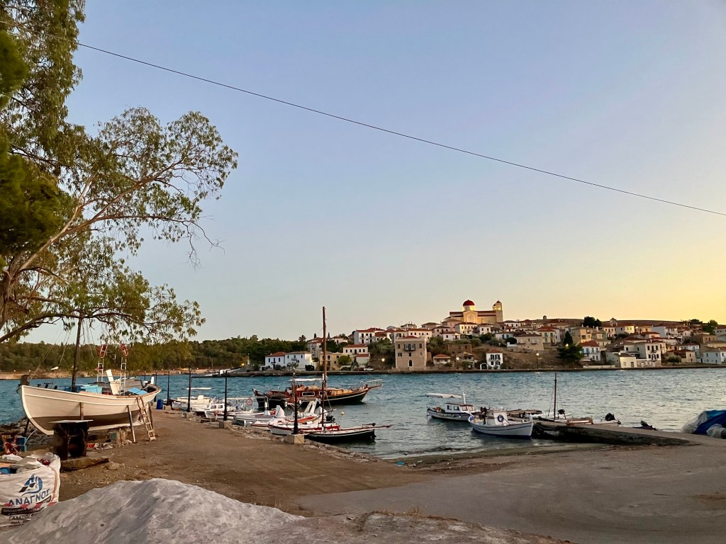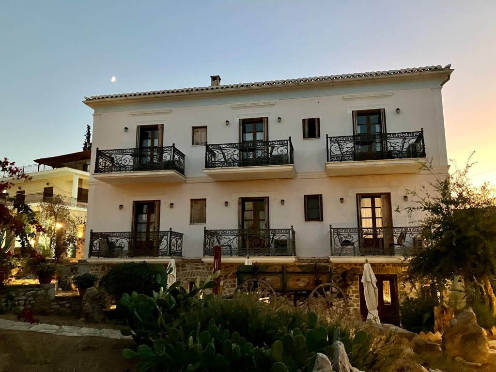 So ergab sich ein overnight Stopp in Galaxidi, einer kleinen Hafenstadt in der Nähe von Delphi. Bemerkenswert, dass es hier zwei Häfen gibt, einen kleinen und einen größeren. Obwohl für heutige Verhältnisse beide Häfen sehr klein sind. Besonders schön ist das Stadtbild, weil es aus alten Häusern besteht. Wie wir erfahren habe, kommen hier hauptsächlich griechische TouristInnen her, weil die alten Häuser seit Generationen in Familienbesitz sind. Es gibt eine baubehördliche Auflage, dass keine Hotels mit mehr als zwei Geschossen gebaut werden dürften. So hat es sich ergeben, dass viele alte Häuser und vor allem die Kapitänshäuser renoviert wurden. Man muss dazu erwähnen, dass im 18. und 19. Jahrhundert in Galaxidi eine der mächtigsten Handelsflotte des Mittelmeeres angesiedelt war, was für Wohlstand sorgte. Wir hatten uns in einem wunderschönen alten Haus am Rand des Ortes einquartiert und wollten zum Hafen gehen. Ein Stück weit kamen wir und dann übermannte uns bereits beim Art Liotrivi Cafe & Restaurant das Bedürfnis, einen Drink zu nehmen und die Stadtkulisse zu bewundern. Ein Drink, drei Ouzos, ein Bier des Tages! Vielleicht doch gleich hier was essen? So orderten wir nach und nach die Köstlichkeiten der handgeschriebenen Speisekarte. Nachdem wir auch den köstlichsten Orangenkuchen verputzt hatten, schlenderten wir gemächlich wieder zurück zum Hotel, ohne den zweiten Hafen überhaupt gesehen zu haben. Vor der Abreise holten wir das nach und fuhren mit dem Motorrad noch schnell zum zweiten Hafen.