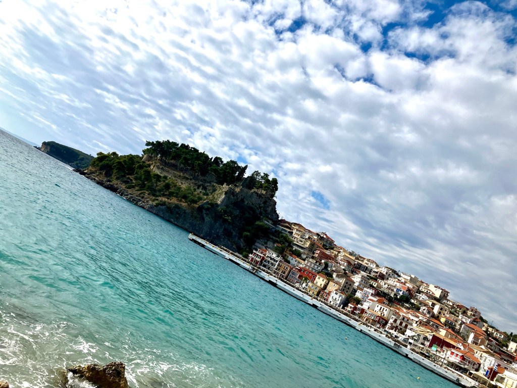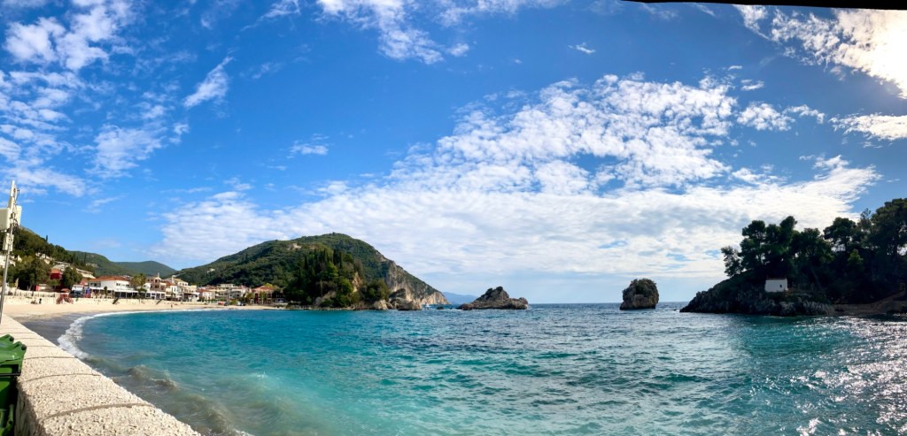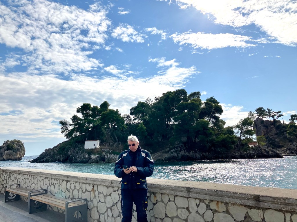 Die Zeit tickte! Auf Grund des angesagten schlechten Wetters hatten wir uns entschieden, doch die frühere Fähre nach Venedig zu nehmen. Wir packten alles zusammen und suchten eine nette Strecke. Der Himmel war schon leicht eingetrübt, die WetterApp dürfte richtig prognostiziert haben. War da nicht Parga angeschrieben? Ja! Wir könnten es den Reisenden* Rüdiger, Antonia, Martin und Anne, nachmachen, die vor 48 Jahren ihre Reise nach Griechenland auch hier quasi beendeten, bevor es nach Igoumenitsa zur Fähre ging.