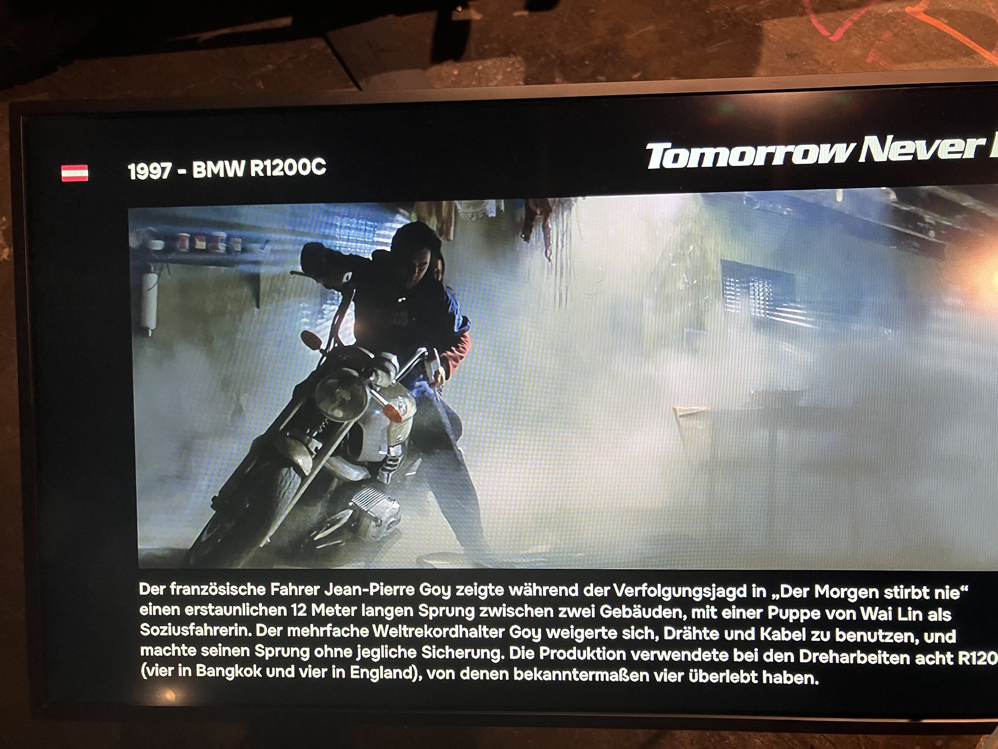 Weitere Wochen vergingen! Keine Chance auf eine baldige Rückkehr des Bocks! Also trösteten wir uns mit einem Besuch bei 007. Immerhin waren bei der James Bond Ausstellung coole Stunts zu sehen und die von den verschieden 007er gefahren Bikes konnten hautnahe besichtigt werden.
