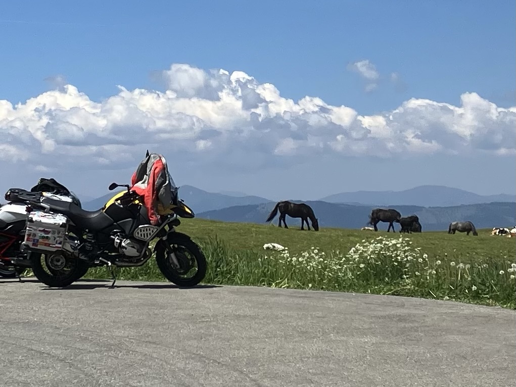 Bei der Weiterfahrt gab es dann noch einen kurzen Abstecher zu einem Zielpunkt vom heurigen Pässemarathon. Wir fahren 2025 zwar nicht in der Sieger-Wertung mit, aber sollte sich ein Zielpunkt auf unseren Strecken befinden, so machen wir ein Foto und reichen es ein. Wie schon in den vergangenen Jahren berichtet, sind immer Ziele dabei, die man so nicht kennt. Der Hocheggersattel war zwar keine große Offenbarung, aber Dabei-sein macht Spass (auch wenns nur ein bisschen Mit-fahren ist 😉 ).