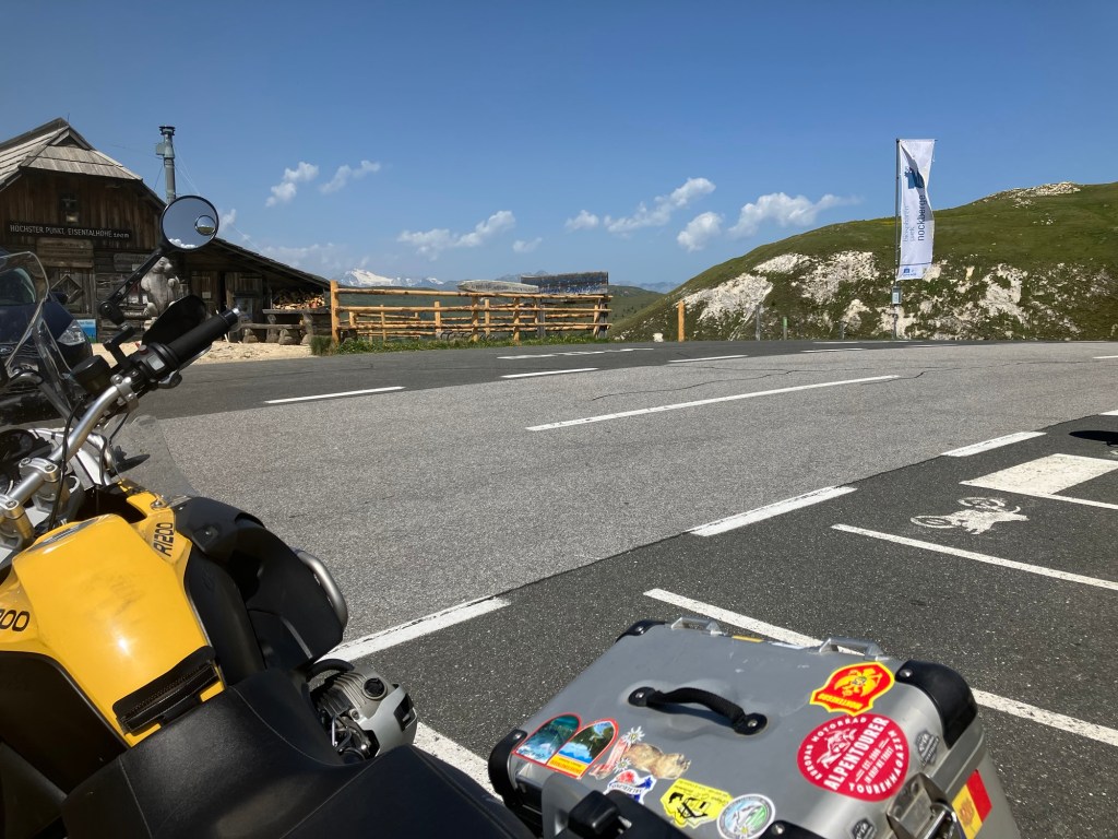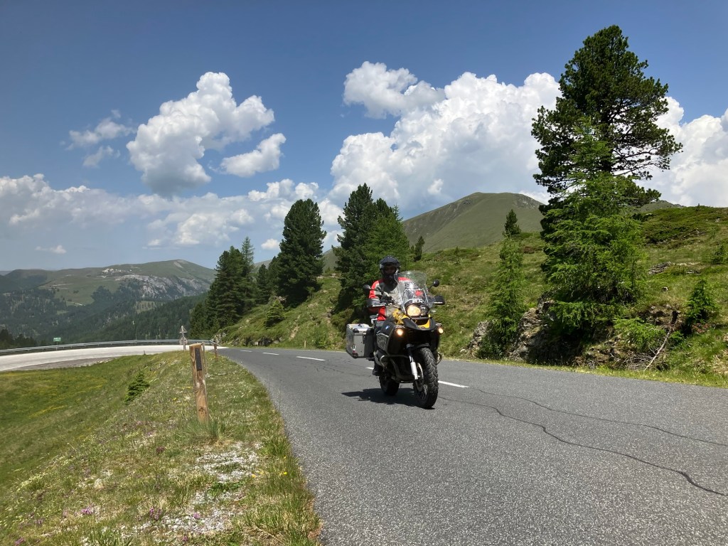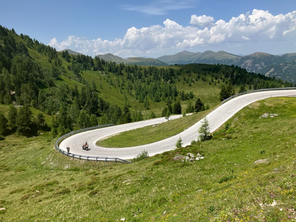 Nun, jetzt sind wir in Kärnten und erfreuen uns an der Schönheit der Natur in den Bergen. Eine der schönsten Bergstraßen (die ich kenne) ist die Nockalm-Höhenstraße zwischen Reichenau und Innerkrems. Mit 52 Kehren (Reidn in der Landessprachen) schlängelt sich die 35 km lange Straße rauf und wieder runter. Bei der Eisentalerhöhe auf 2042m ist der schönste Ausblick. Bei klarem Wetter (das hatten wir) kann man den Großglockner sehen. Gleichzeitig befindet sich dort der „Bikers Point“. Jeder der sich die Strecke hoch kurvelt bleibt hier stehen. Hier trifft man Fahrer und Fahrerinnen verschiedenster Nationen, die sich diesen Fahrspass nicht entgehen lassen, wenn sie in Österreich sind. So lernten wir einen „Lonely Rider“ aus Griechenland kennen. Er fuhr das gleiche BMW Modell, wie unser alter roter Bock. Mittlerweile hat sein BMW-Bike schon 300.000 km am Tacho, beachtlich. Da besteht Hoffnung, das unser gelber Bock auch noch lange hält. Wir unterhielten uns über seine Reisen in ferne Länder, die uns noch fehlen auf der Bucketlist, sowie über unsere Tour letztes Jahr in Griechenland. Ausserdem gab er informative Tipps zur Ersatzteilbeschaffung für BMW Motorräder. Sympathischer Typ, Theodoros aus Athen. Wir würden uns über ein Wiedersehen freuen. Die Kontakte haben wir auf alle Fälle ausgetauscht.
