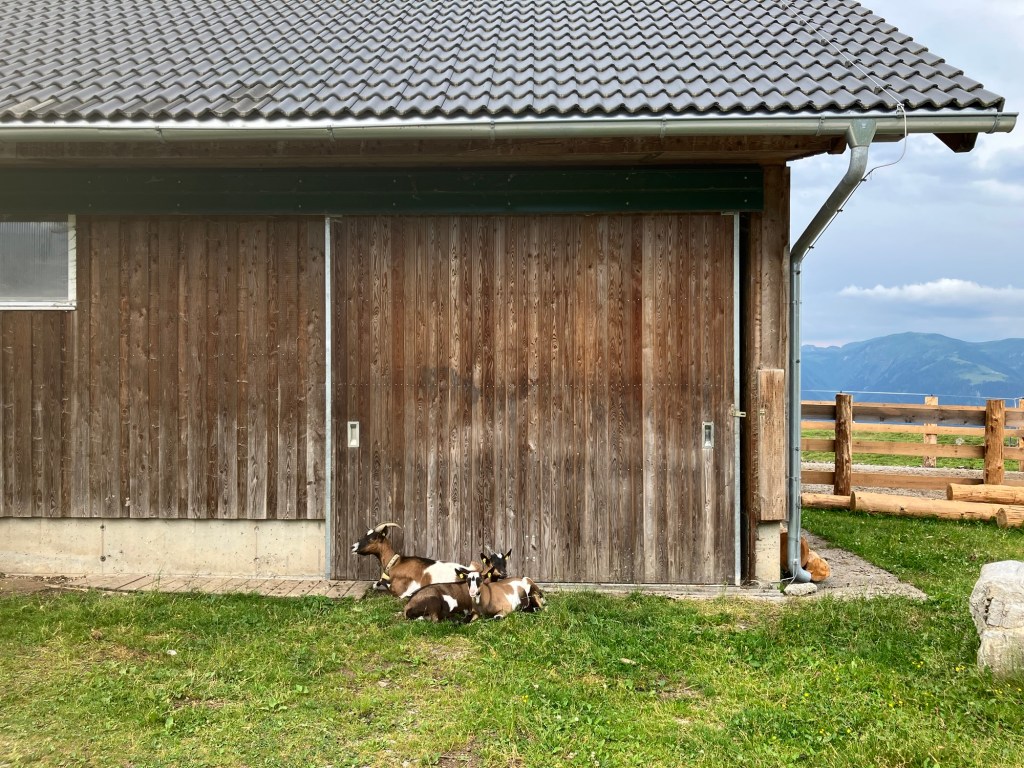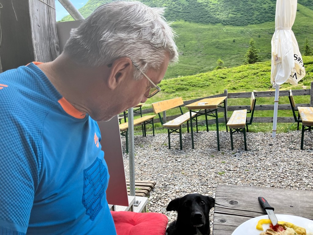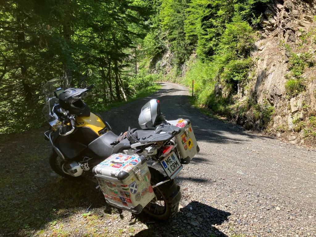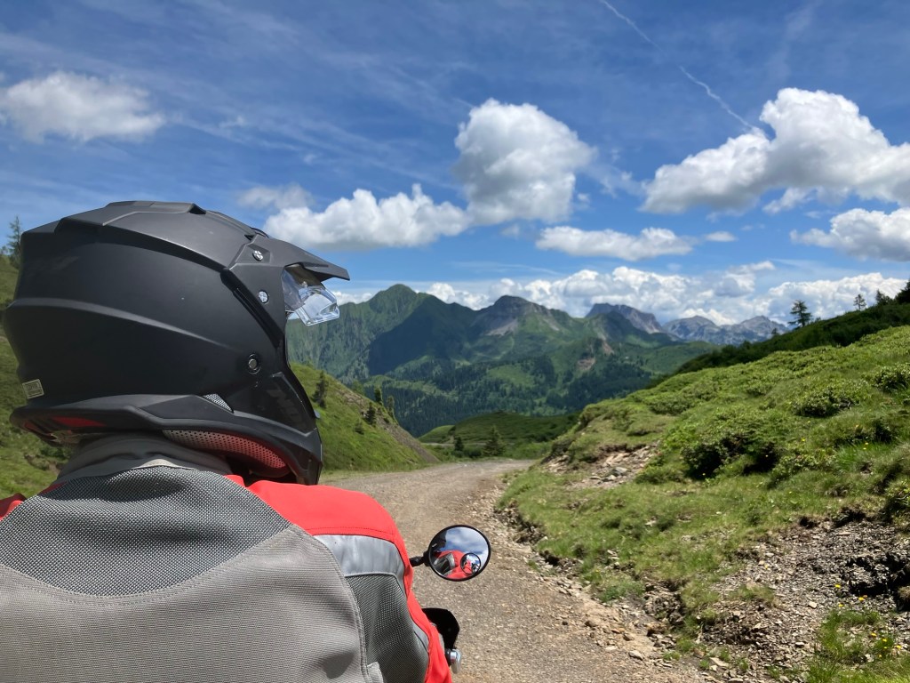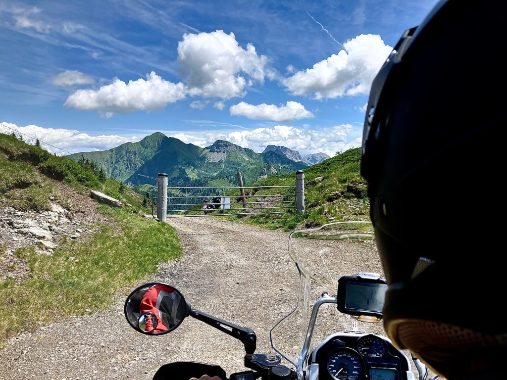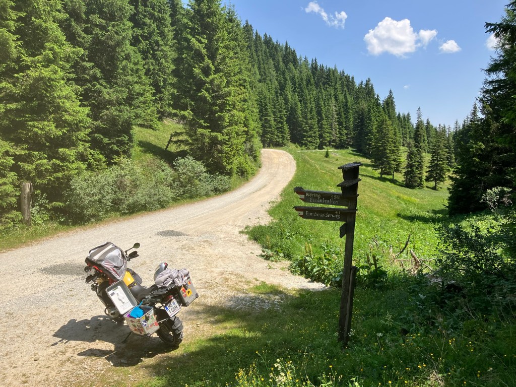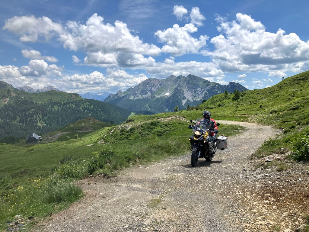 Auf dieser Tour höppelten wir 10km auf dem schottrigen Nöringsattel retour. Unsere nächste Etappe war schon etwas anspruchsvoller, mit 56km auf der Schotterpiste (hin/retour Einstieg Goderschach) – die Straninger Alm und weiter zur Waidegger-Alm. Von dort könnte man auch weiter nach Italien fahren. Unsere Freundin, die große schwarze Wolke, baute sich über den italienischen Bergkämmen auf und hinderte uns daran, den Abstecher nach bella Italia zu wagen. Ausserdem hatten wir bei den vielen sonnigen Tagen einfach darauf vergessen Regenzeug einzupacken. In den Bergen in ein Gewitter zu kommen, das wollten wir nicht riskieren, noch dazu auf unbefestigten Wegen. So suchten wir uns für den Tag noch ein etwas leichteres Ziel in der andere Richtung aus. Wir landeten auf der Jochalm, 40km Schotterpiste (hin/retour Einstieg Reisach). Mit einem Wow-Ausblick auf 1575m, könnte das ein Lieblingsplatzerl werden. Wir müssen unbedingt wieder kommen, dachten wir. Ein paar Tage später waren wir tatsächlich Wiederholungstäter und rauschten nochmals zur Jochalm rauf. Davor kämpften wir uns offroadig 56km (hin/retour Einstieg Weidenburg) zur Zollnerseealm auf 1741m hoch. Es erwartete uns ebenso ein genialer Ausblick, diesmal in Richtung Waidegger Alm. Bei der Almjause wurde der Bockchef schwach und teilte seine Hirschwurst mit seinem neuen pelzigen Freund; wie großzügig von ihm. Insgesamt waren wir bei den Almen-Touren ca. 220km auf schottrigem Grund und kurvigem Terrain unterwegs. Unser Resümee: wir müssen unbedingt wieder kommen und die anderen legal befahrbaren Almen erkunden, bevor auch hier die Fahrverbote aufgestellt werden.