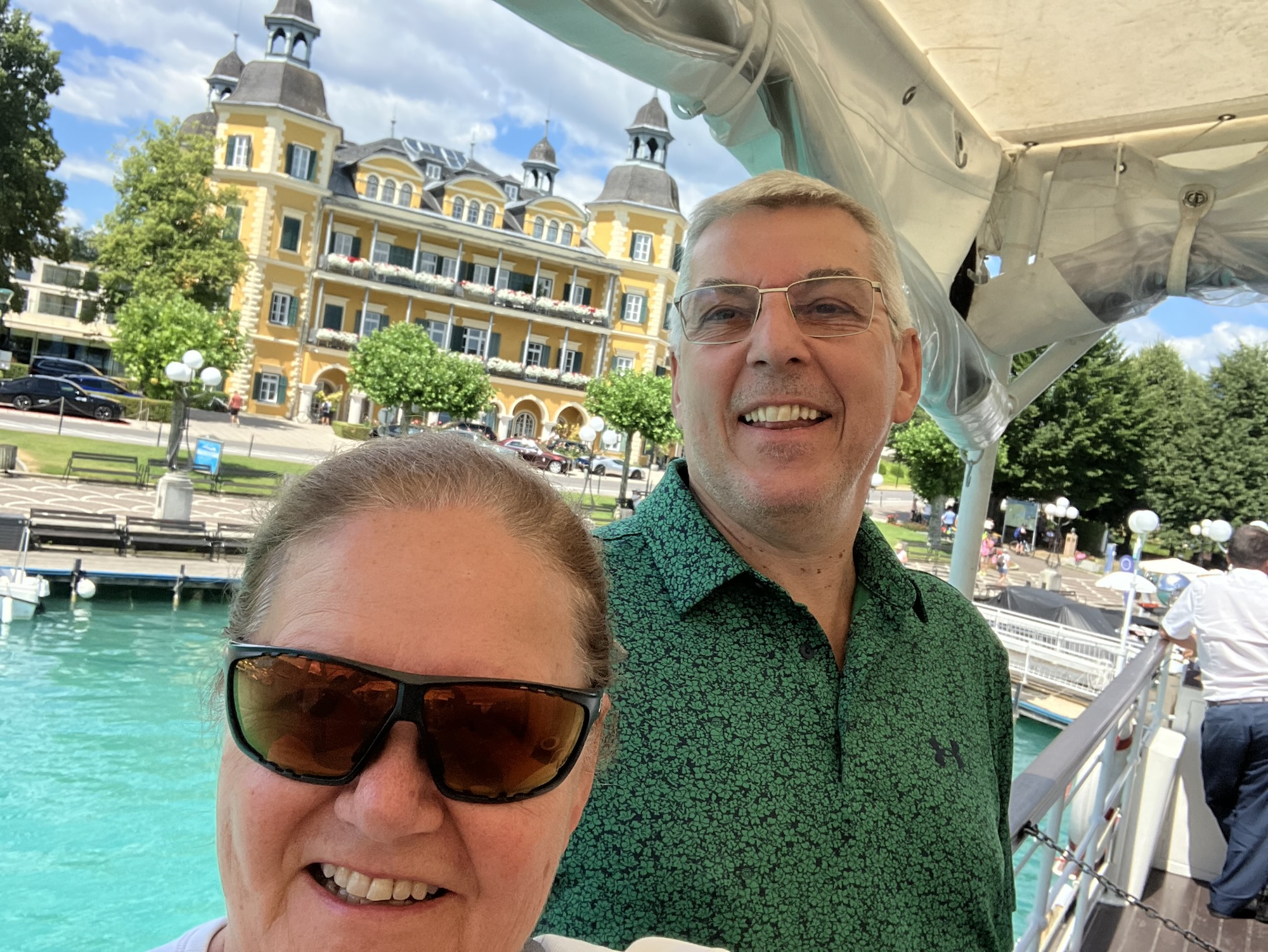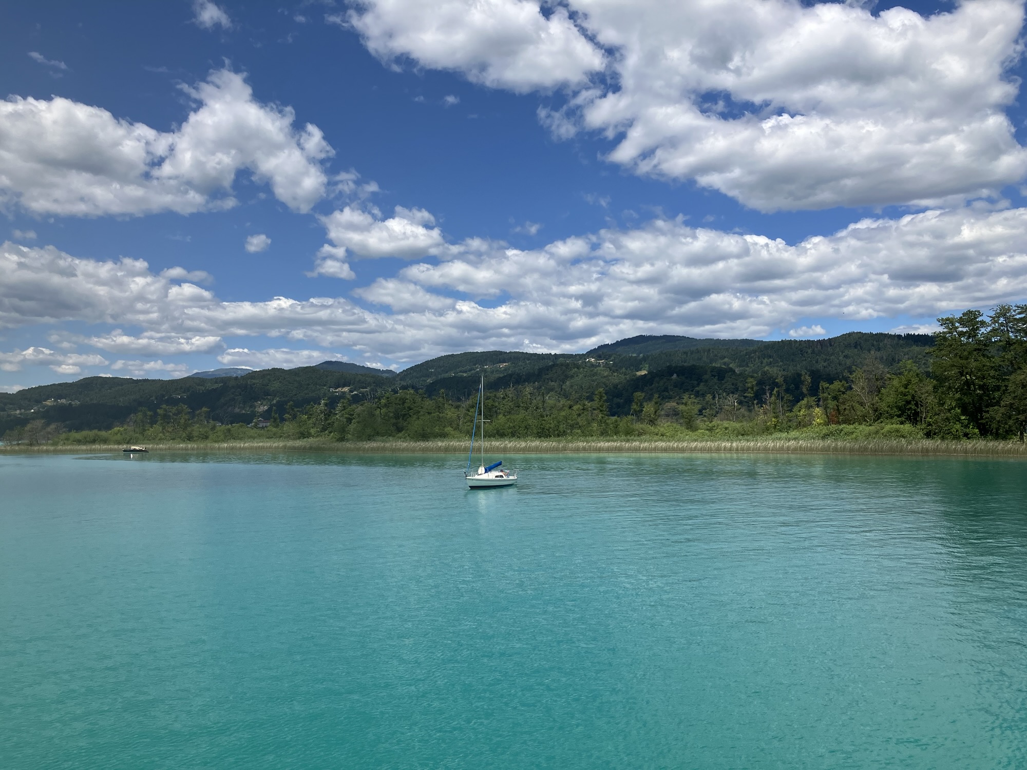 Am Wochenende zogen wir es jedoch vor, eine Fahrpause vom Motorrad einzulegen. Wir stiegen auf das Linienboot der Wörtherseeschifffahrtsgesellschaft um. Bei einer Rundfahrt bis nach Velden und zurück liessen wir uns mit einem Frühstück verwöhnen. Quasi zum Frühschoppen gab es dann am Schiff eine Weinverkostung mit süffigem Wein aus dem Burgenland und einer leichten Brise. Über den Bordlautsprecher wurden die Sehenswürdigkeiten an den Anlegestellen informativ beschrieben. Alles in allem eine sehr entspannte Bootsfahrt bei einer Aussentemperatur von 35 Grad und anschliessend gab es wieder Badevergnügen bei einer ungewöhnlichen Wassertemperatur von 28 Grad. Erfrischend war es trotzdem.