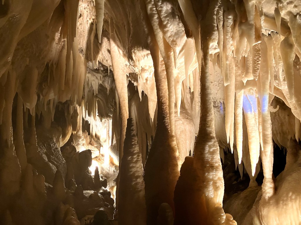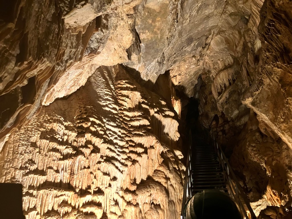 Einen weiteren tatsächlich coolen Tipp für einen Ausflug hatten wir von meinem Bruder bekommen. Die Obir Tropfsteinhöhle bei Bad Eisenkappel wäre unbedingt einen Besuch wert. Das passte gut in unser Fahrprogramm, da wir sowieso einen Abstecher zur „schottrigen“ Panoramastraße in Slowenien geplant hatten. Somit lag das auf der Strecke. Die Anreise mit dem Motorrad war heiss. Bei Büro im Ortszentrum von Bad Eisenkappel bestiegen wir den Zubringerbus, denn die Auffahrt zum Höhleneingang auf 1078 m ist mit Privatfahrzeugen nicht gestattet. Nach einer halbstündigen Busfahrt startete unsere Tour in die 200 Millionen alte Höhle. Wir kletterten 600 Stufen rauf und runter auf der ca. 1 km langen Tour durch die Bergstollen. Die Stollen wurden für den Bergbau genutzt. Unter sehr schwierigen Bedingungen unter Tage wurden verschiedene Erze abgebaut. Bei einer Sprengung zum Vortrieb des Markus-Stollens wurde 1870 die Tropfsteinhöhle entdeckt. Ich bin mir sicher, dass die bizarren Gebilde die Bergarbeiter auch damals beeindruckt haben. Jedoch zählten die Bergbaugewinne mehr und die Höhlen wurden mit dem Abraum aus dem Bergbau zugeschüttet. Erst 1987 begann man die Höhle für den Tourismus zu erschliessen und 1991 fand die Eröffnung statt. Wir waren froh, dass wir mit unsere Motorradmontur in den Gängen bei einer konstanten Temperatur von 8 Grad unterwegs waren. Hier noch ein paar Impressionen zu den wundersamen Millionen Jahre alten geologischen Schöpfungen der Natur.