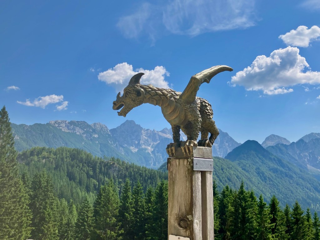 Die Abkühlung von der Tropfsteinhöhle hielt nicht lange, denn bei der Weiterfahrt über den Paulitschsattel zum Slowenien-Abstecher wehte schon wieder ein heisses Lüftchen beim Helm rein. Die Solcava-Panoramastraße ist ein idyllischer Güterweg in den Karnischen Alpen vorbei an entlegenen Gehöften. Und eben dort sind wir auf den Lintver gestoßen, einen sagenumwobenen Drachen, der angeblich den Tieren der Bauern und den Menschen auflauerte. Und es heisst, dass weder die schrecklichen Wetterereignisse in den Bergen noch der feuerspeiende Drache die hart arbeitenden Bauern einschüchtern und vertreiben konnte. Wir waren nicht so hart gesotten, wie die Bergbauern Sloweniens, wir liessen uns von der großen schwarzen Wolke über den Seebergsattel zurück nach Kärnten treiben. Und dann ging es bei wolkenfreiem Himmel wieder ab ins kühle Nass in den Wörthersee.