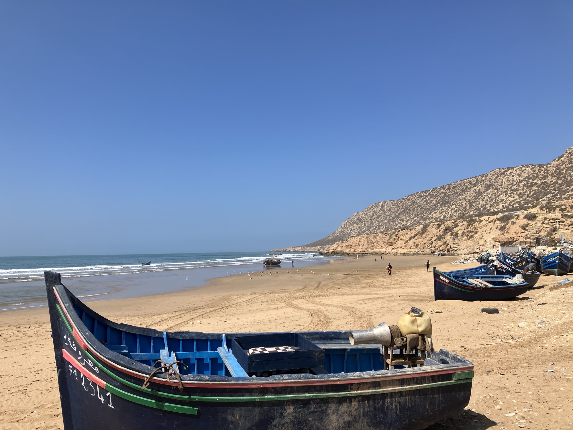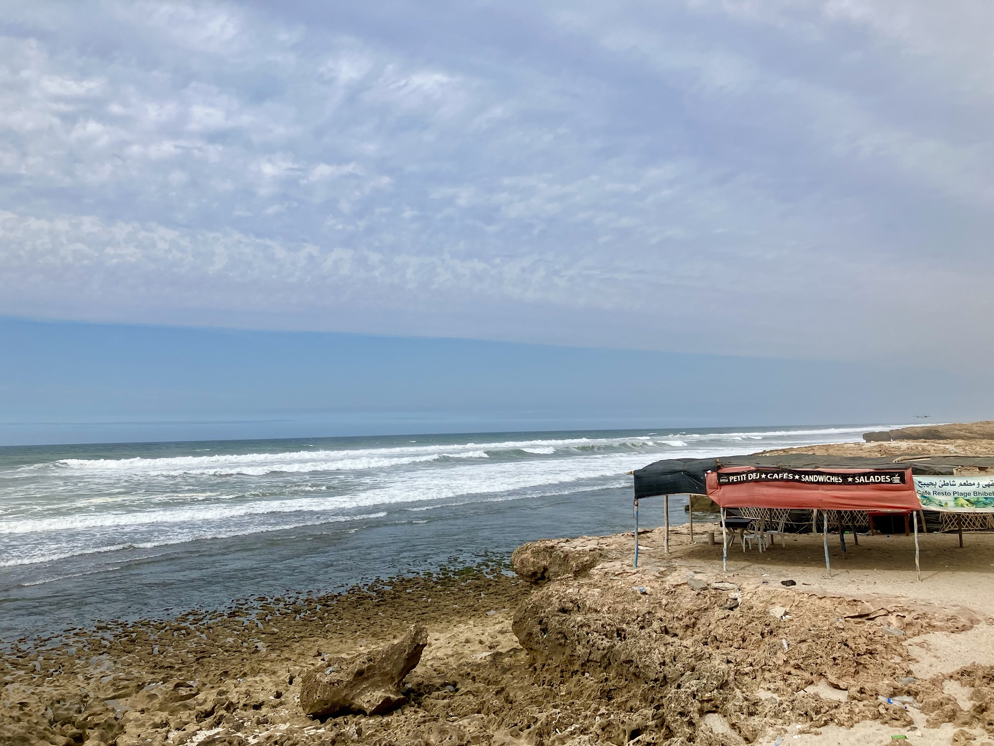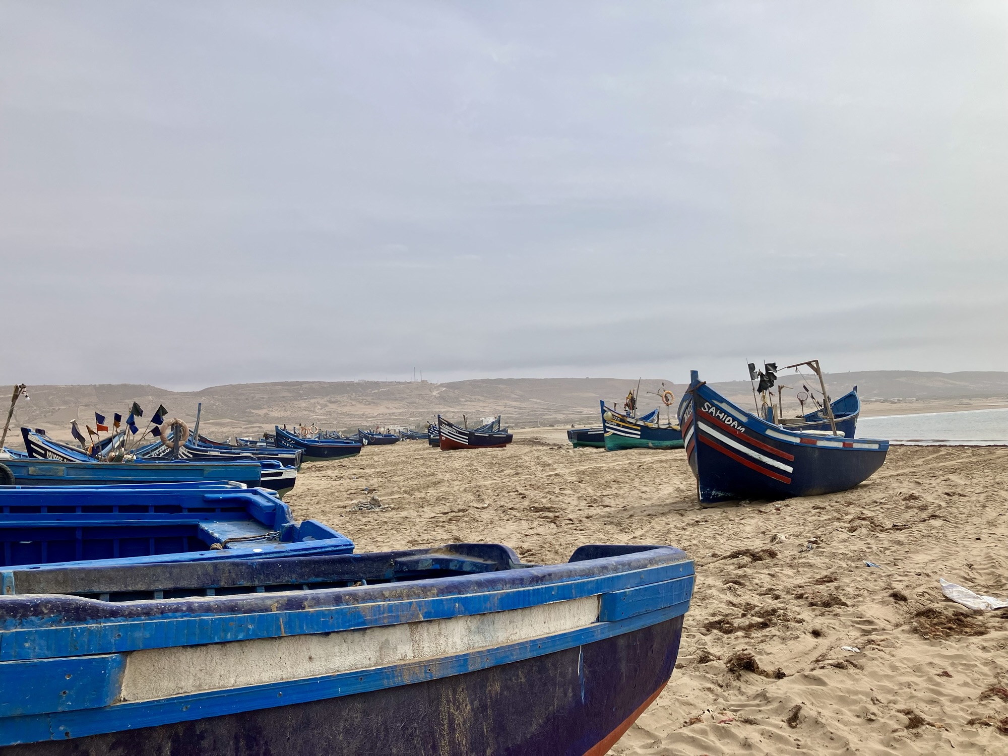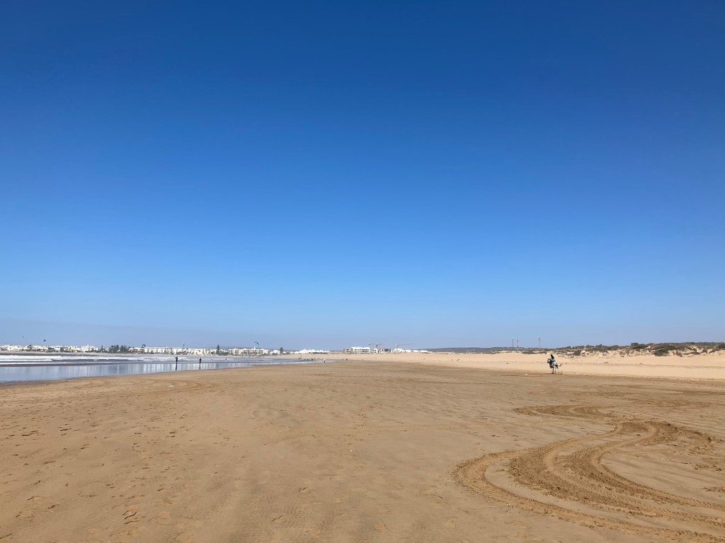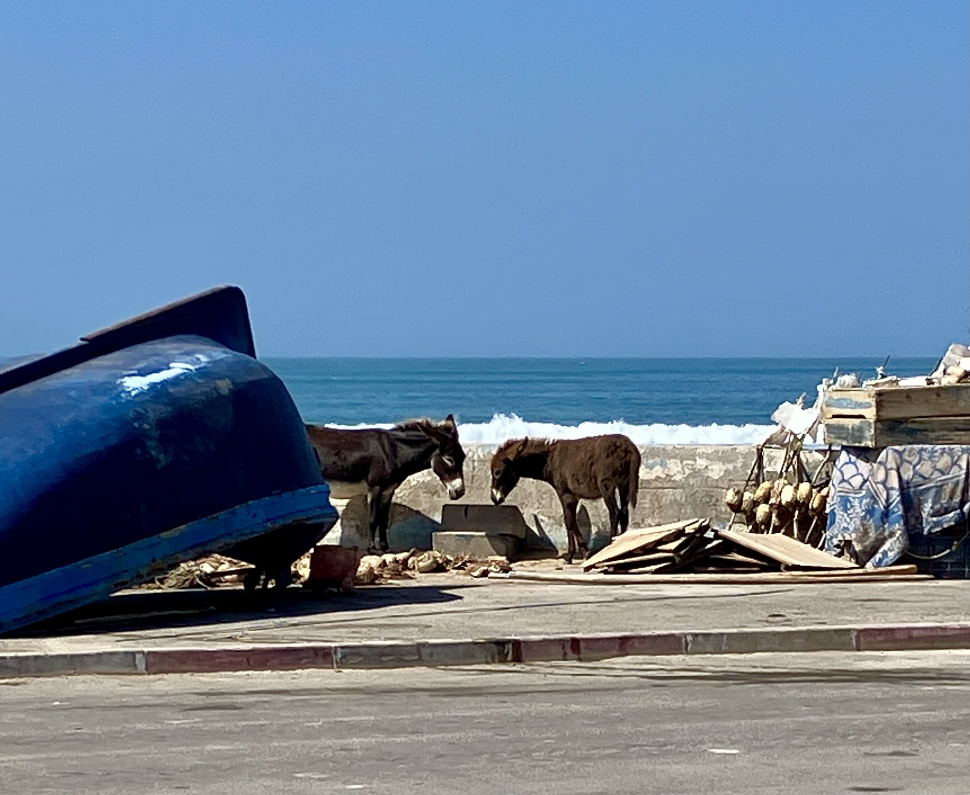 Bei dichtem Nebel und leichtem Regen ging es weiter an der Küste entlang südwärts. Ich reservierte ein Zimmer in einem Mini-Hotel im kleinen Ort Diabat unweit von Essaouira. Dass in unserem Hotel 1969 Jimi Hendrix gewohnt hat, wusste ich bei der Buchung nicht. Mit Janis Joplin und den Stones wurden damals ausgelassene Partys am Strand von Diabat gefeiert. Noch immer zieht Essaouira – die Perle am Atlantik mit Hippi-Flair – viele Künstler an. Galerien und Kunsthandwerk prägen die Gassen der Altstadt. Natürlich darf der orientalische Markt mit Obst, Gemüse, Gewürzen, Fisch und Fleisch nicht fehlen. Über den Hund, der sich beim Fleischhändler in der Schlange anstellte, mussten wir lachen – der war so witzig. Was Essaouira sehr sympathisch machte, dass die Händler nicht aufdringlich waren. Und der Bock-Chef bekam sogar ein Bier (nach Tagen der Enthaltsamkeit) im Strand- Café. Der Ort lebt vom Tourismus. Am Kilometer langem Sandstrand wetteifern die Anbieter von Touren mit Dromedaren, Pferden oder Quads. Wind geht hier immer, speziell nachmittags lockt er die Surfer ans Meer.