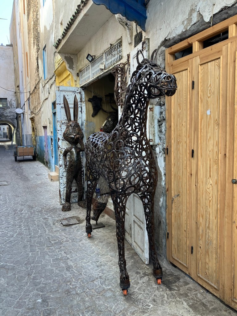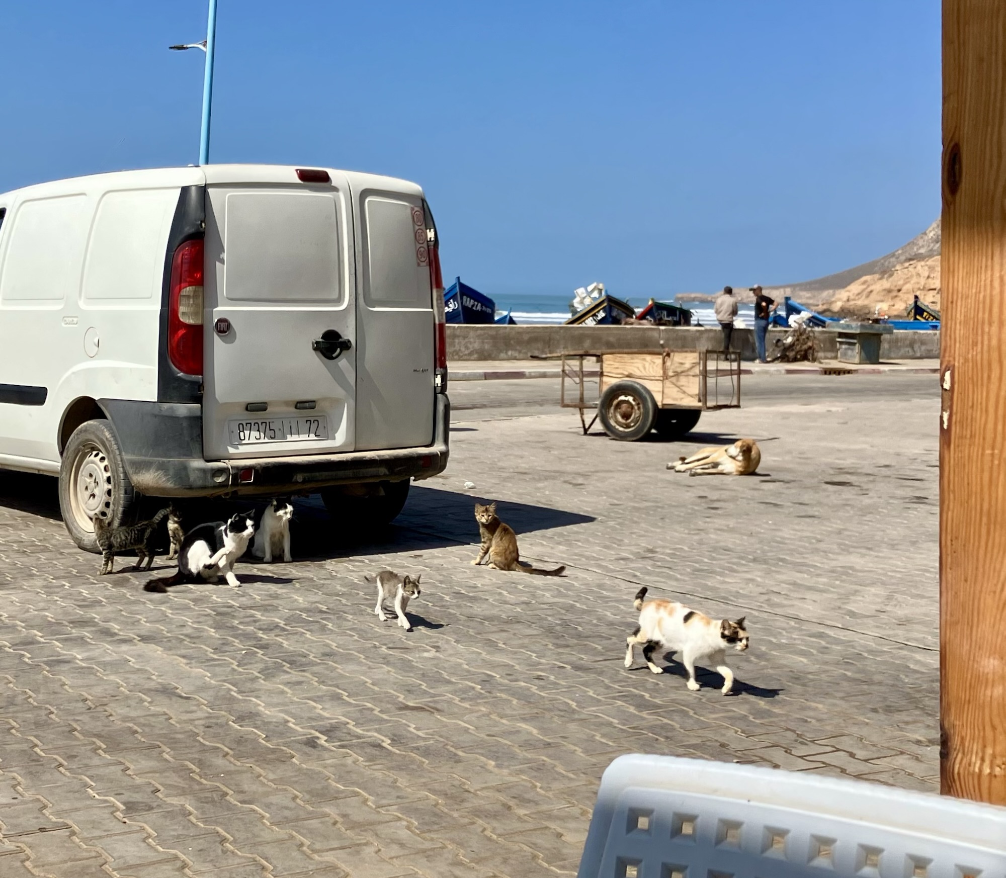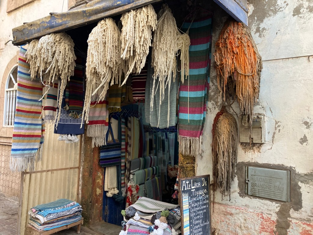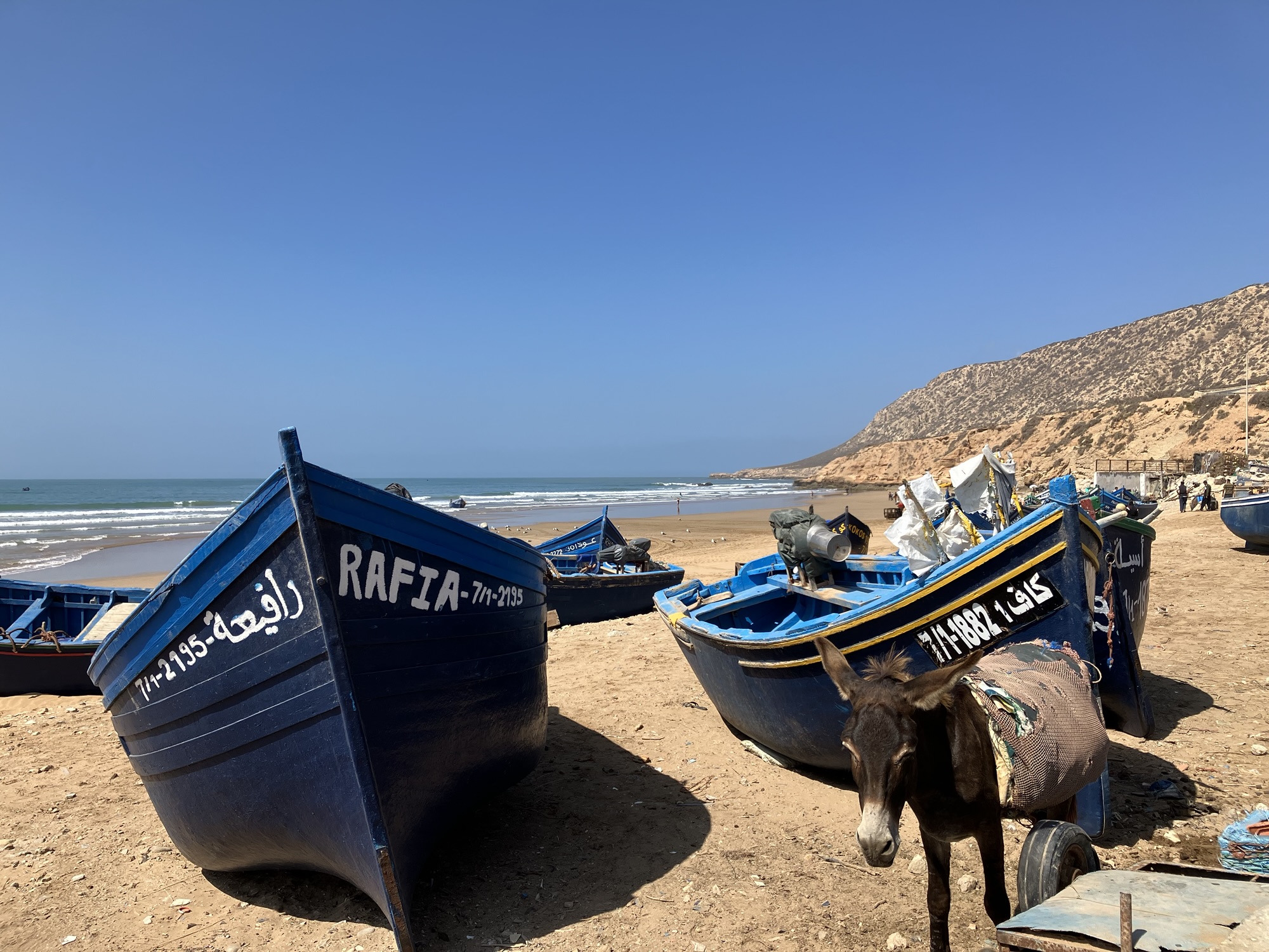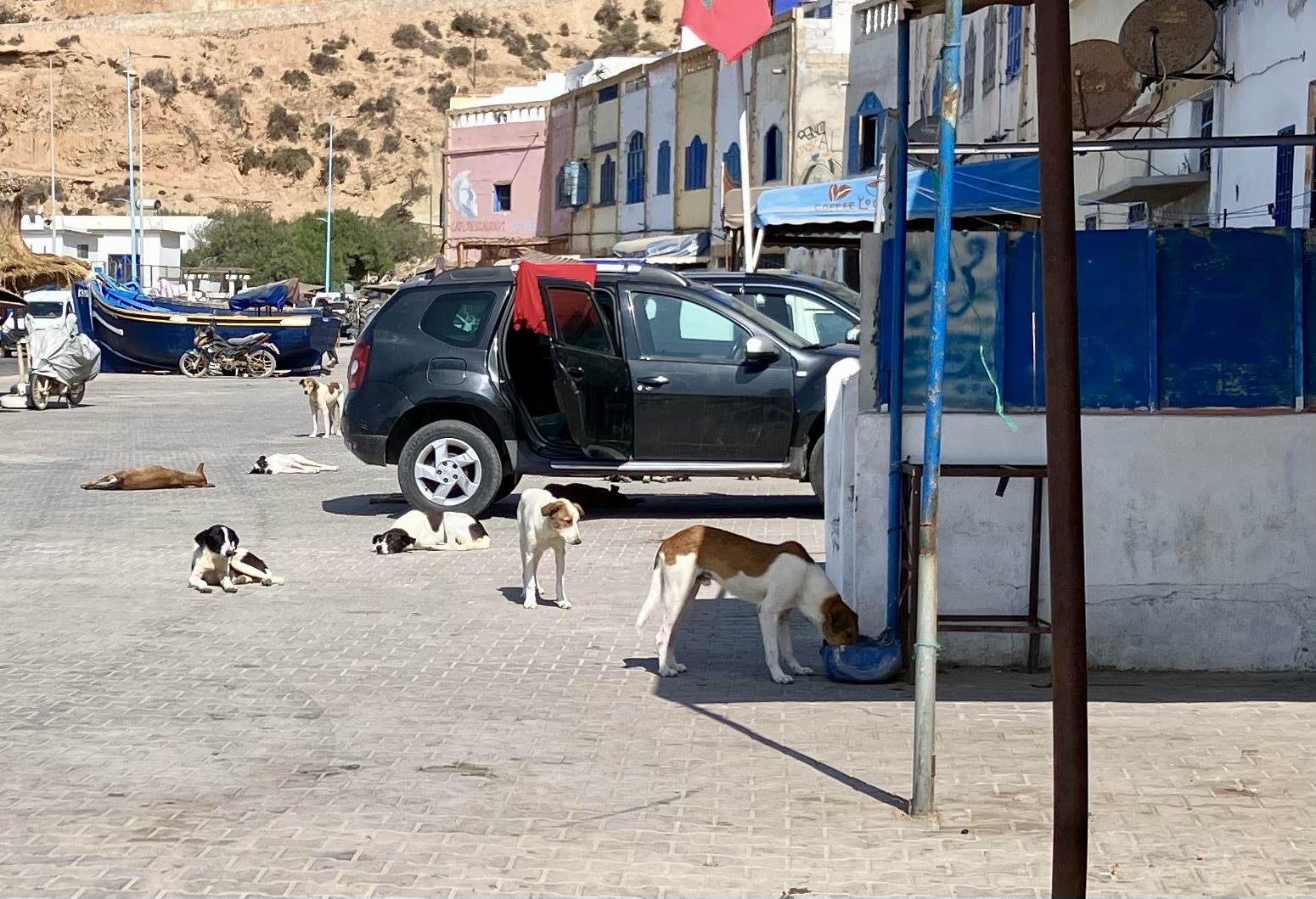 Bei dichtem Nebel und leichtem Regen ging es weiter an der Küste entlang südwärts. Ich reservierte ein Zimmer in einem Mini-Hotel im kleinen Ort Diabat unweit von Essaouira. Dass in unserem Hotel 1969 Jimi Hendrix gewohnt hat, wusste ich bei der Buchung nicht. Mit Janis Joplin und den Stones wurden damals ausgelassene Partys am Strand von Diabat gefeiert. Noch immer zieht Essaouira – die Perle am Atlantik mit Hippi-Flair – viele Künstler an. Galerien und Kunsthandwerk prägen die Gassen der Altstadt. Natürlich darf der orientalische Markt mit Obst, Gemüse, Gewürzen, Fisch und Fleisch nicht fehlen. Über den Hund, der sich beim Fleischhändler in der Schlange anstellte, mussten wir lachen – der war so witzig. Was Essaouira sehr sympathisch machte, dass die Händler nicht aufdringlich waren. Und der Bock-Chef bekam sogar ein Bier (nach Tagen der Enthaltsamkeit) im Strand- Café. Der Ort lebt vom Tourismus. Am Kilometer langem Sandstrand wetteifern die Anbieter von Touren mit Dromedaren, Pferden oder Quads. Wind geht hier immer, speziell nachmittags lockt er die Surfer ans Meer.