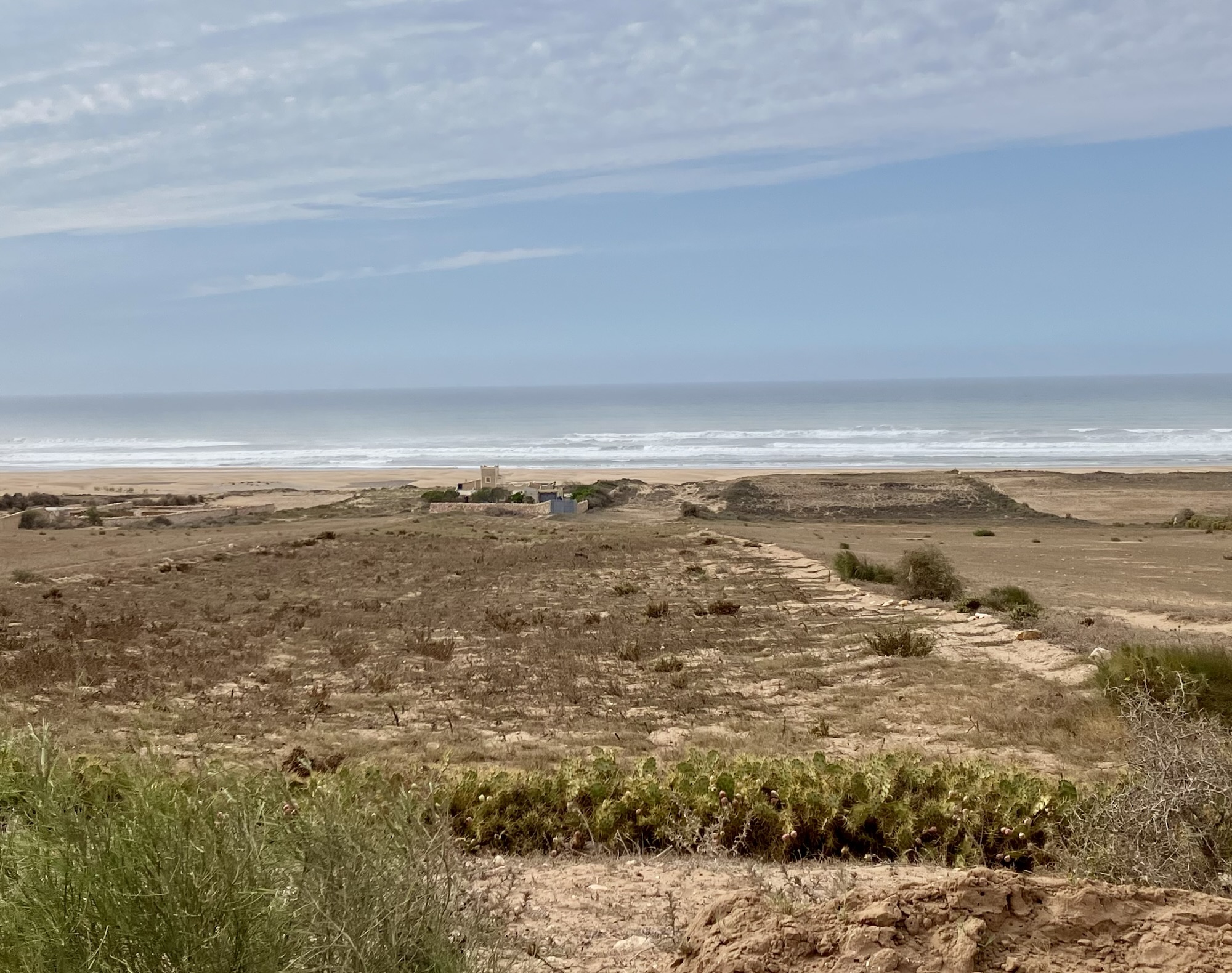 Gleich daneben liegt die vierspurige Straße entlang der Corniche-Promenade. Unsere Erwartungen und die marokkanische Realität gehen manchmal etwas auseinander. So steuerten wir wieder landeinwärts, in der Hoffnung, dort etwas besser voranzukommen. In dichtem Verkehr rollten wir durch im Bau befindliche Satellitenstädte, vorbei an vermüllten Feldern, staubigen Marktständen und durch Baustellen. Irgendwann reichte es dem Bock-Chef und wir bogen wieder in Richtung Meer ab. Viel besser, es war wenig Verkehr und wir hatten wenigstens immer wieder die Chance ein paar Schaumkronen auf den Wellen zu sehen. Die Gegend wird landwirtschaftlich stark genutzt. Die Marokkaner verzichten aber auf die grässlichen Plastiktunnel. Die Felder werden hier mit Schilfzäunen umgrenzt. Große Gerätschaften waren nicht zu sehen. Mann/Frau und Esel dürften hier die tatsächlichen Feldarbeiter sein.