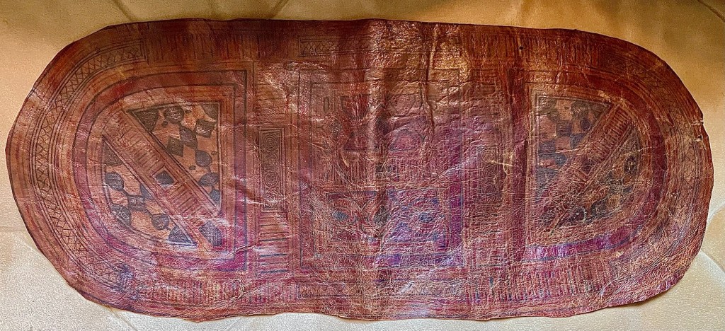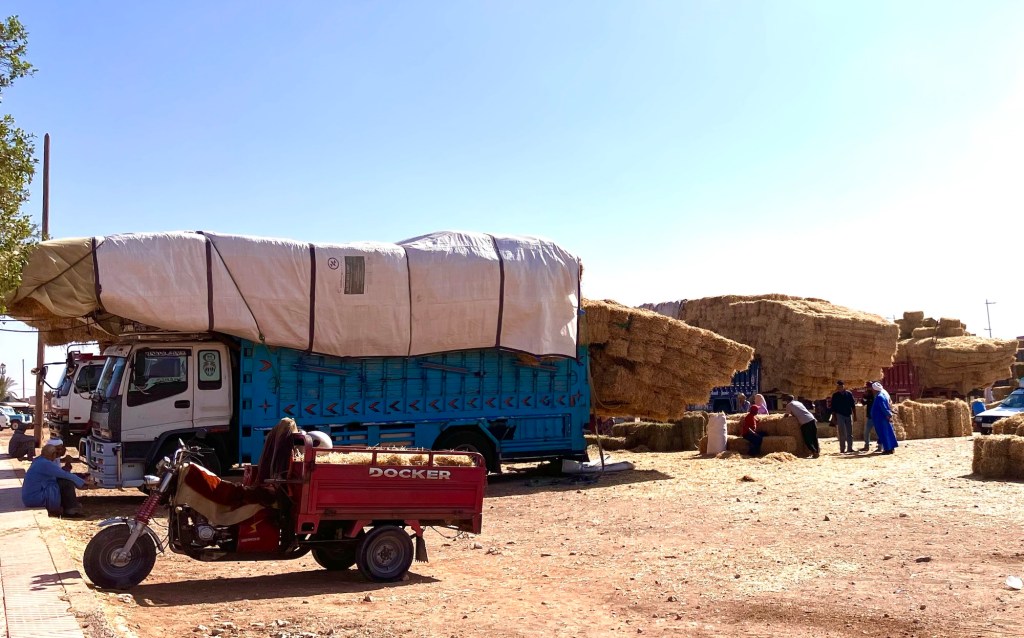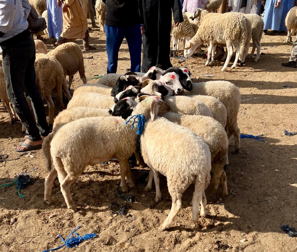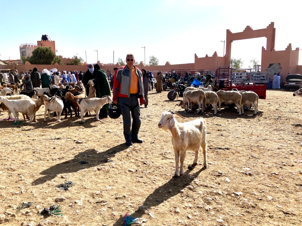 Nun, es ist sich ausgegangen. Unsere Abreise aus der Oase Tighmert fiel auf einen Samstag. Wir parkten den Bock neben dem Taxistandplatz am Marktgelände, wo schon reges Treiben herrschte. Obst, Gemüse, Getier, Hausrat, ein Fetzenmarkt, Werkzeug, scheinbar alles war hier erhältlich. Die „erschöpfte“ Männerwelt lagerte schon beim Teehaus auf den Teppichen und war in geschäftige Gespräche vertieft (leider kein Foto, denn ungefragt mach ich das nicht). Über eine Stiege konnte man in die abgegrenzten Bereich der Tierhändler kommen. Einige Dromedare, viele Ziegen und Schafe wurden feilgeboten. Der Ziegenbock wurde bei den Hörnern hochgerissen, um das Gebiss den potentiellen Käufern zu zeigen. Mit zusammengebundenen Beinen am Boden liegend waren die Tiere ihrem Schicksal ausgeliefert. Da nützte kein blöken und meckern. Ein Rudel junge Schafe war einfach an den Hälsen wie ein Bündel zusammengeschnürt. Ein Aufschrei bei unseren Tierschützern wäre da gewiss. Die Dromedare wollten wir uns näher ansehen. Hallo, Francais? Deutschland? Schweiz? Österreich? Ah, aus Wien? Egal wo wir auftauchen, es gibt immer jemanden, der Deutsch spricht. Diesmal war es der Besitzer der Dromedare, Belaid. Er hat in Wien im Donauzentrum gearbeitet, bevor er wieder zurück zur Familie in die Sahara gekommen ist. Dromedar wollten wir natürlich keines kaufen. Unbedingt sollten wir seine mitgebrachten Kunsthandwerk-Sachen der Berber-Familie anschauen. Nur anschauen! Man muss nichts kaufen, obwohl der Familie diese Tauschwaren helfen. Dromedare werden im Moment nicht so gut verkauft, weil es trocken ist. Wer ein Tier kauft, muss auch Geld für Futter haben, usw. usf. Ein wunderschönes altes bemaltes Kamellederstück – ähnlich dem Leder vom Postsack im Museum in Tighmert – hatte meine Aufmerksamkeit natürlich nicht unbemerkt auf sich gezogen. Hingesetzt in das kleine Zelt , ein Tässchen Tee und schon wurde verhandelt. Belaid erklärte, dass früher solche Lederstreifen, quasi als Heiratsurkunden fungierten. Ah, und da kommt auch Barmal vorbei. Schön ihn nochmals zu treffen.