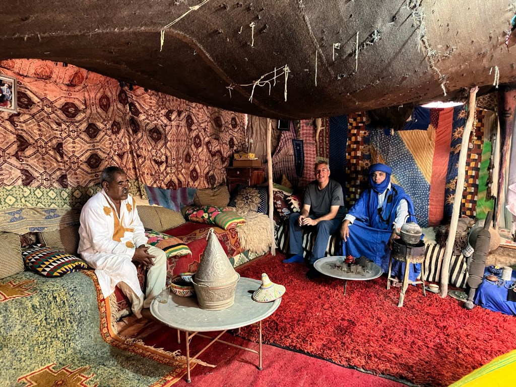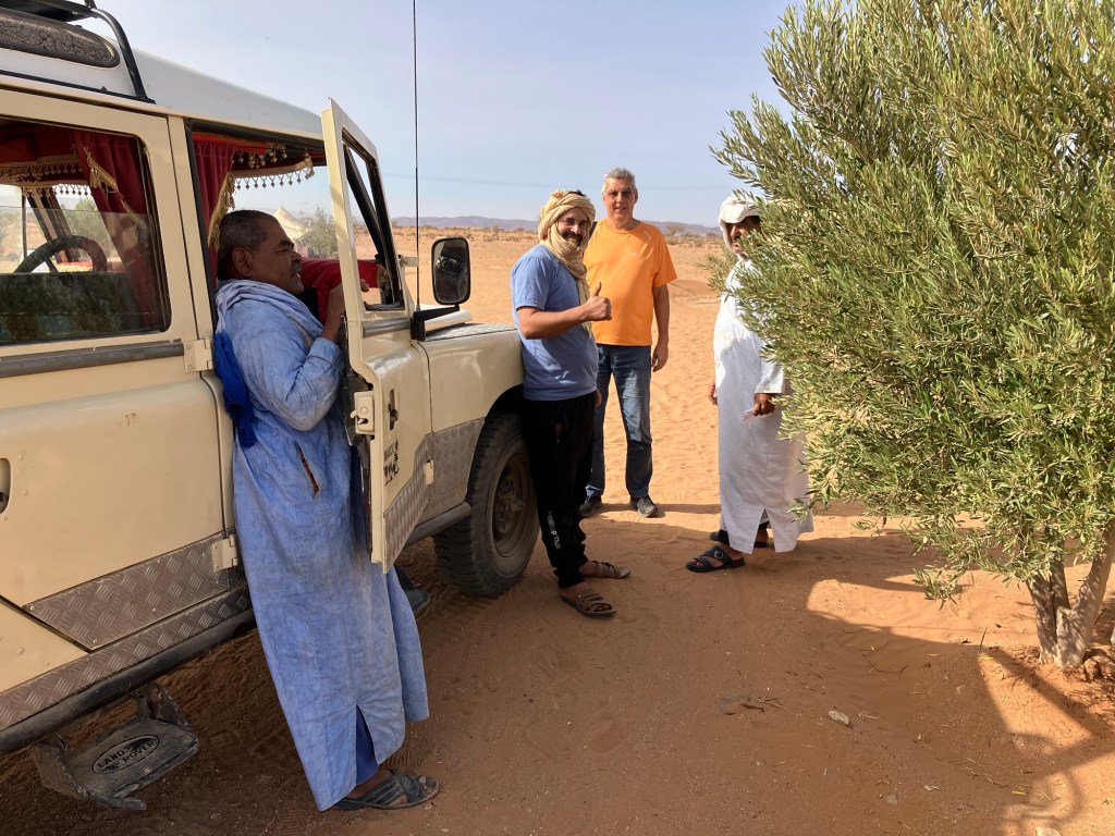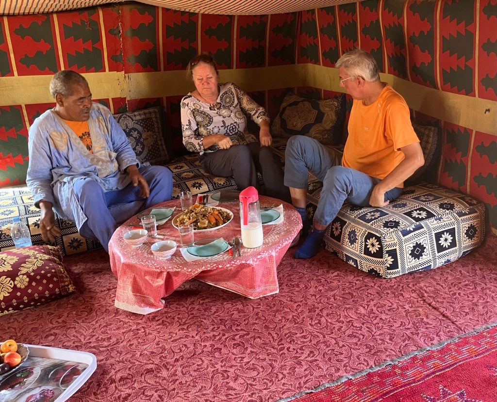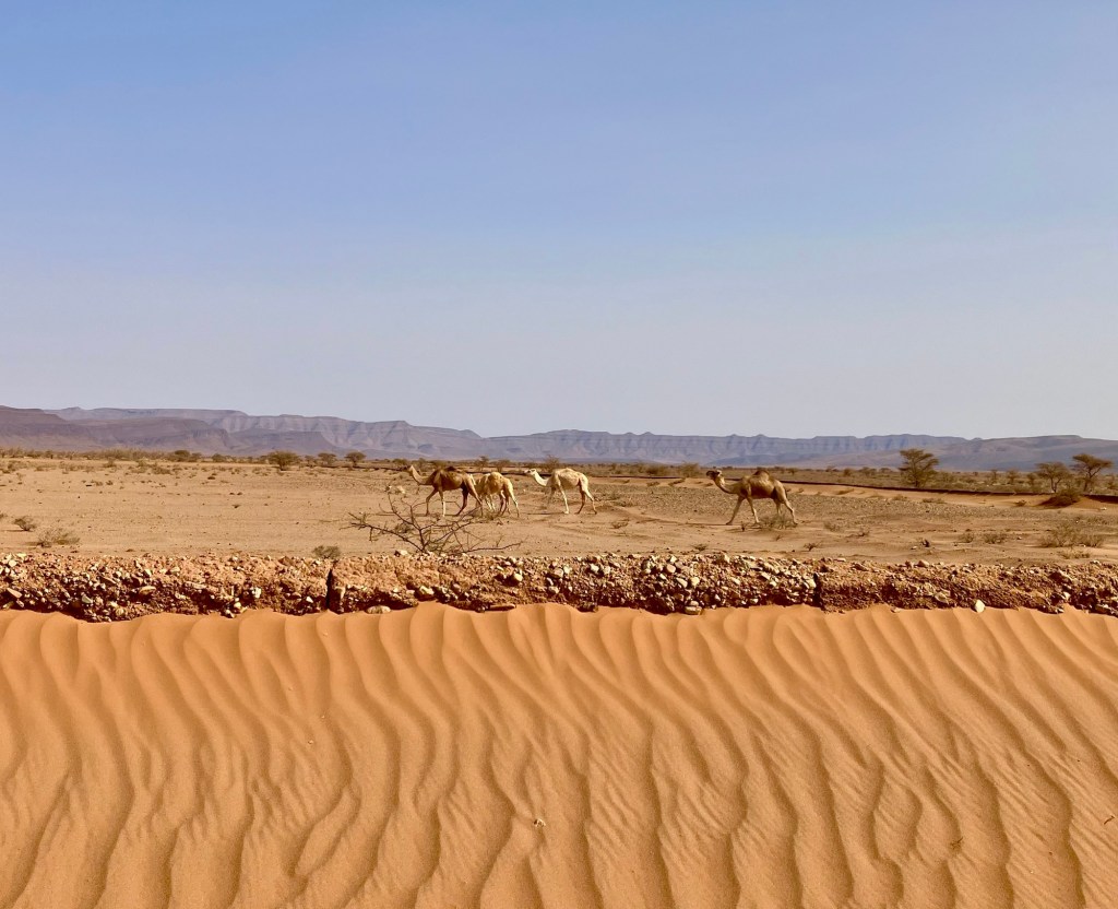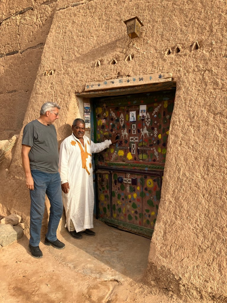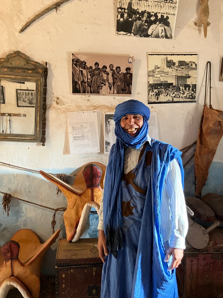 Etliche Kilometer lagen noch vor uns. Etwas ausserhalb von Guelmim liegt die Oase Tighmert. Wir hatten uns für das Maison Nomade als Quartier entschieden. Eine super Wahl, um mit der traditionellen Architektur und der Gastfreundschaft der Berber Bekanntschaft zu machen. Zur Begrüßung gab es Tee im Zelt und ein freundlicher Herr leistete uns Gesellschaft. Er sprach deutsch, erzählte von sich, von der Oase und der Gegend. Begehrlichkeiten wurden geweckt. Und schon hatten wir einen Rundgang in der Oase Tighmert und für den nächsten Tag eine Ausfahrt mit dem Land Rover in die Wüste gebucht. Barmal war ab nun unser Guide :-). Er führte uns in die 350 Jahre alte Karawanserei, die heute ein Museum ist. Der Museumsdirektor Hassan zeigte uns viele interessante Artefakte, die in dem Gebäude aufbewahrt werden. Der Postsack aus Kamelleder, war ein besonders schönes Stück. Historische Fotos liessen die Vergangenheit erwachen. Ein leichter Geruch von Leder, Sandelholz, Lehm und die warme Luft zog durch die Räume und unterstrich die Erinnerungen an die Vergangenheit der Karawanserei. Wege der Karawanen kreuzten sich hier und waren ein wichtiger Handelsplatz. Manchmal blieben die Händler mit ihren Dromedaren ein Monat, bevor sie weiter zogen. Zum Abschluss bot uns Hassan Tee in seinem Zelt an. Dann wanderten wir vorbei an den Dattelpalmen zurück zum Maison Nomade, wo wir den Tag bei einer köstlichen Tajine ausklingen liessen.