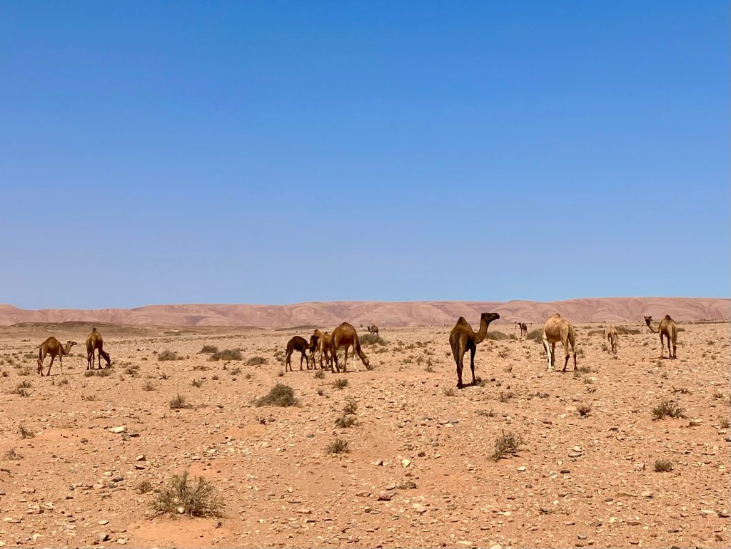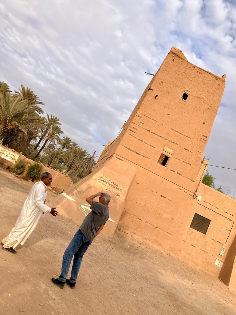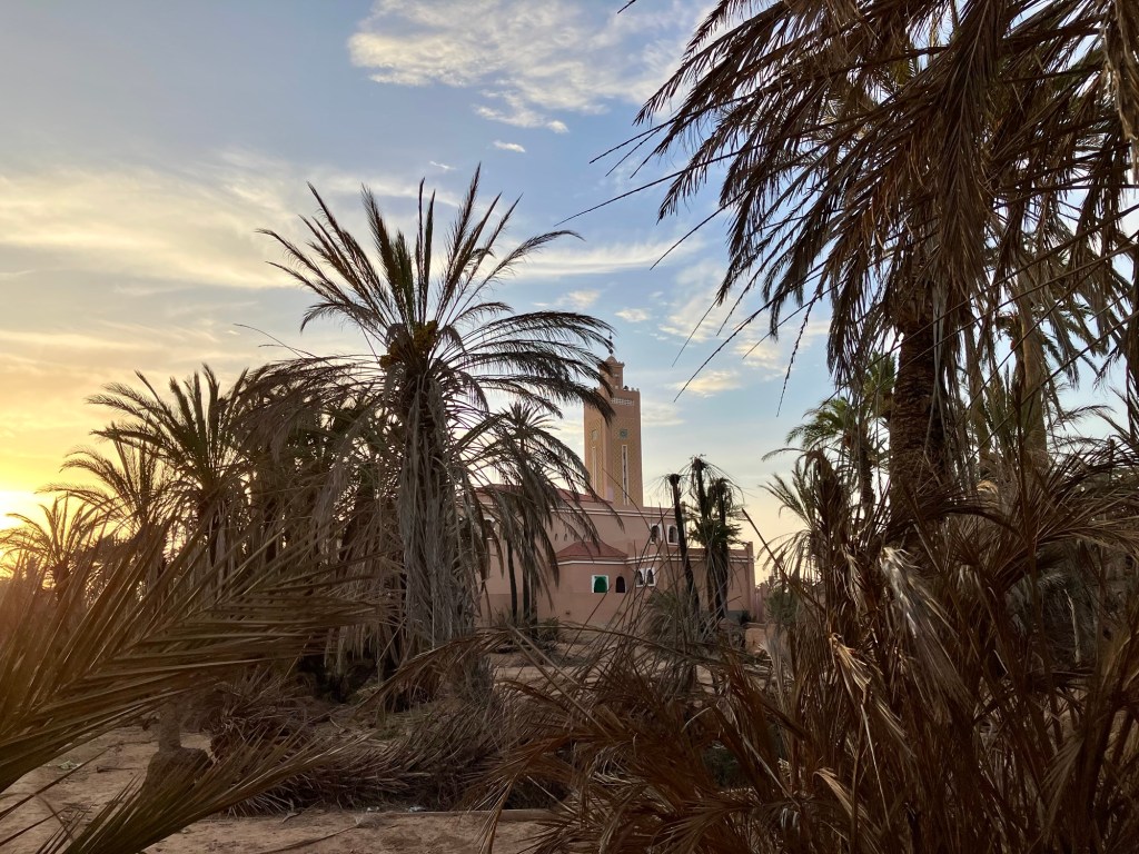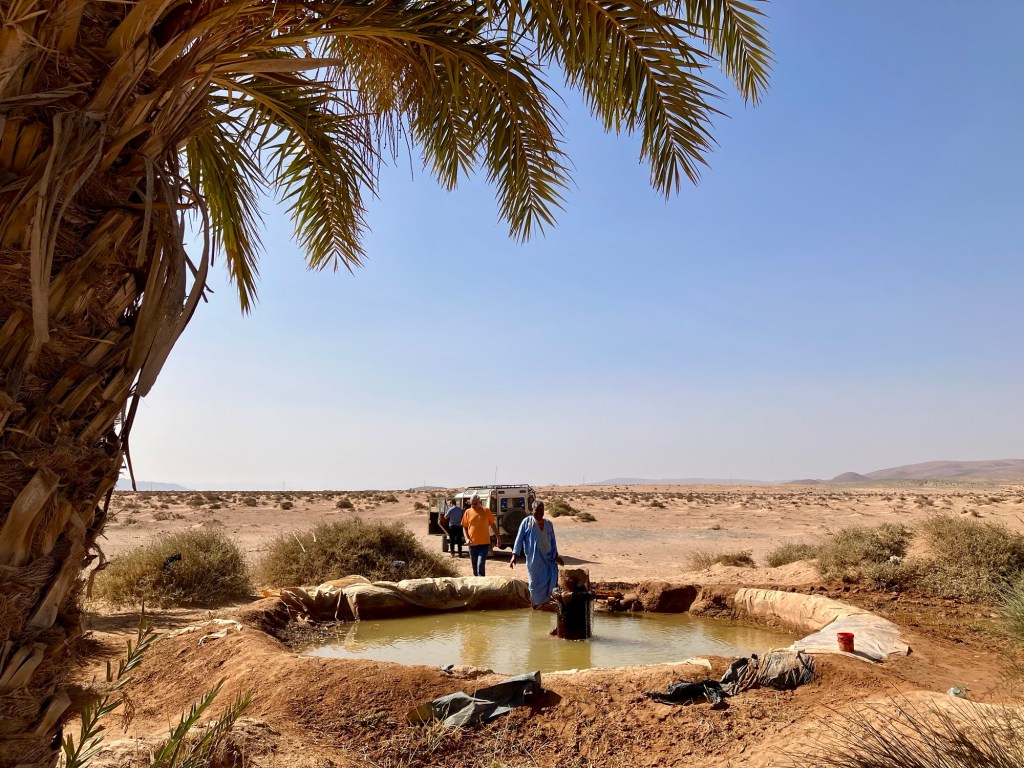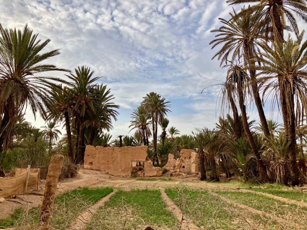Etliche Kilometer lagen noch vor uns. Etwas ausserhalb von Guelmim liegt die Oase Tighmert. Wir hatten uns für das Maison Nomade als Quartier entschieden. Eine super Wahl, um mit der traditionellen Architektur und der Gastfreundschaft der Berber Bekanntschaft zu machen. Zur Begrüßung gab es Tee im Zelt und ein freundlicher Herr leistete uns Gesellschaft. Er sprach deutsch, erzählte von sich, von der Oase und der Gegend. Begehrlichkeiten wurden geweckt. Und schon hatten wir einen Rundgang in der Oase Tighmert und für den nächsten Tag eine Ausfahrt mit dem Land Rover in die Wüste gebucht. Barmal war ab nun unser Guide :-). Er führte uns in die 350 Jahre alte Karawanserei, die heute ein Museum ist. Der Museumsdirektor Hassan zeigte uns viele interessante Artefakte, die in dem Gebäude aufbewahrt werden. Der Postsack aus Kamelleder, war ein besonders schönes Stück. Historische Fotos liessen die Vergangenheit erwachen. Ein leichter Geruch von Leder, Sandelholz, Lehm und die warme Luft zog durch die Räume und unterstrich die Erinnerungen an die Vergangenheit der Karawanserei. Wege der Karawanen kreuzten sich hier und waren ein wichtiger Handelsplatz. Manchmal blieben die Händler mit ihren Dromedaren ein Monat, bevor sie weiter zogen. Zum Abschluss bot uns Hassan Tee in seinem Zelt an. Dann wanderten wir vorbei an den Dattelpalmen zurück zum Maison Nomade, wo wir den Tag bei einer köstlichen Tajine ausklingen liessen.
