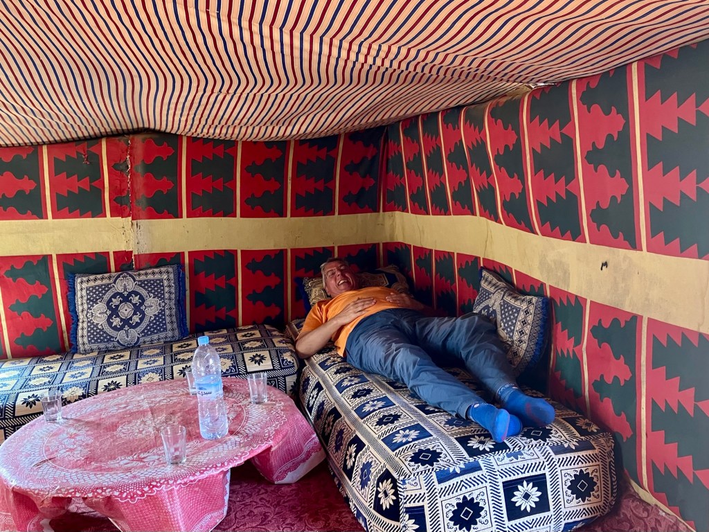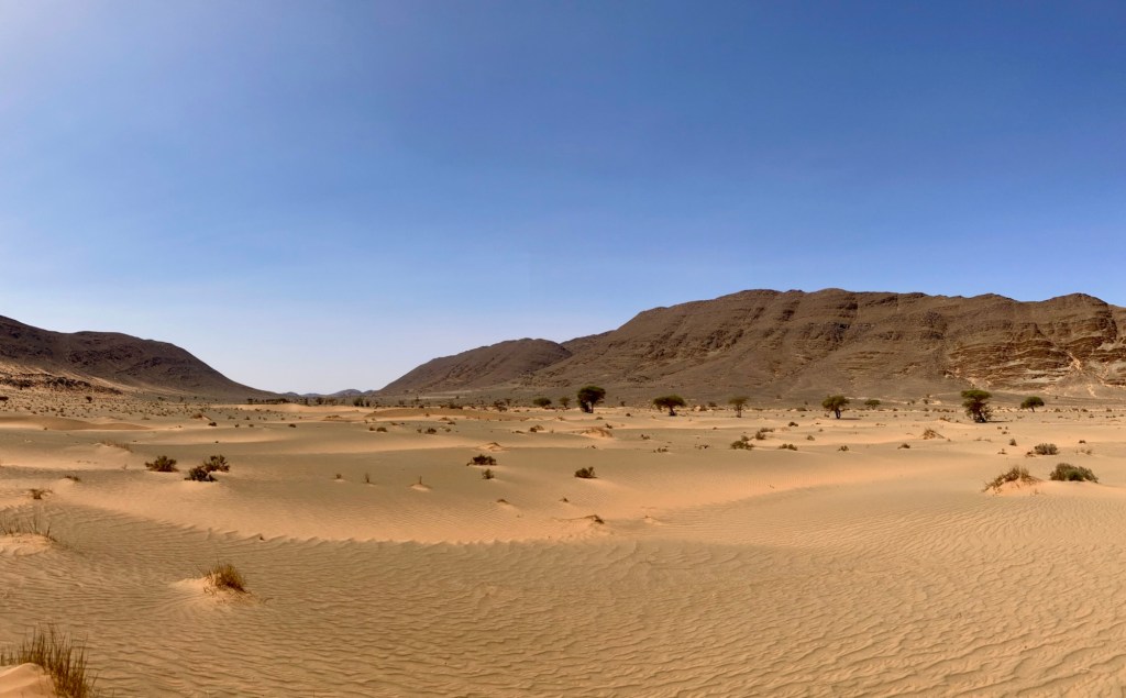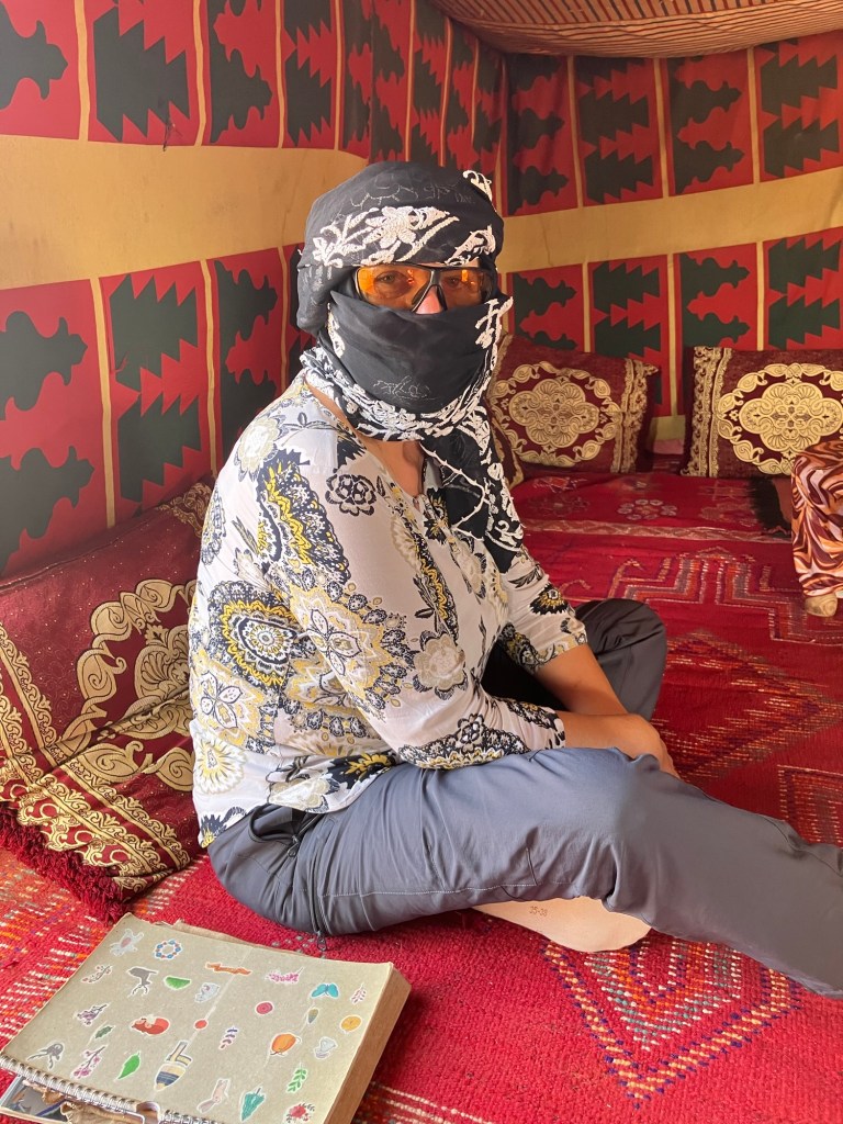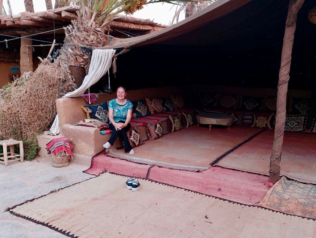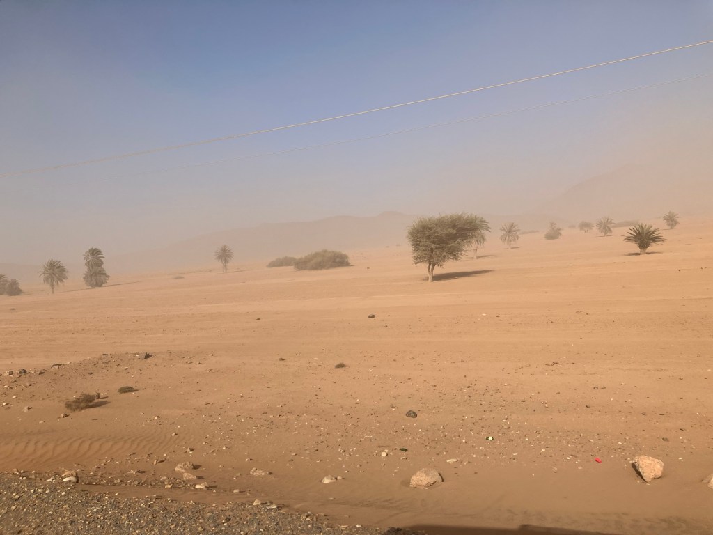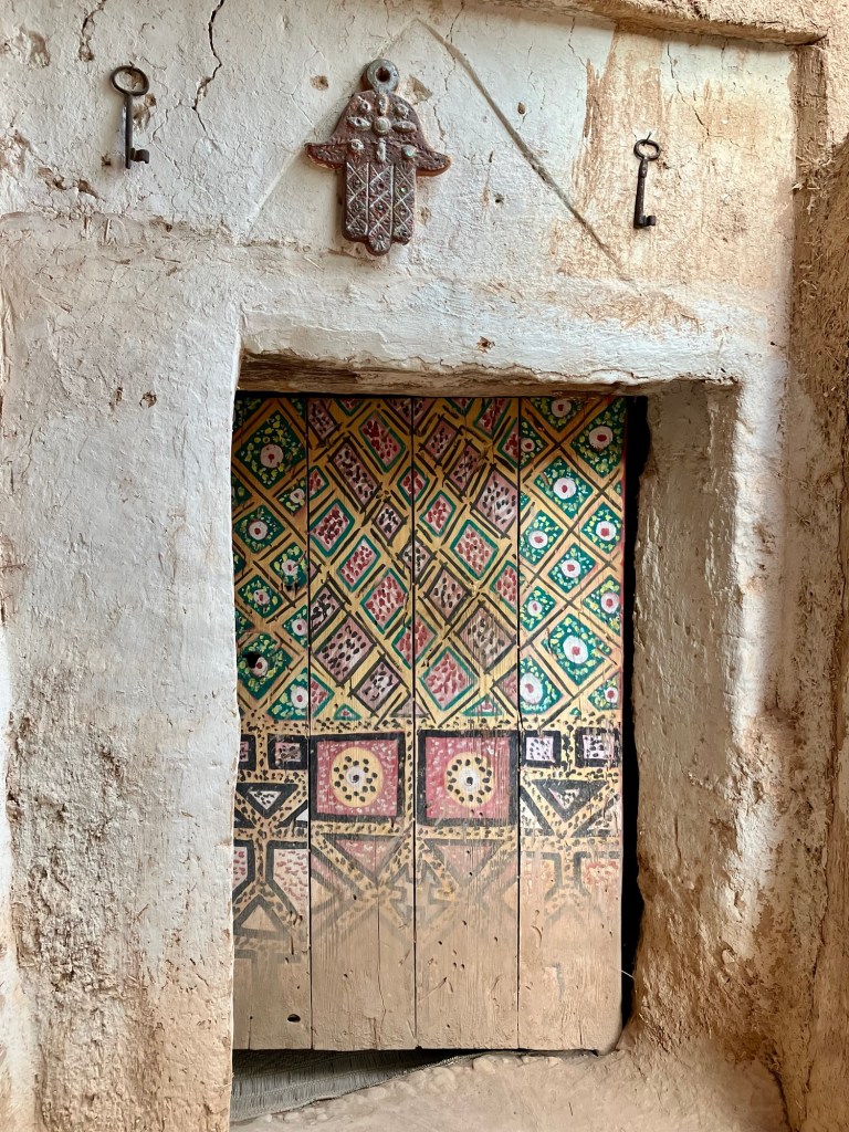 Etliche Kilometer lagen noch vor uns. Etwas ausserhalb von Guelmim liegt die Oase Tighmert. Wir hatten uns für das Maison Nomade als Quartier entschieden. Eine super Wahl, um mit der traditionellen Architektur und der Gastfreundschaft der Berber Bekanntschaft zu machen. Zur Begrüßung gab es Tee im Zelt und ein freundlicher Herr leistete uns Gesellschaft. Er sprach deutsch, erzählte von sich, von der Oase und der Gegend. Begehrlichkeiten wurden geweckt. Und schon hatten wir einen Rundgang in der Oase Tighmert und für den nächsten Tag eine Ausfahrt mit dem Land Rover in die Wüste gebucht. Barmal war ab nun unser Guide :-). Er führte uns in die 350 Jahre alte Karawanserei, die heute ein Museum ist. Der Museumsdirektor Hassan zeigte uns viele interessante Artefakte, die in dem Gebäude aufbewahrt werden. Der Postsack aus Kamelleder, war ein besonders schönes Stück. Historische Fotos liessen die Vergangenheit erwachen. Ein leichter Geruch von Leder, Sandelholz, Lehm und die warme Luft zog durch die Räume und unterstrich die Erinnerungen an die Vergangenheit der Karawanserei. Wege der Karawanen kreuzten sich hier und waren ein wichtiger Handelsplatz. Manchmal blieben die Händler mit ihren Dromedaren ein Monat, bevor sie weiter zogen. Zum Abschluss bot uns Hassan Tee in seinem Zelt an. Dann wanderten wir vorbei an den Dattelpalmen zurück zum Maison Nomade, wo wir den Tag bei einer köstlichen Tajine ausklingen liessen.