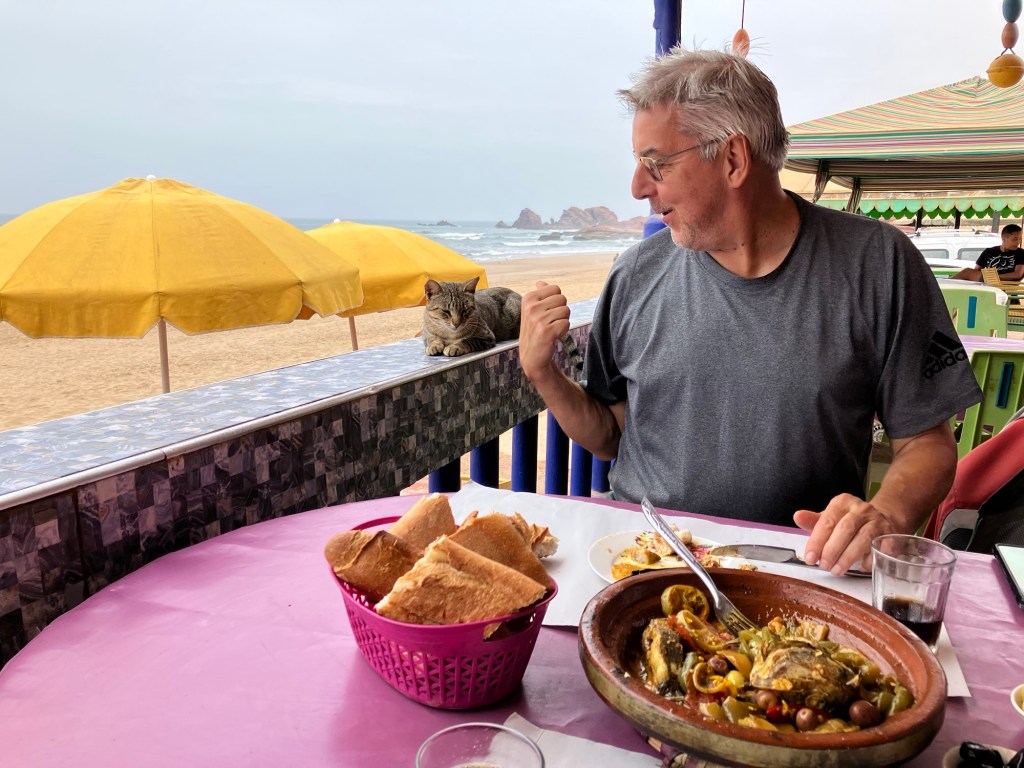 Vom Paradise Valley führte die Route an Agadir vorbei in Richtung Küste. Bis Tiznit radelten wir auf der mehrspurigen Hauptstrasse dahin. Gewöhne ich mich an die vermüllten Straßenränder im Umkreis von größeren Ansiedlungen? Nein, eigentlich nicht, oder noch nicht, dachte ich mir. „Ab Tiznit wird es besser“, meinte der Bock-Chef und er hatte recht. Je weiter wir zur Küste kamen, umso reizvoller wurde die Landschaft. Weniger Besiedlung = weniger Mist (könnte stimmen). Unser nächster Stopp war beim Arc Legzira, ein ausgespülter Felsbogen direkt am Atlantik. Der Ort besteht eigentlich nur aus den kleinen Restaurants direkt am Meer. Jeder rittert um die wenigen Kunden, die sich unter der Woche dorthin verirren. Die Nachsaison ist spürbar.