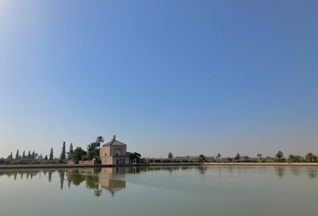 Wir erkundeten einige Gärten der Stadt und waren überrascht. Ein must-have Fotomotiv für Marrakesch-Besucher und auch für verliebte Einheimische (hab ich gelesen) ist der maurische Pavillon mit dem großen Wasserbecken in den Menara-Gärten. Die 100 Hektar große Anlage mit den Olivenbäumen liegt etwa 3 km ausserhalb der Stadtmauern und wurde 1156-1157 von einem Almohadenherrscher als Nutz- und Erholungsgarten angelegt. Die Bäume werden durch eine ausgeklügeltes Kanalsystem aus dem Becken versorgt. Ein interessantes Detail: das Wasserbecken wurde für das Schwimmtraining von Almohaden-Soldaten genutzt, damit sie für die Überquerung des Mittelmeers nach Andalusien vorbereitet waren. Bei klarem Wetter sollte man hinter dem Pavillon die Kulisse des Hohen Atlas Gebirges sehen.