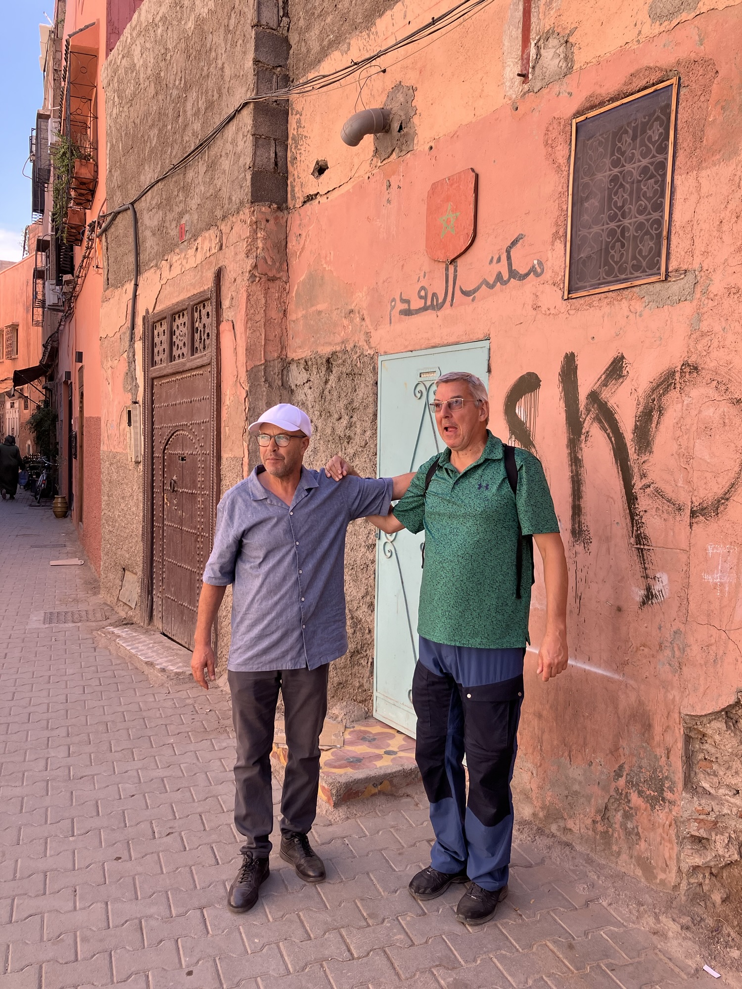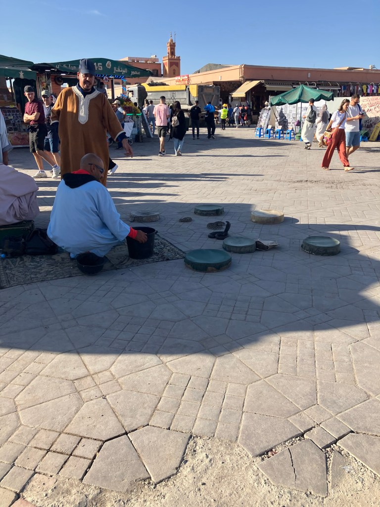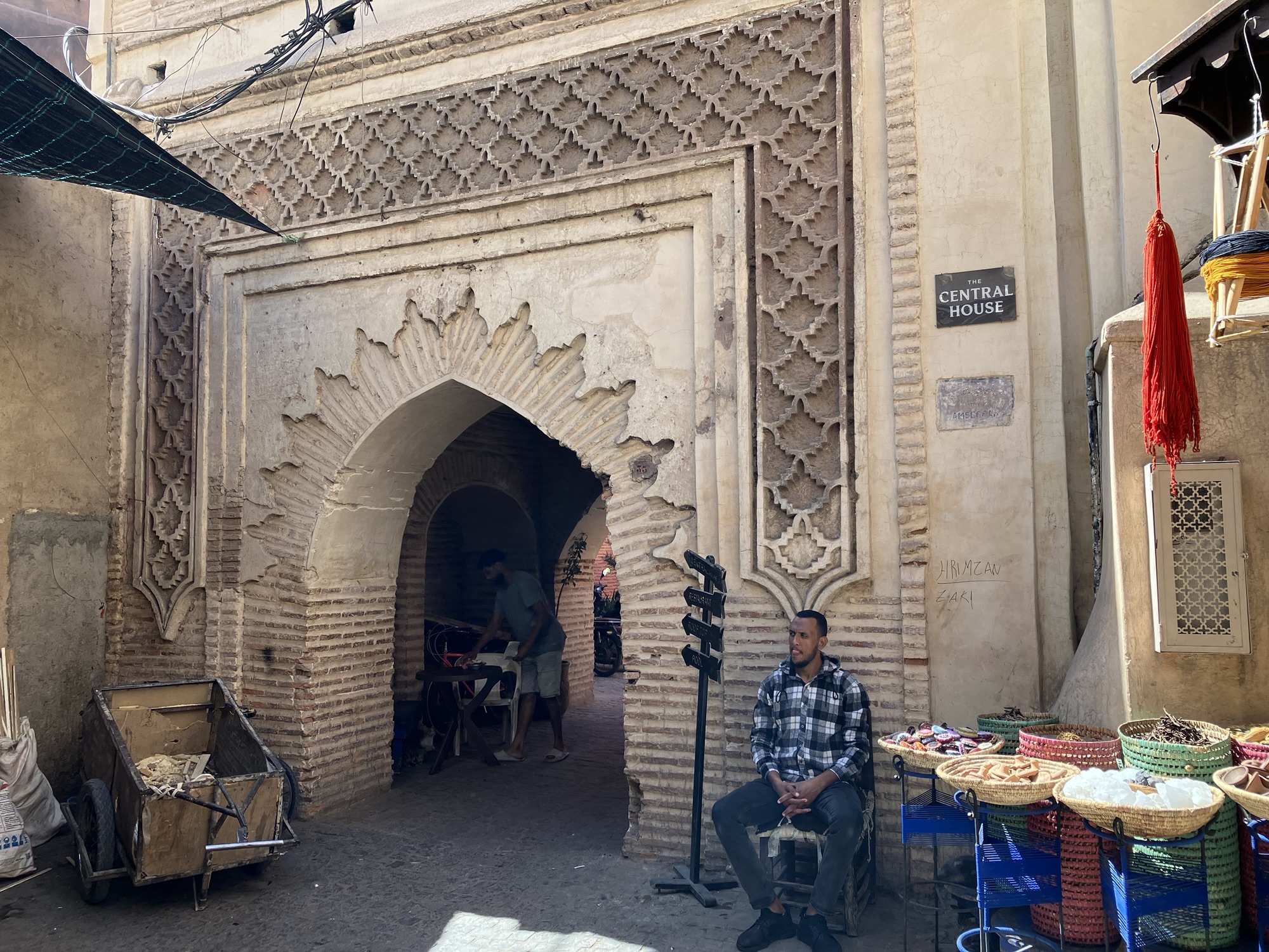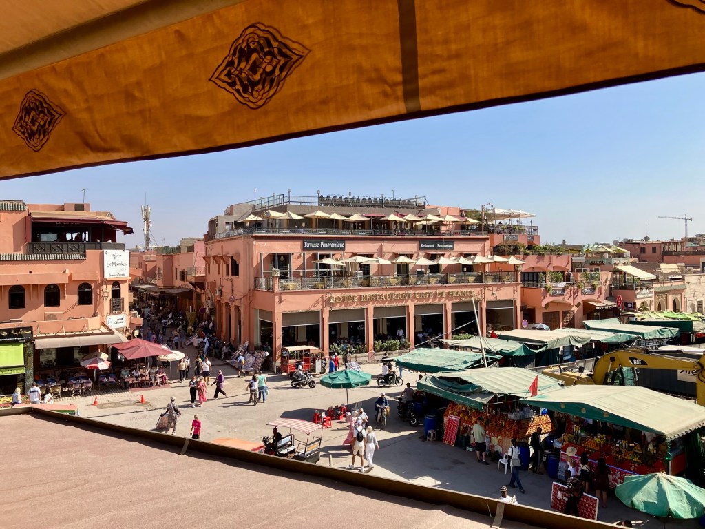 Wir haben die Erfahrung gemacht, dass sich ein eigener Guide für ein paar Stunden immer lohnt. Es werden Dinge erzählt und gezeigt, die nicht im Polyglott stehen. Wir bekamen unseren Guide von einer Freundin vermittelt, die schon in Marrakesch war. Taib spricht perfekt Deutsch und hat auf seinen Führungen schon die österreichischen Regierungsspitzen kennen gelernt. Wir waren in besten Händen. Neben den verborgenen Handwerkergassen in den Souks stand auch das Palais de la Bahia und die Medersa Ben Youssef am Programm. Unser Treffpunkt war vor dem Cafe De France am Jemaa el-fna – Gauklerplatz. Scheinbar ist das ein sicherer Platz um sich zu finden in dem Gewirr, das normalerweise auf dem großen Platz herrscht. Derzeit staubt eine Baustelle alles ein, dennoch liessen sich die Schlangenbeschwörer und Berberaffenquäler nicht abschrecken. Geschäfte müssen gemacht werden. Mein gelber Pullover war unser Erkennungszeichen. Pünktlich starteten wir los.