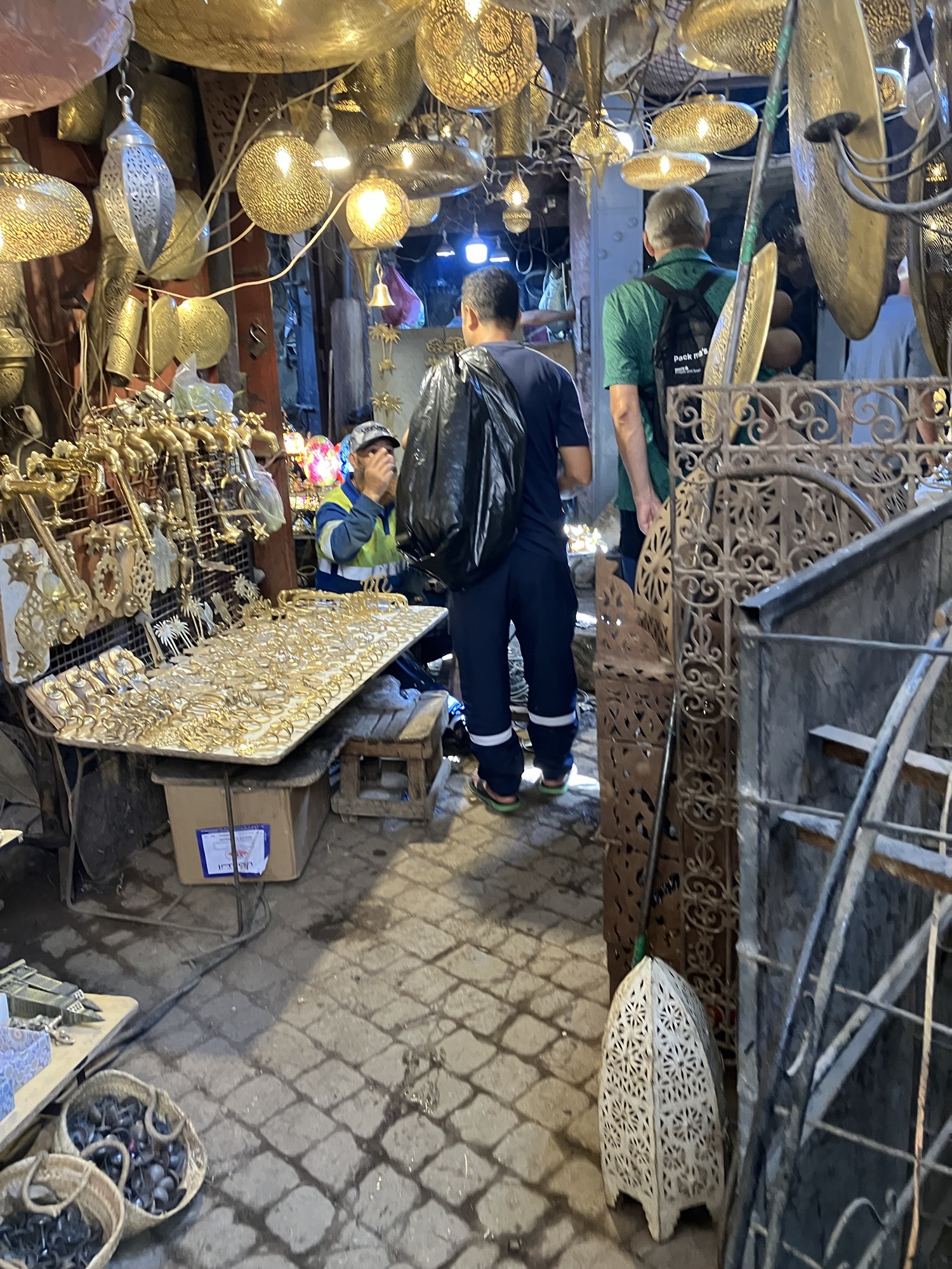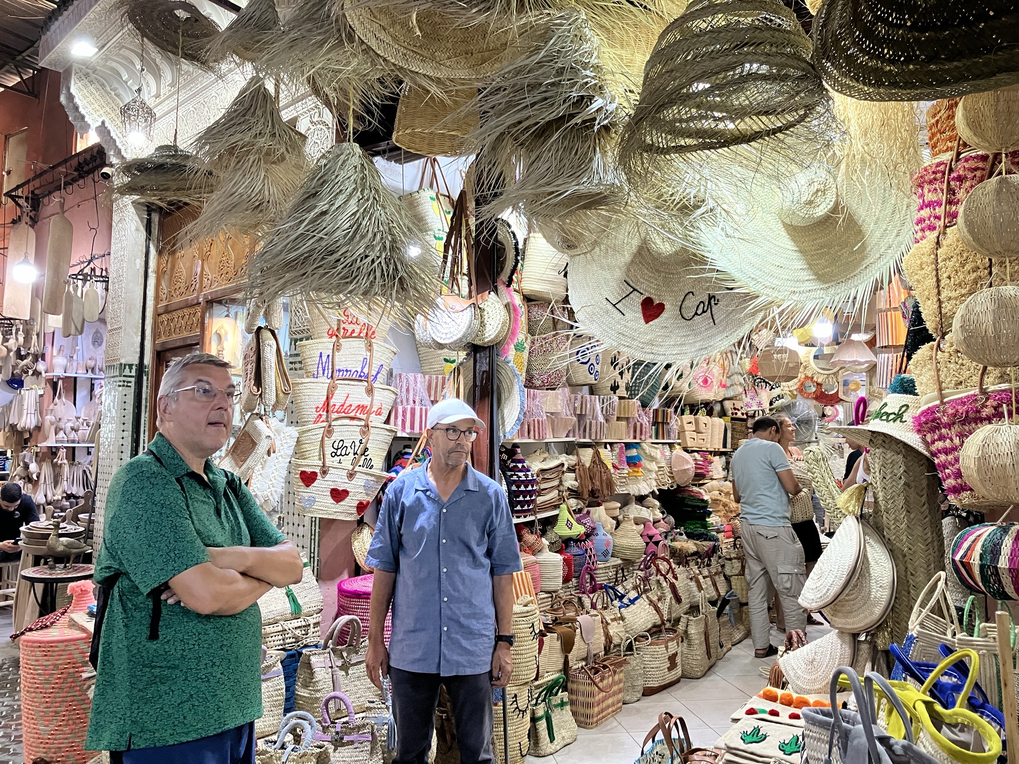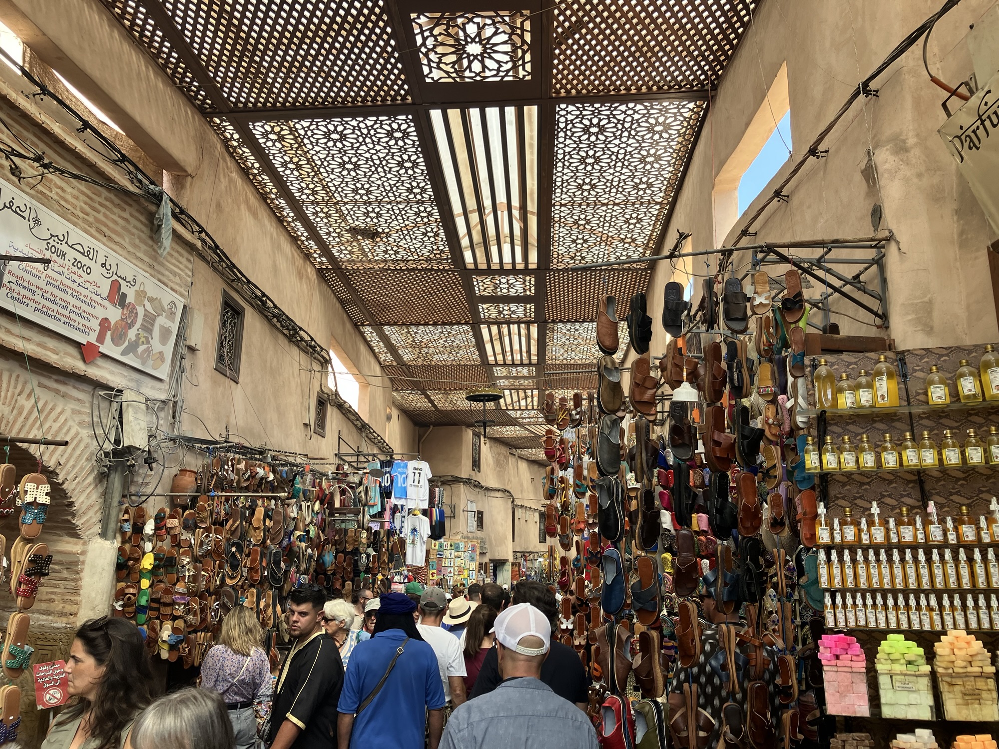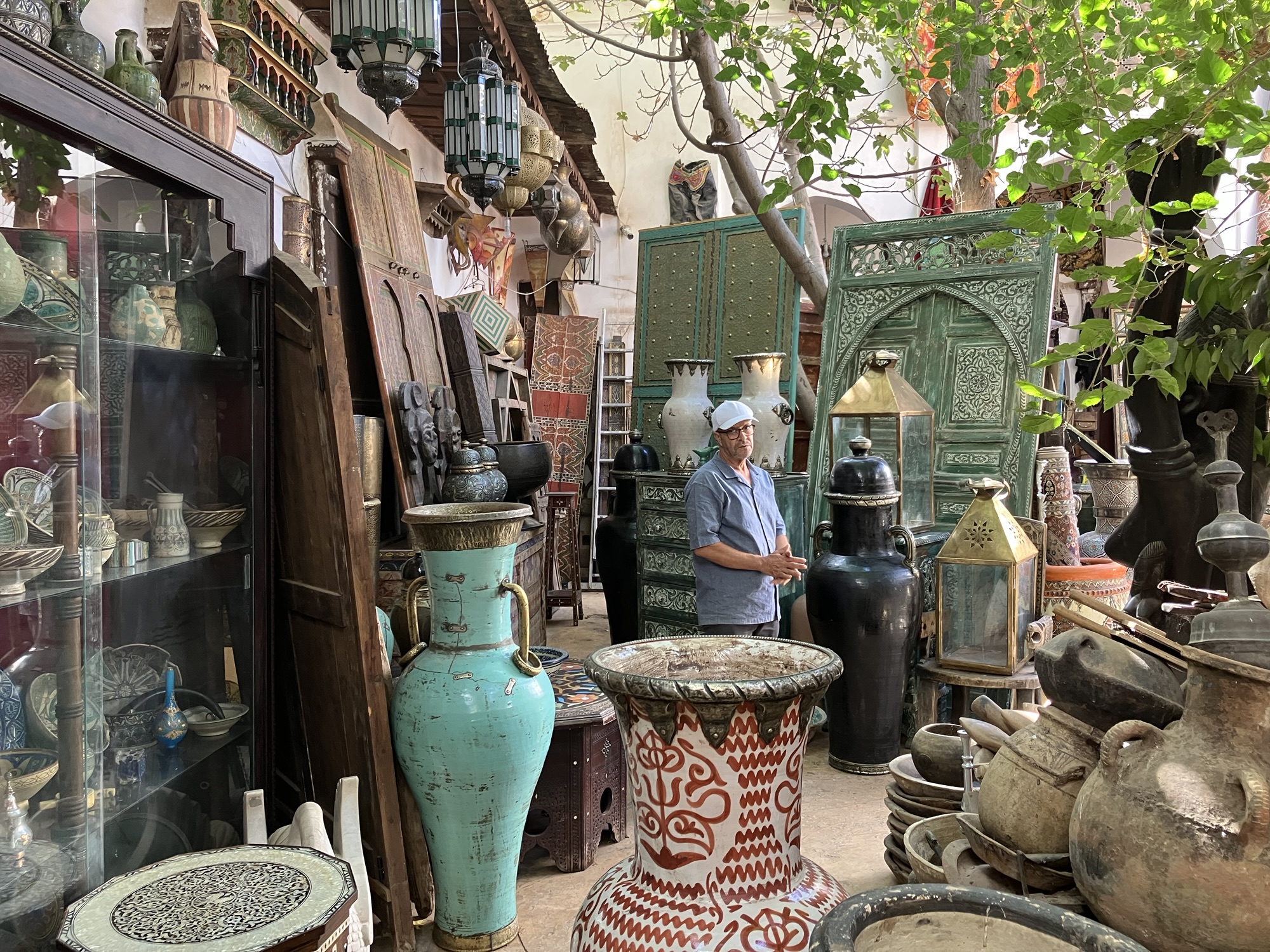 Aber weiter in den Souks. 7000 Geschäfte gibt es in den Gassen der Medina und jedes Geschäft macht jeden tag seinen Umsatz, so unser Fremdenführer. Er muss es wissen, nachdem er hier aufgewachsen ist und viele der Händler persönlich noch kennt. Im Viertel der Lederhändler konnten wir bei der Versteigerung der Lederballen für die marokkanischen Latschen, die in keinen Werkstätten handgefertigt werden, miterleben. Diese Versteigerung findet jeden Tag um 14:00 Uhr statt. Ich schicke euch durch meinen „Foto-Souk“ (inklusive Besuch beim Antiquitätenhändler, jetzt mein Lieblingsgeschäft in Marrakesch). Ihr müsst euch dazu das Gebrumme von Mopeds vorstellen und Stimmengewirr.