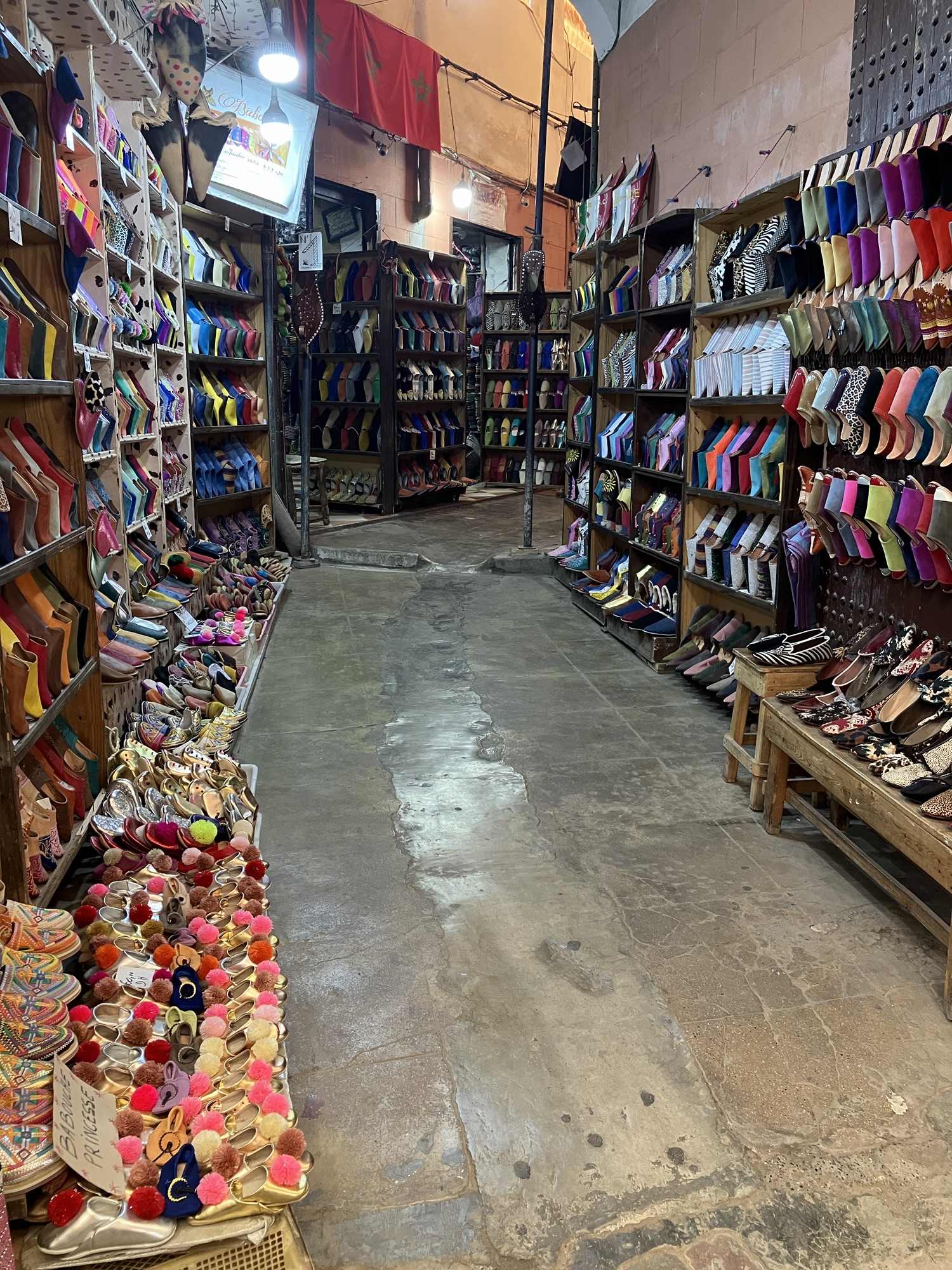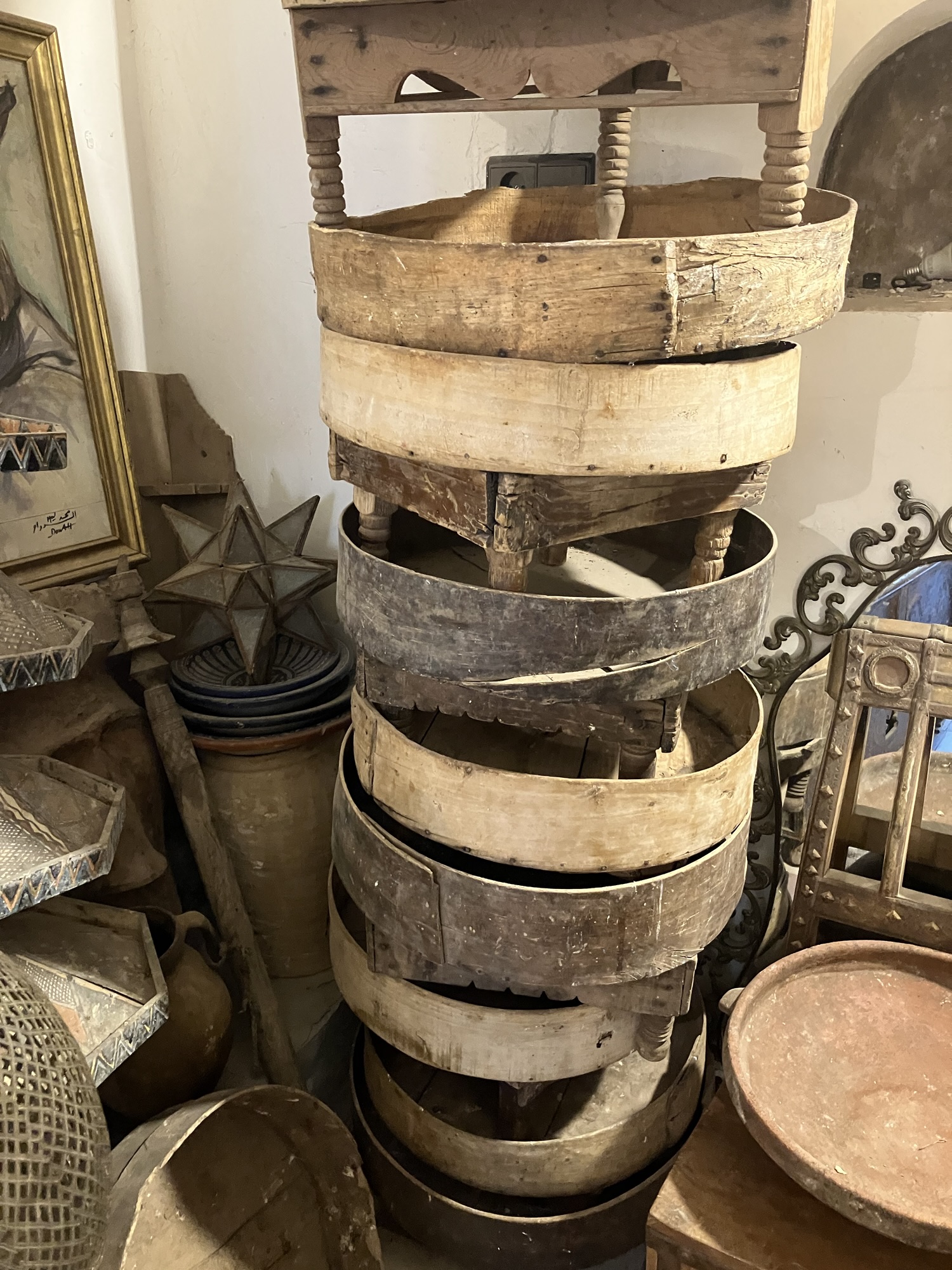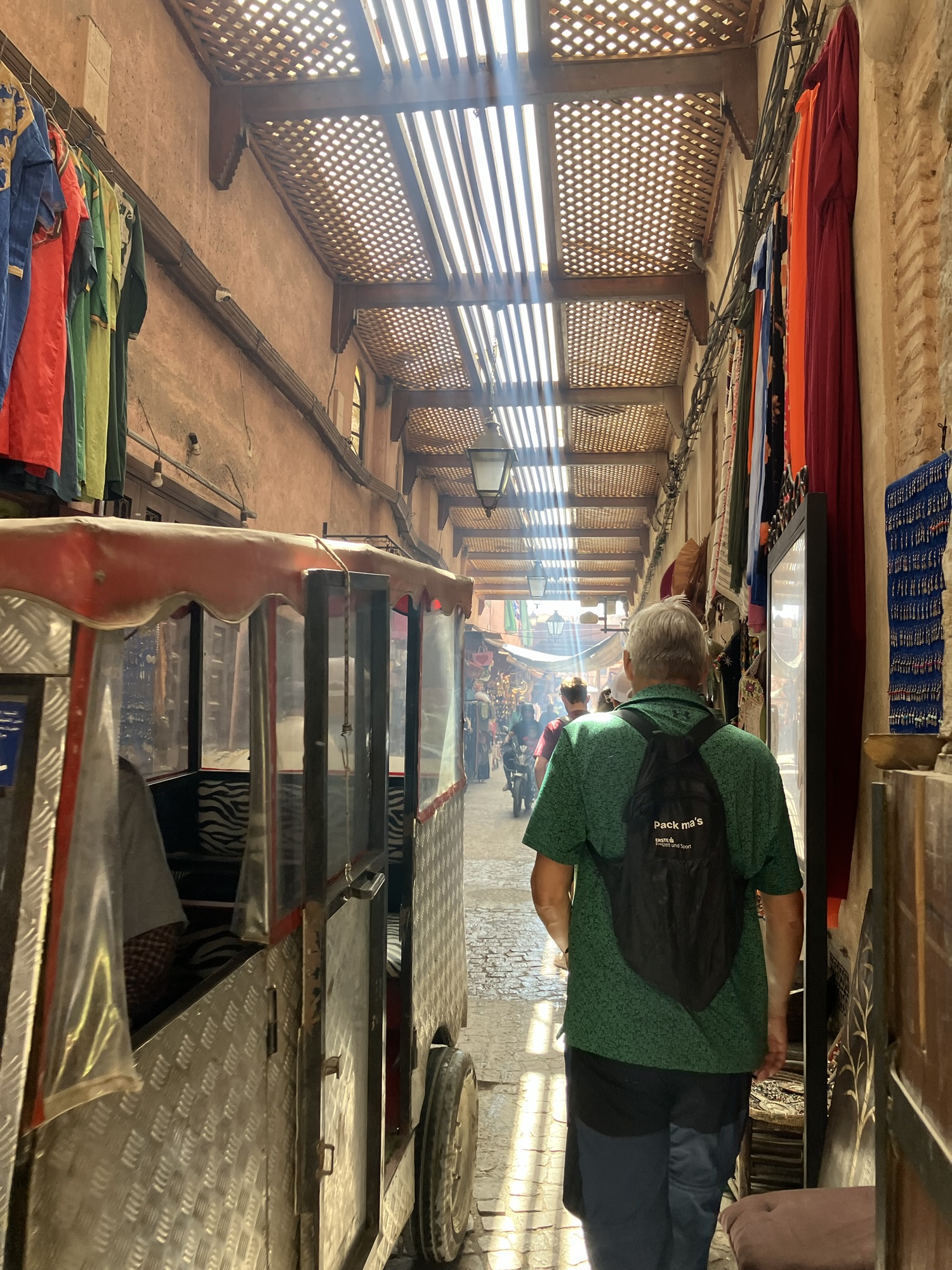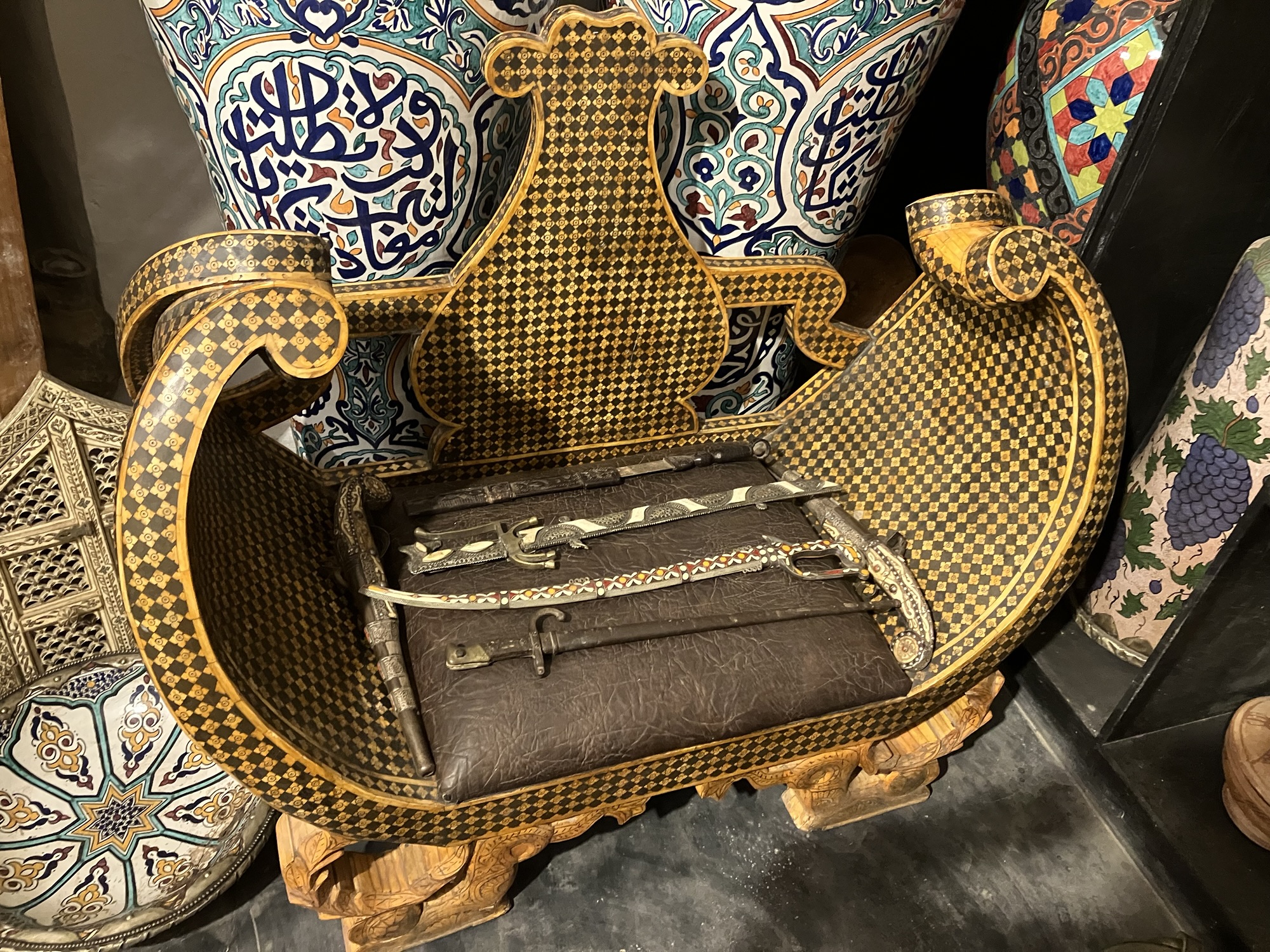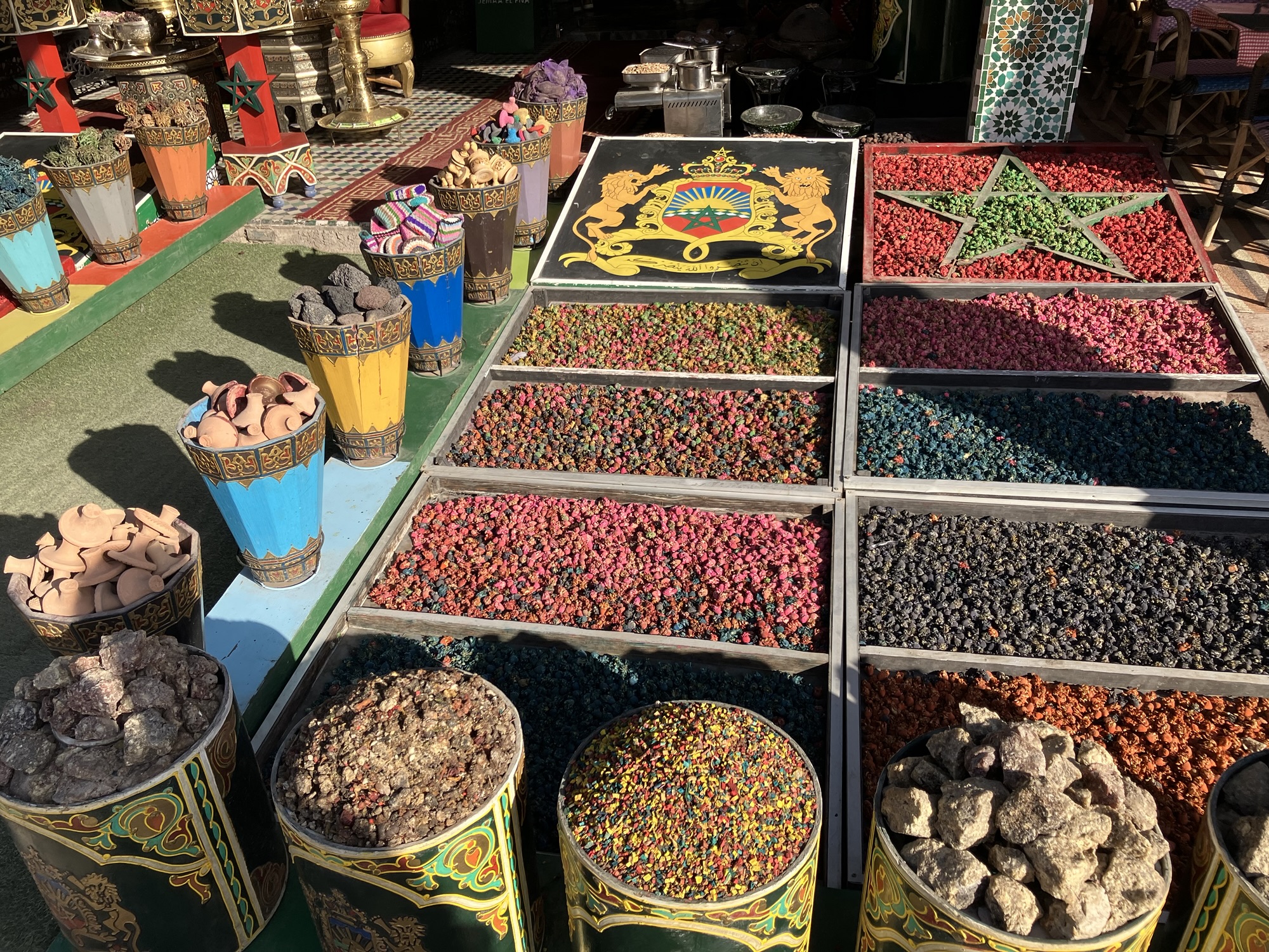 Aber weiter in den Souks. 7000 Geschäfte gibt es in den Gassen der Medina und jedes Geschäft macht jeden tag seinen Umsatz, so unser Fremdenführer. Er muss es wissen, nachdem er hier aufgewachsen ist und viele der Händler persönlich noch kennt. Im Viertel der Lederhändler konnten wir bei der Versteigerung der Lederballen für die marokkanischen Latschen, die in keinen Werkstätten handgefertigt werden, miterleben. Diese Versteigerung findet jeden Tag um 14:00 Uhr statt. Ich schicke euch durch meinen „Foto-Souk“ (inklusive Besuch beim Antiquitätenhändler, jetzt mein Lieblingsgeschäft in Marrakesch). Ihr müsst euch dazu das Gebrumme von Mopeds vorstellen und Stimmengewirr.