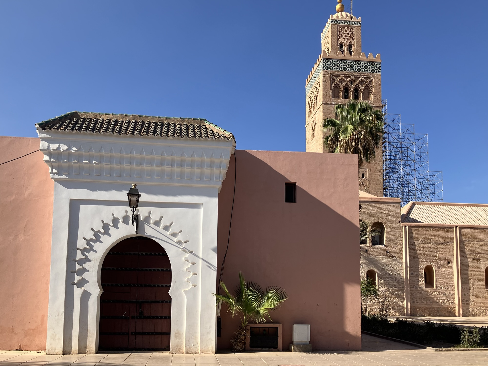 Etwas Zeit blieb noch. Um die Koutoubia Moschee, das Wahrzeichen von Marrakesch, kommt man sowieso nicht umhin. Man kann zwar nur rund herum gehen, weil Gläubige anderer Konfessionen nicht rein dürfen, aber ich hatte das Glück, dass das Tor offen war, schnell ein verstohlener Klick für ein Foto. Wie schon früher erwähnt steht diese Mosche in der Almohadentradition, so wie die zerstörte Moschee in Tinmal.