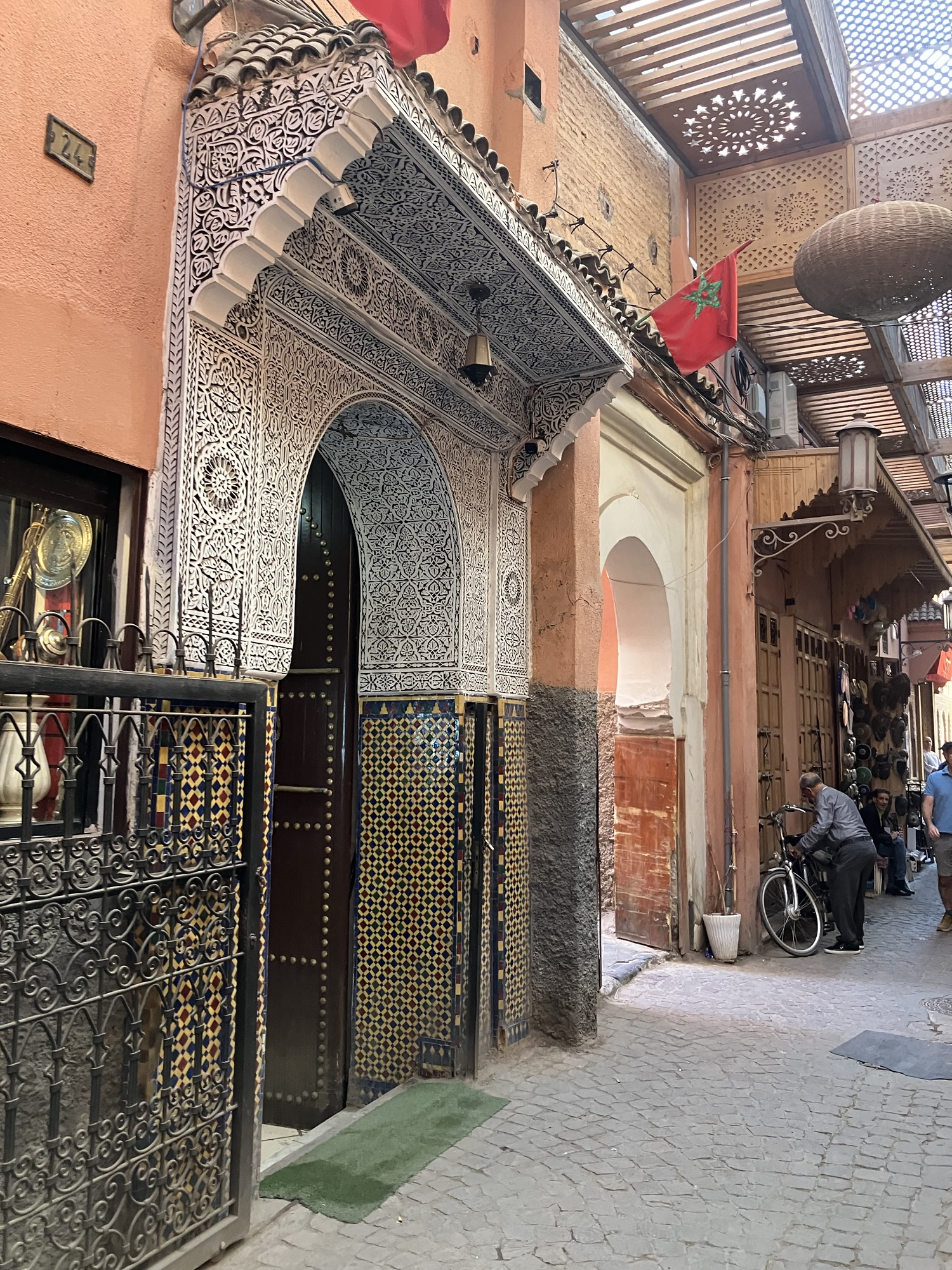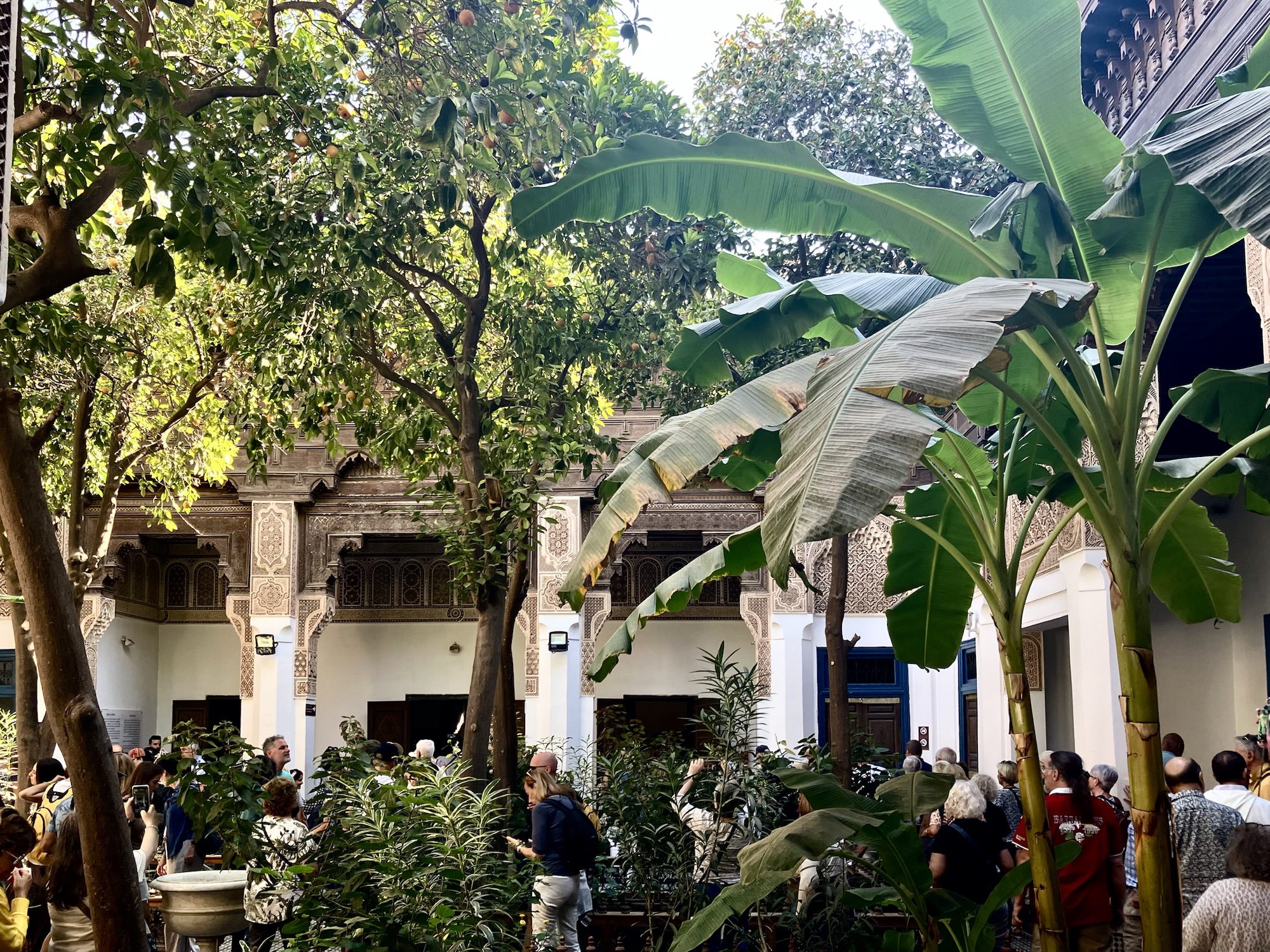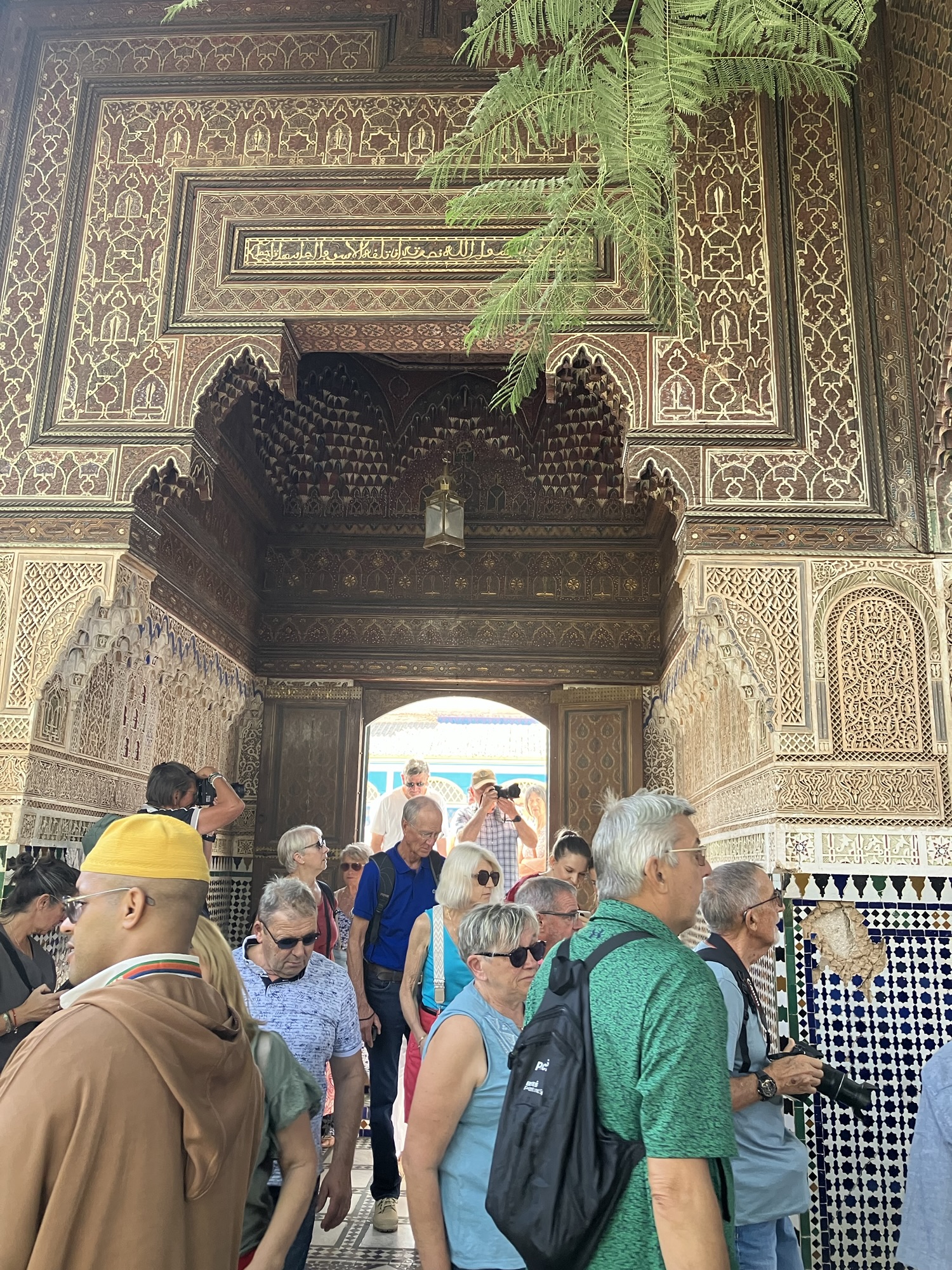 Unser erster Besichtigungspunkt war der Bahia Palast aus dem 19. Jahrhundert. Schon da merkten wir den Vorteil, einen Fremdenführer zu haben. Die Schlange an der Kassa war lange. Geführte Gruppen – und wir waren eine kleine Gruppe – rutschten schnell hinein. Manche Räume waren derzeit nicht zugänglich wegen Renovierungsarbeiten. Interessant fand ich die Information zu Forschungen zu den Deckenmalerei im Palast. Es wurde herausgefunden, dass sich während der Arbeiten an den Holzdecken ein Maler aus Deutschland/Bayern in Marokko befand. Und man vermutet, dass deshalb die Ähnlichkeit zu uns bekannten Bauernmalereien gegeben ist. Im Palais haben wir noch eine Ergänzung zu unserem Gartenwissen bekommen. Ein islamischer Garten besteht aus vier Flächen mit Orangen-/Apfel- oder Granatapfelbäumen. Diese vier begrünten Teile stehen symbolisch für die Jahreszeiten. Dazwischen führt ein kreuzförmiger Weg, an dessen Scheitelpunkt ein Brunnen steht. Die vier Wege stehen für Wasser, Milch, Honig und Wein. Wein? Das Alkohol- und Rauschmittelverbot im Koran stammt aus der Zeit um 625 n. C. Zuerst war es nur auf die Zeit vor den Gebeten beschränkt. Erst später kam das vollständige Verbot. Auslöser für diese Veränderung war, dass ein Vorbeter in weit zurück liegender Zeit betrunken war und so die Suren des Koran nicht korrekt vortragen konnte.