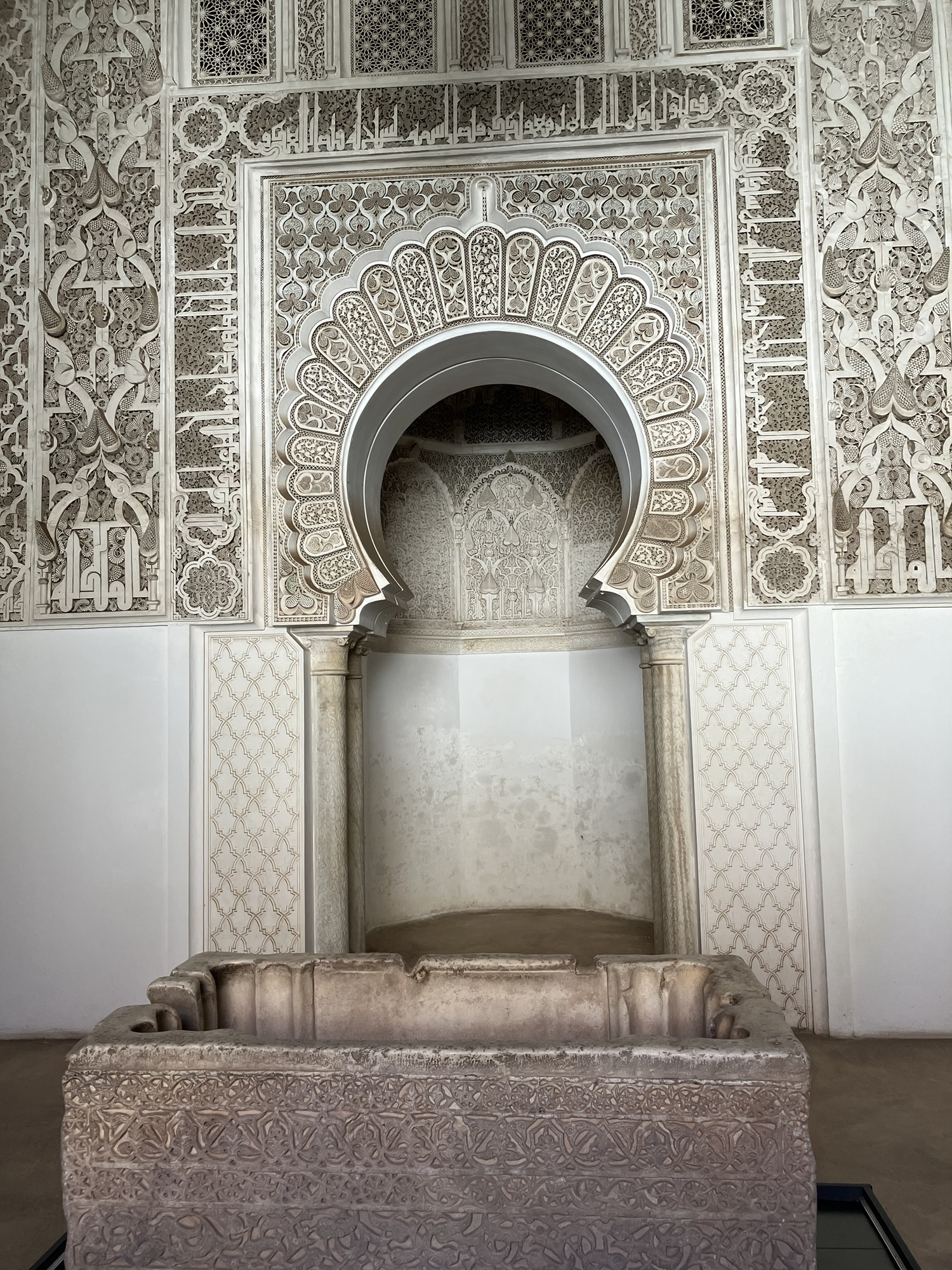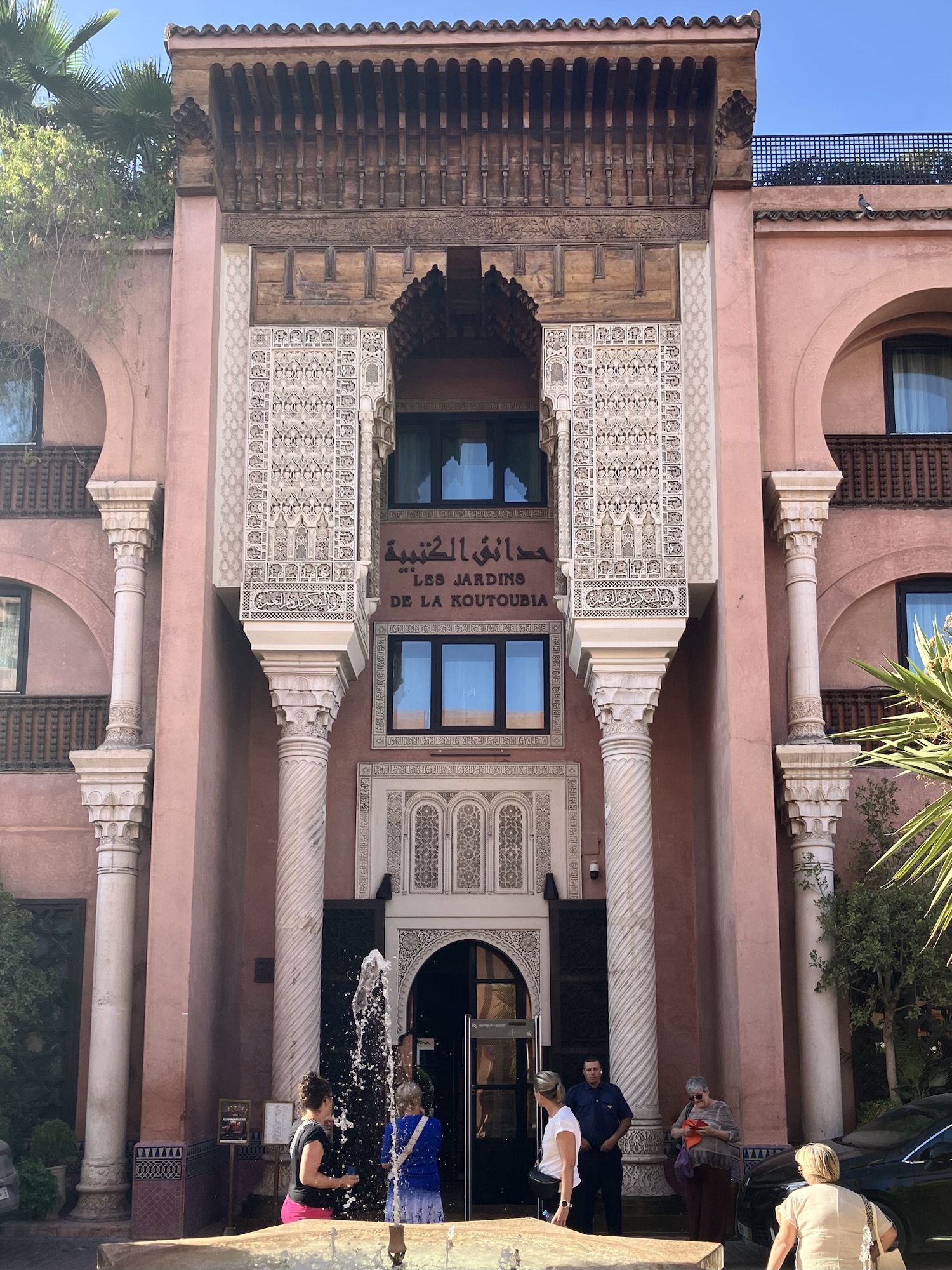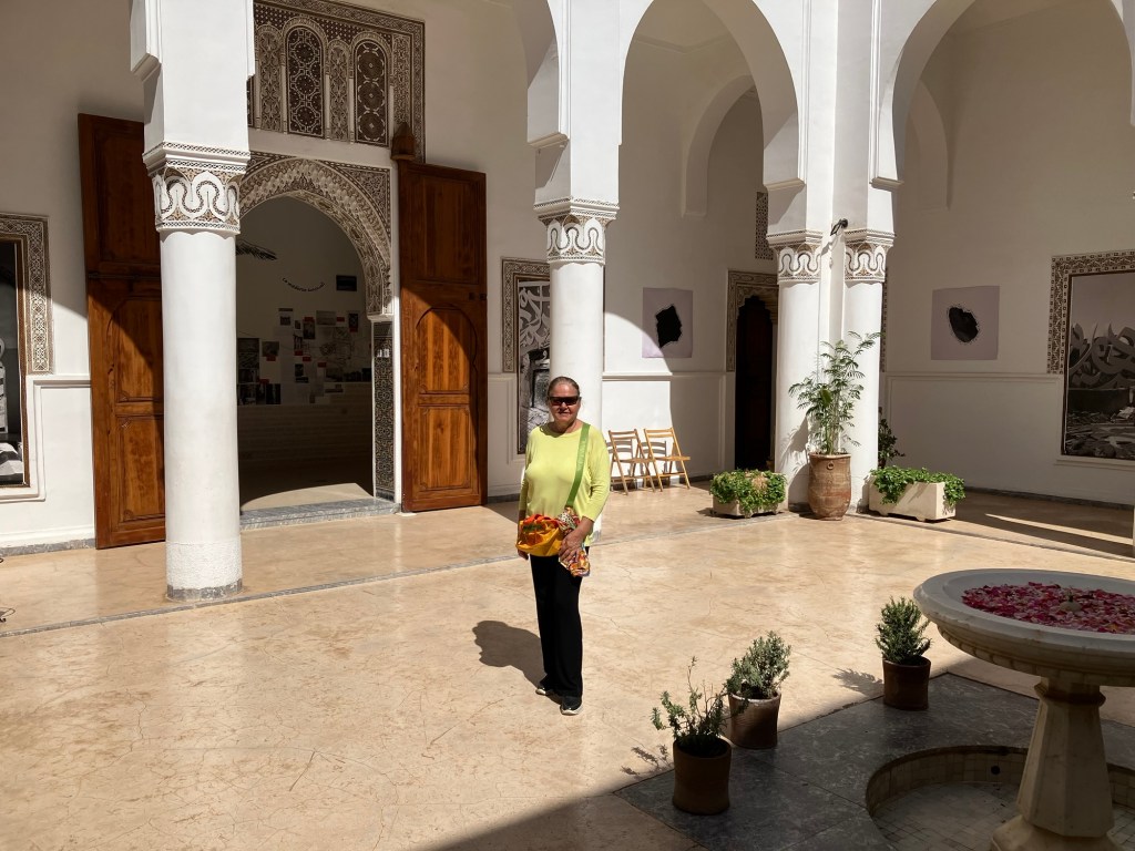 Unser erster Besichtigungspunkt war der Bahia Palast aus dem 19. Jahrhundert. Schon da merkten wir den Vorteil, einen Fremdenführer zu haben. Die Schlange an der Kassa war lange. Geführte Gruppen – und wir waren eine kleine Gruppe – rutschten schnell hinein. Manche Räume waren derzeit nicht zugänglich wegen Renovierungsarbeiten. Interessant fand ich die Information zu Forschungen zu den Deckenmalerei im Palast. Es wurde herausgefunden, dass sich während der Arbeiten an den Holzdecken ein Maler aus Deutschland/Bayern in Marokko befand. Und man vermutet, dass deshalb die Ähnlichkeit zu uns bekannten Bauernmalereien gegeben ist. Im Palais haben wir noch eine Ergänzung zu unserem Gartenwissen bekommen. Ein islamischer Garten besteht aus vier Flächen mit Orangen-/Apfel- oder Granatapfelbäumen. Diese vier begrünten Teile stehen symbolisch für die Jahreszeiten. Dazwischen führt ein kreuzförmiger Weg, an dessen Scheitelpunkt ein Brunnen steht. Die vier Wege stehen für Wasser, Milch, Honig und Wein. Wein? Das Alkohol- und Rauschmittelverbot im Koran stammt aus der Zeit um 625 n. C. Zuerst war es nur auf die Zeit vor den Gebeten beschränkt. Erst später kam das vollständige Verbot. Auslöser für diese Veränderung war, dass ein Vorbeter in weit zurück liegender Zeit betrunken war und so die Suren des Koran nicht korrekt vortragen konnte.