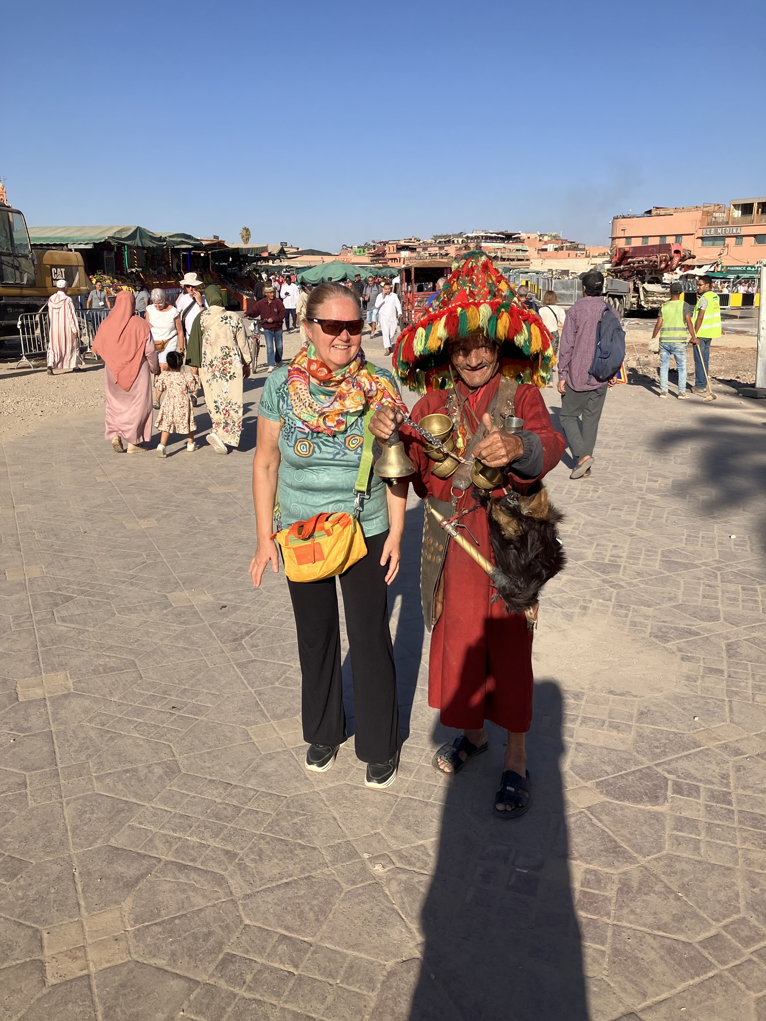 Und was darf in Marrakesch nicht fehlen. Der Wasserträger – auf arabisch Guerrab. Wir haben ihn am Gauklerplatz zufällig getroffen. Heute verdient er sein Geld indem er sich mit seinem traditionellen Kostüm mit Touristen fotografieren lässt. Früher brachte der Wasserträger Trinkwasser zu den Händlern in die Souks. Mit seine Glöckchen war es zu hören und man sagt eine Begegnung mit dem Wasserträger bringt Glück.
