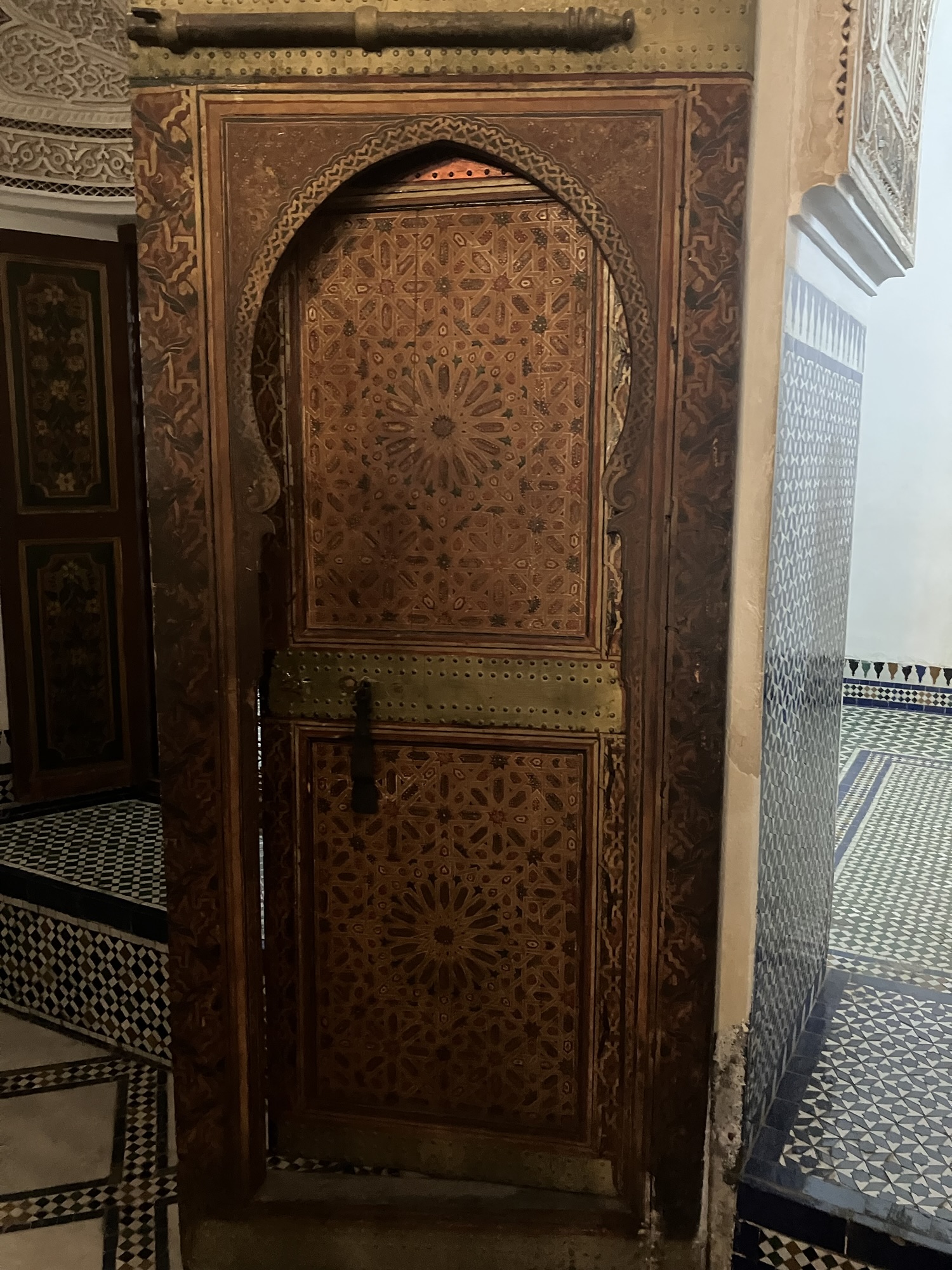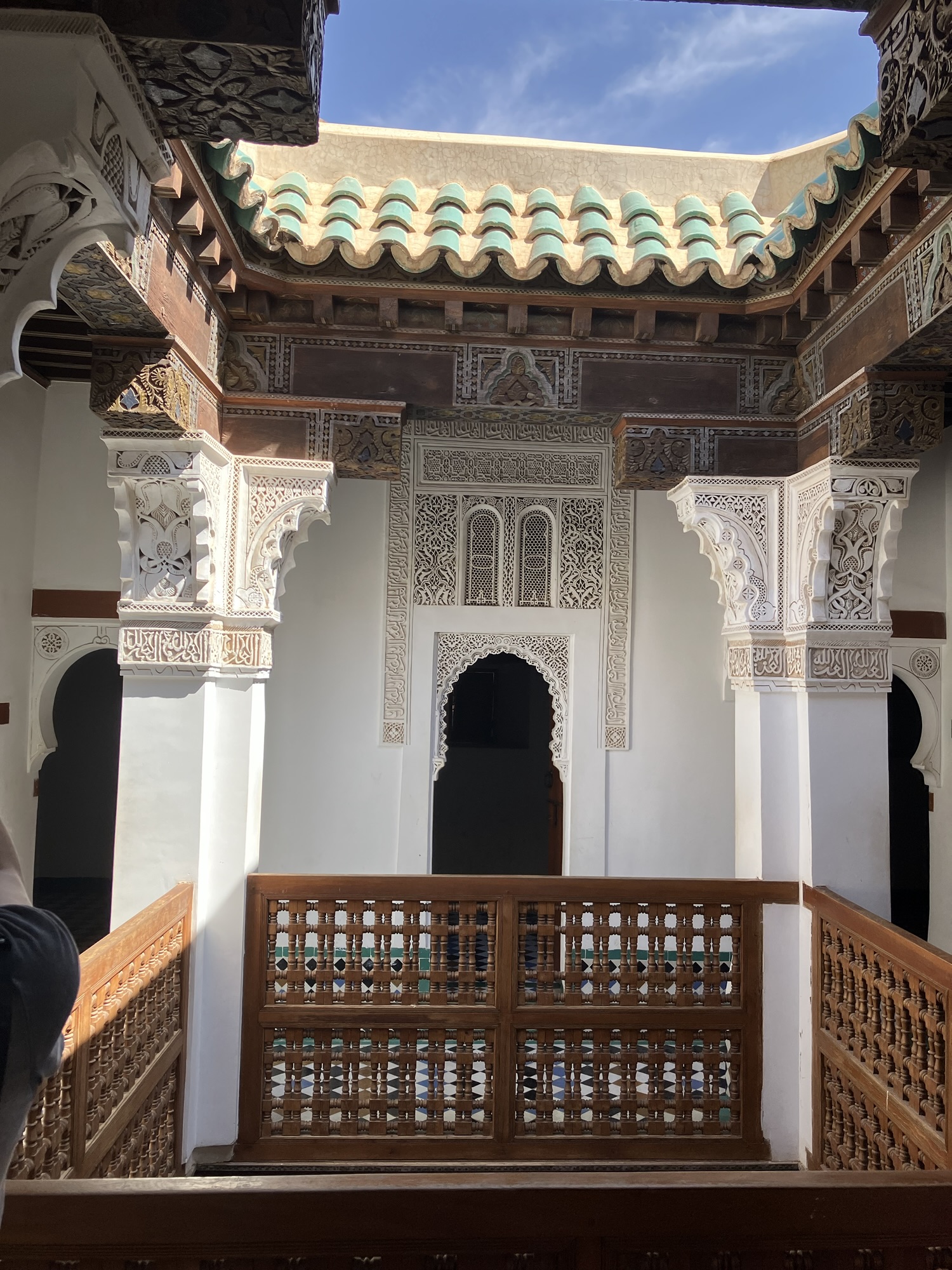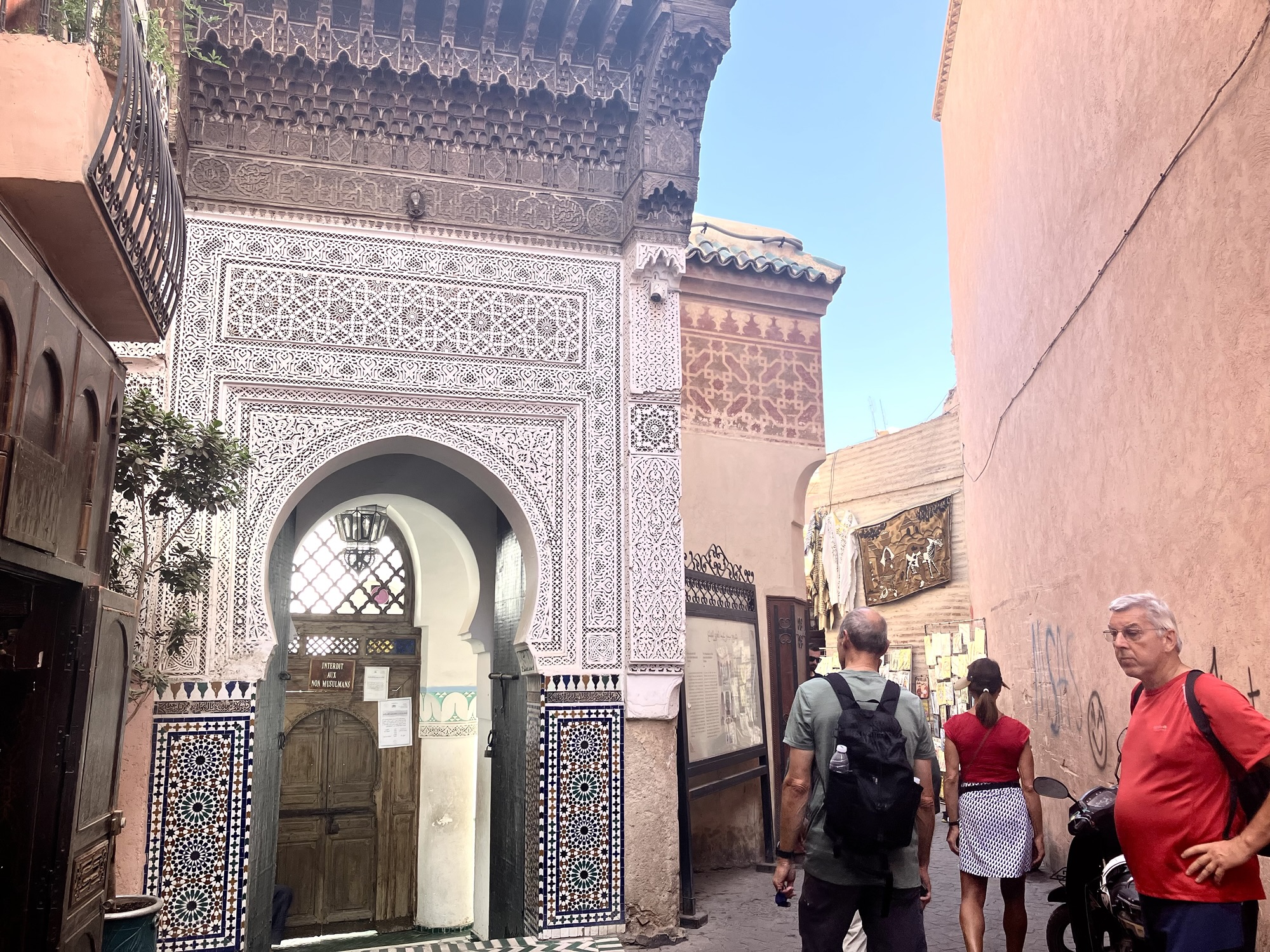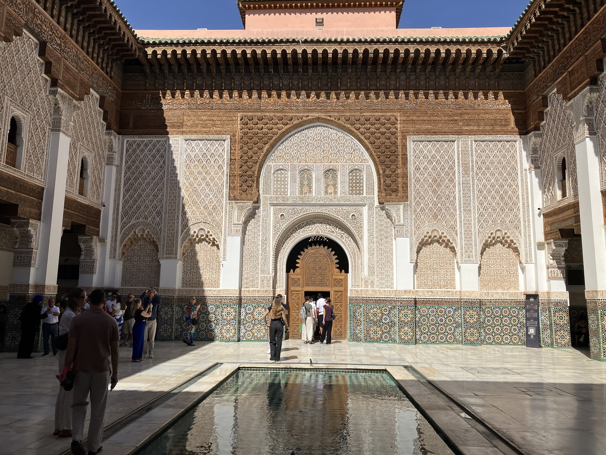 Da passt gleich unser nächster Besichtigungspunkt, die Medresa Ben Youssef aus dem 14. Jahrhundert. Auch da waren wir froh unseren Guide zu haben, um schnell an den Menschenmassen vorbei in das Gebäude zu kommen. Bis zu 360 Schüler fanden in der Medresa Platz. Wenn man sich´s leisten konnte, bekam man ein Einzelzimmer mit Fenster zum Innenhof. Wenn die Geldbeutel nicht so gefüllt waren, wurde es nur eine dreier Zelle mit kleinen Oberlichtfenstern. 1960 wurde der Lehrbetrieb eingestellt. Danach erfolgte die Umwidmung zu einem Museum. Auch architektonisch ist es ein beachtliches Bauwerk mit kostbarem Fliesendekor.