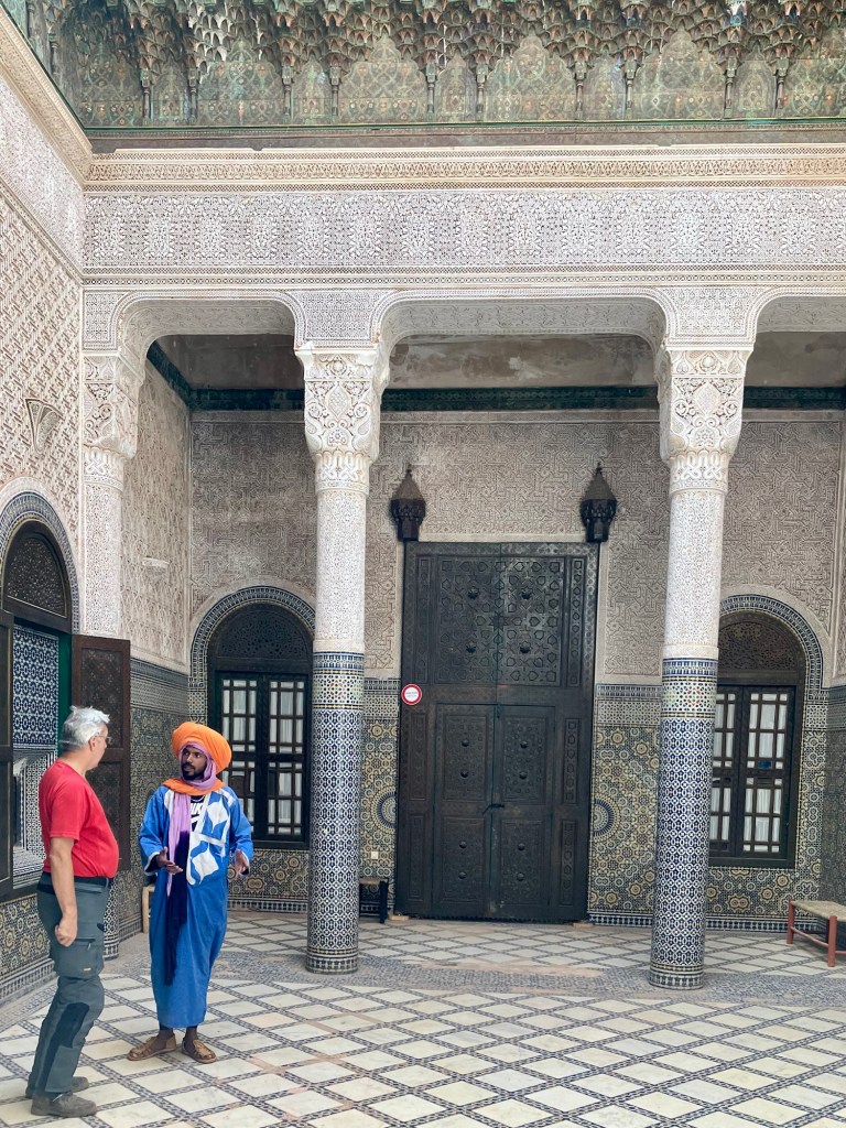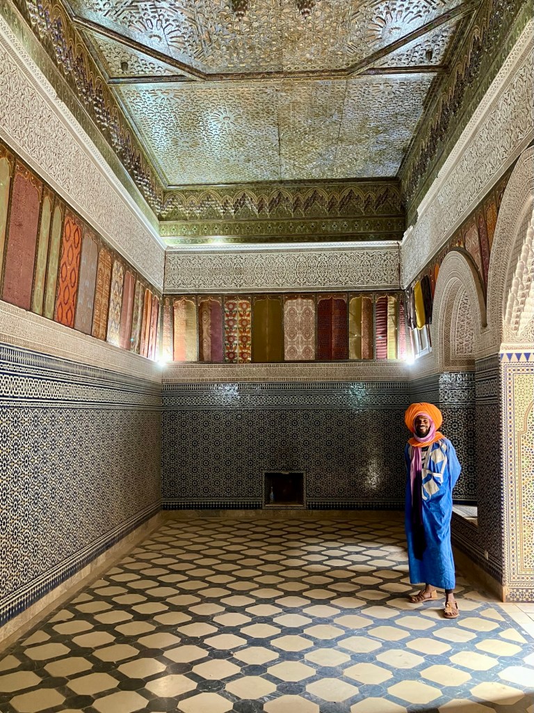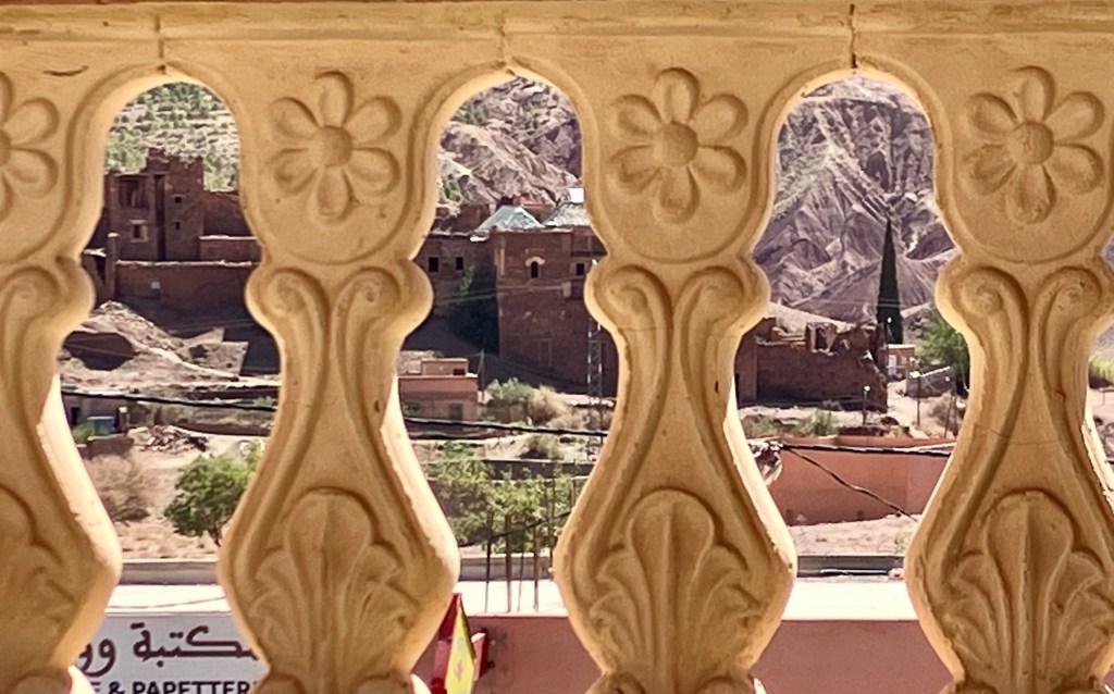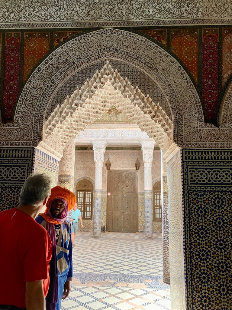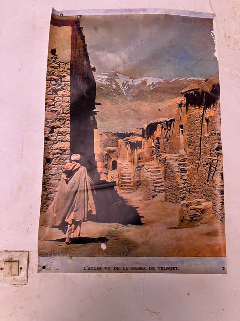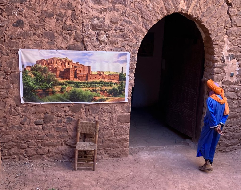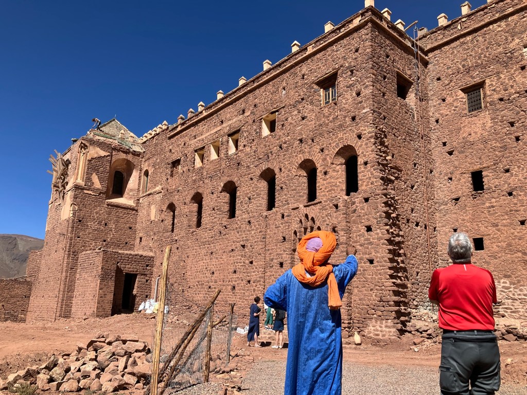 Nach der wunderbaren Fahrt auf wirklich gutem Asphalt kamen wir in Telouet einem kleinen Ort auf 1900m an. Ein freundlicher Parkplatzeinweiser, gleich beim ersten Restaurant, verleitete uns neben den drei spanischen BMW-Motorrädern stehen zu bleiben. Etwas hungrig waren wir auch. Der Kellner war nicht weniger freundlich. Trotzdem waren wir vorsichtig. Wir waren uns nicht sicher, ob der junge Mann ein Covid verseuchter Patient war, bei dem Geniesse und Gehuste. Gut, dass ich infektionsvorbeugende Feuchttücher in der Hosentasche hatte. Sicher ist sicher. Nach dem Essen gab er uns noch einen Tipp, dass ein Freund von ihm in der Kasbah Führungen macht. Wir lehnten vorerst dankend ab, obgleich wir vor hatten die Anlage zu besuchen. Rauf auf den Bock und rüber zur Burg. Noch ein Parkplatzeinweiser! Wir flüchteten vom Parkplatz vorbei an einem Misthaufen, in der Hoffnung zum Eingang zu kommen. Aus der Ferne winkte ein in Berbertracht gekleideter Mann mit einem leuchtenden orangen Turban! Austria? Austria? Wir stellten uns taub. Beim Misthaufen hatte er uns schon eingeholt. Der Eingang ist wo anders und die Kasbah ist wirklich sehenswert, meinte er. Er zeigte und eine kleine Broschüre. Er hatte uns neugierig gemacht. Wir machten einen Preis. Der Bock wurde auf den offiziellen Parkplatz gebracht und schon starteten wir mit dem freundlichen jungen Mann. Wir hatten Glück, denn die Kasbah – zumindest, das was noch stand und zugänglich war – war erst vor drei Wochen wieder geöffnet worden. Das Telefonat von seinem Freund aus dem Restaurant hatte sich für ihn finaziell und für uns wegen der guten Führung ausgezahlt.
