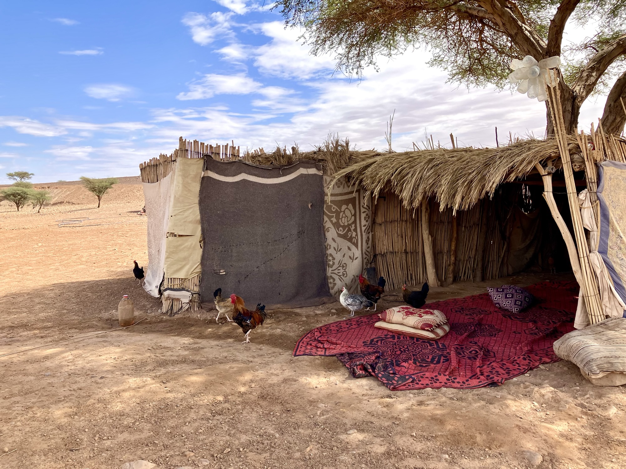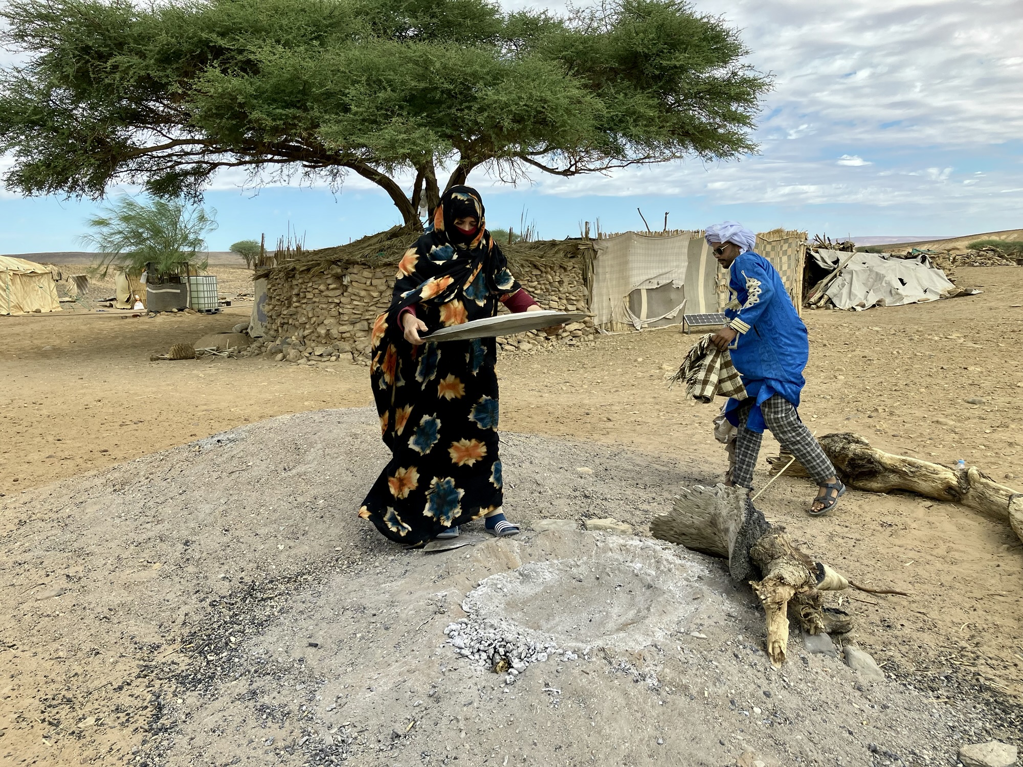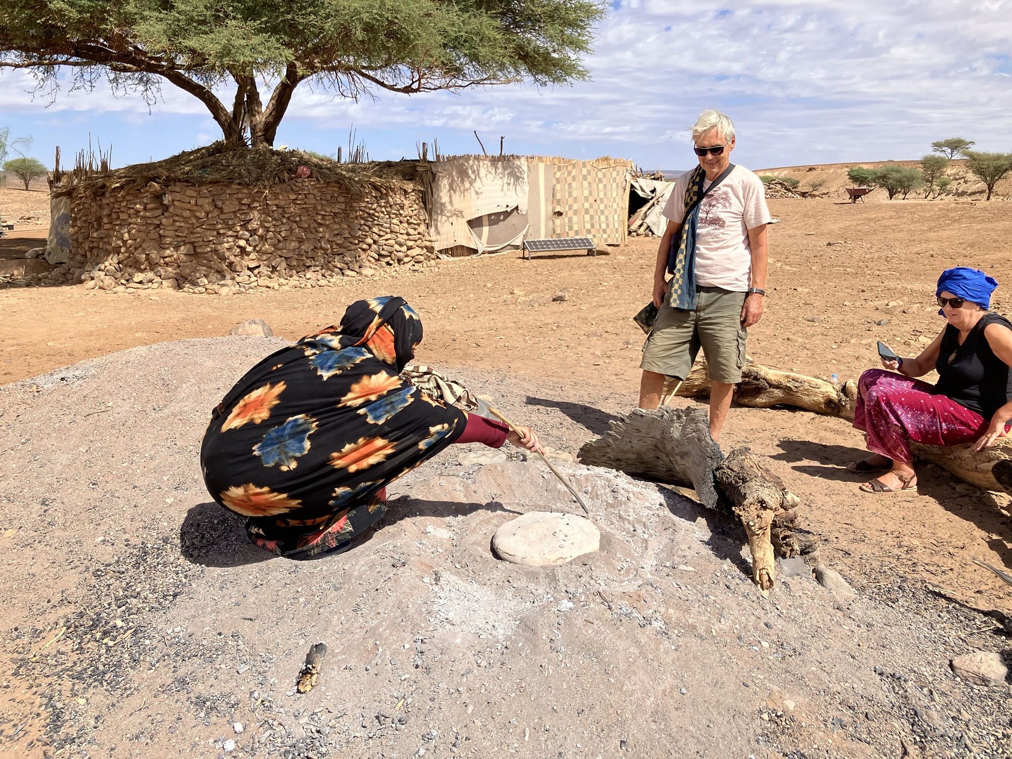 Bei einer Nomadenfamilie wurde uns gezeigt, wie man ein „Sonnenbrot“ bäckt. Das Brot wird direkt in der Asche gebacken. Der Vorgang dauert nur 20 Minuten und dann ist es fertig. Es hat super gut geschmeckt. Während wir warteten, hatten wir Gelegenheit uns umzusehen. Das Leben der Frau ist schon eine sehr bodenständige Welt, weit weg von dem Komfort, den wir gewohnt sind.