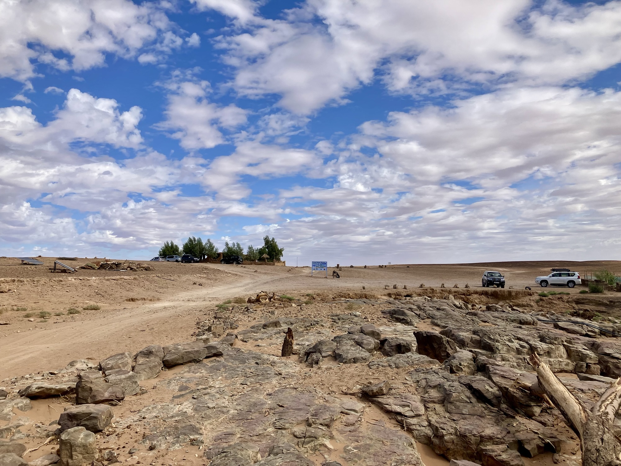 Diesmal halte ich mich kurz. Wir wurden von einem 4×4 zu einem kleinen Camp (1) gebracht und von dort aus genossen wir die Weiterfahrt in einem 4×4 zuerst durch eine Mondlandschaft nahe der algerischen Grenze.