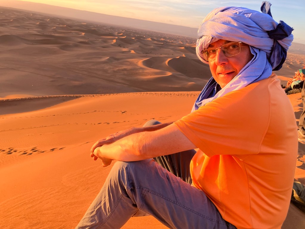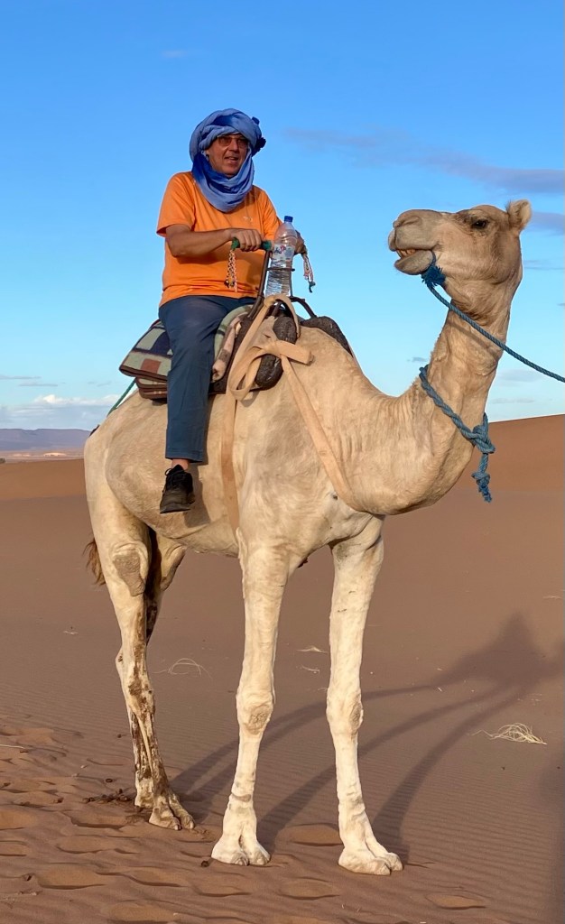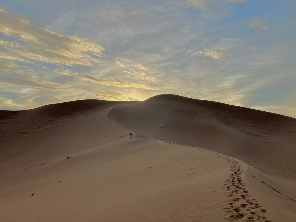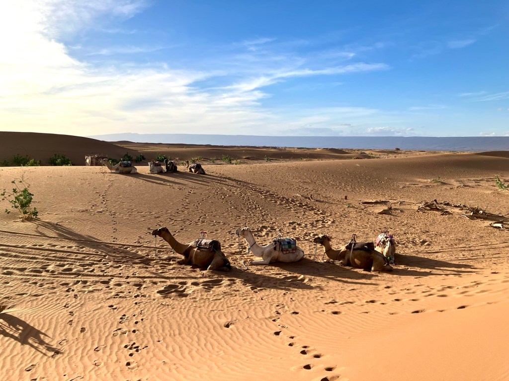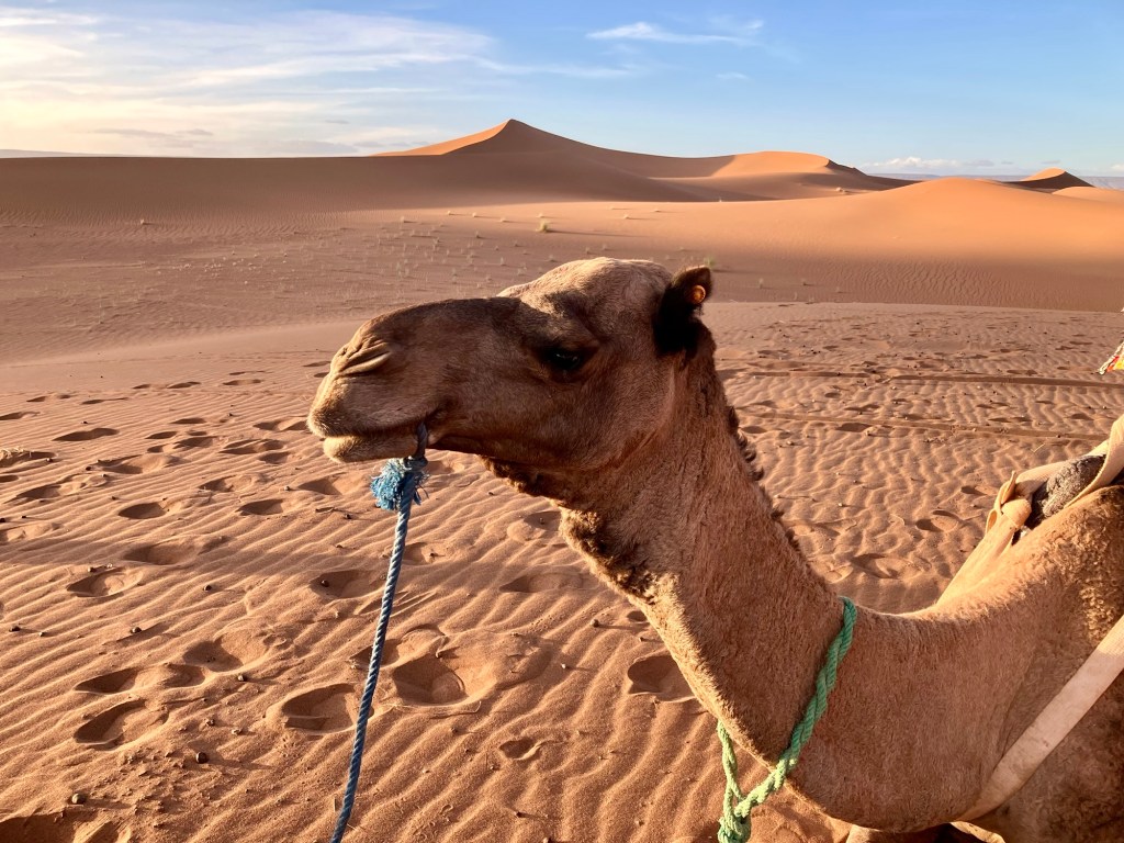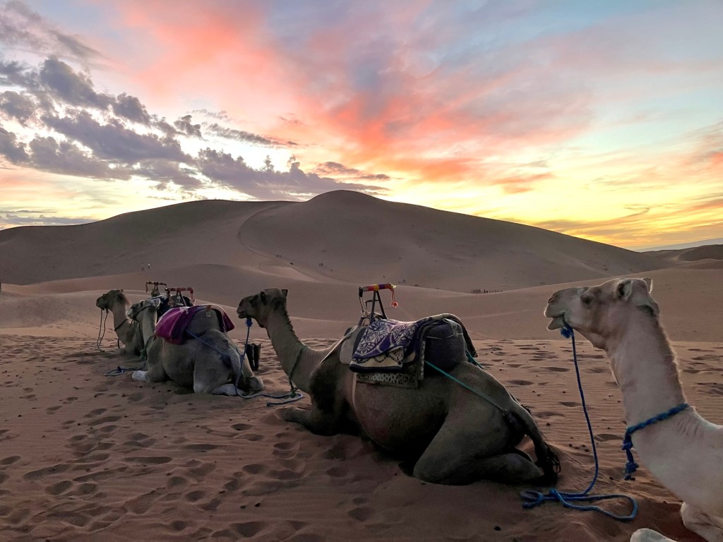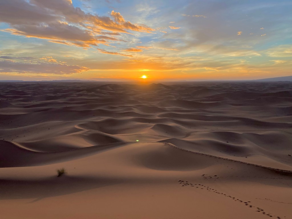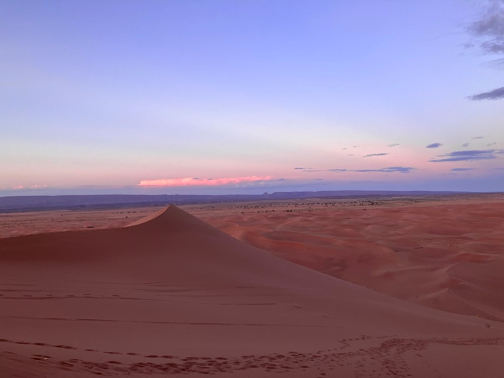 Von der Oasis Sacrée ging es weiter in die Wüste hinein, zu unserem nächsten Camp. Rechtzeitig vor Sonnenuntergang beim Erg Chegaga kletterten wir auf unsere Dromedare, die uns näher zur Düne brachten. Die letzten 100 Höhenmeter mussten wir zu Fuss zurück legen. Uff, war das anstrengend. Natürlich waren wir nicht ganz alleine am Dünenkamm, aber das machte nichts aus. alle waren ruhig und genossen den Sonnenuntergang, ein magisches Erlebnis.