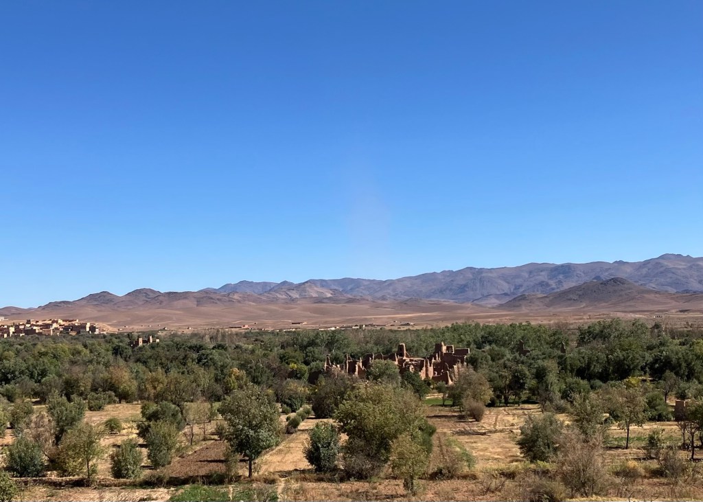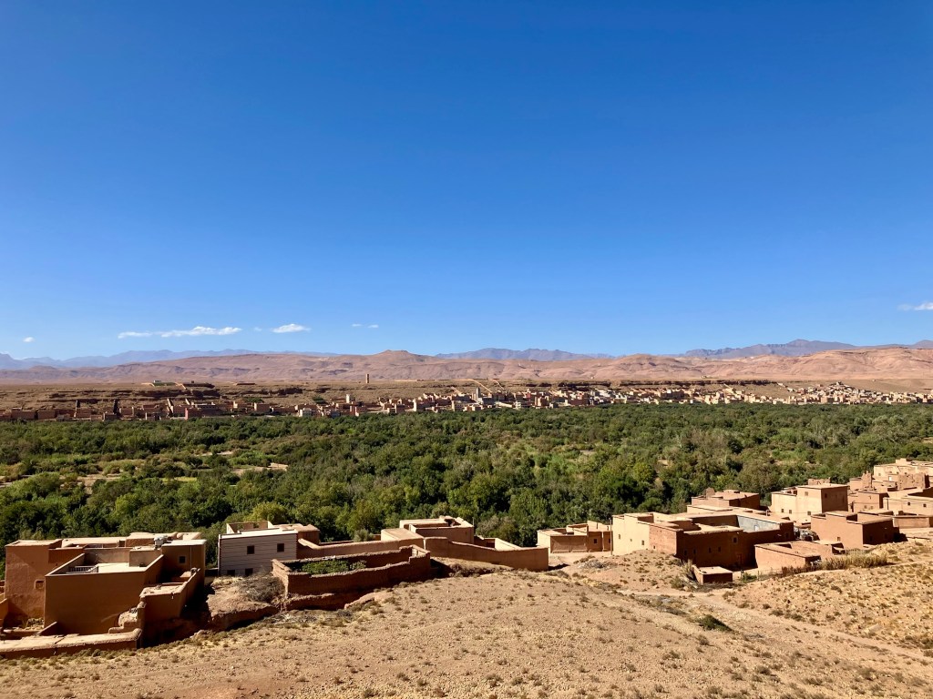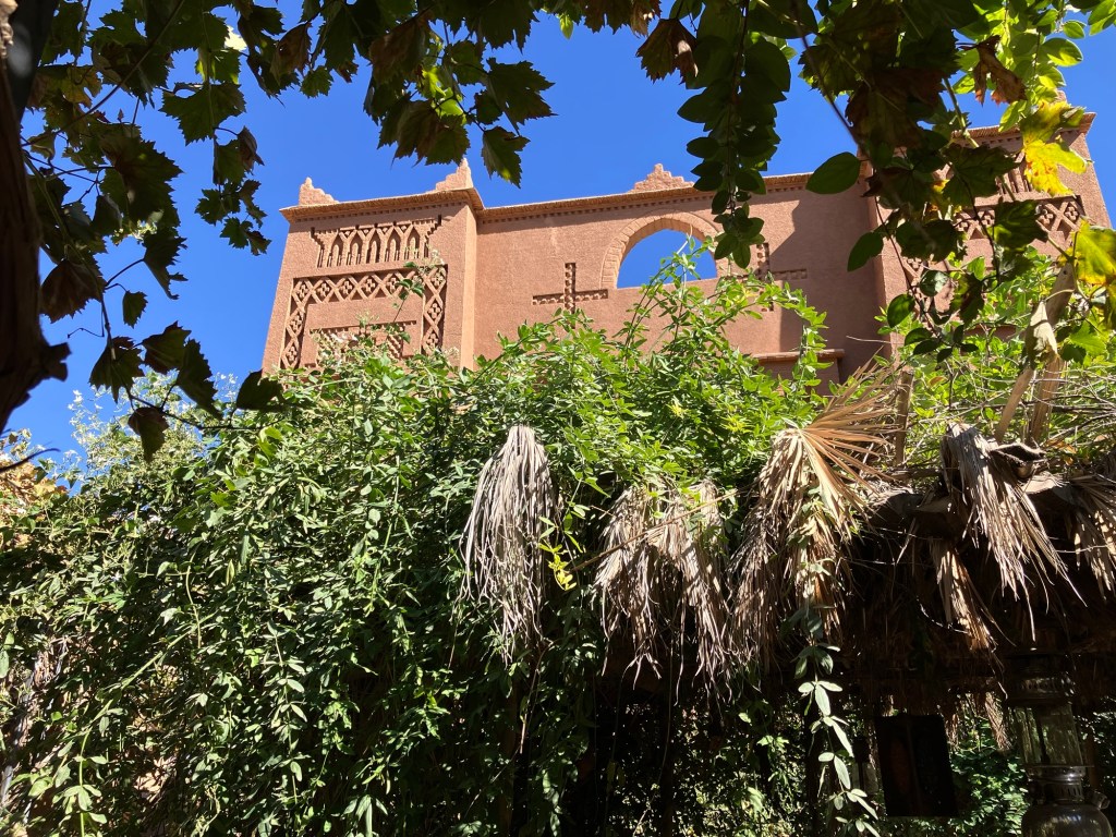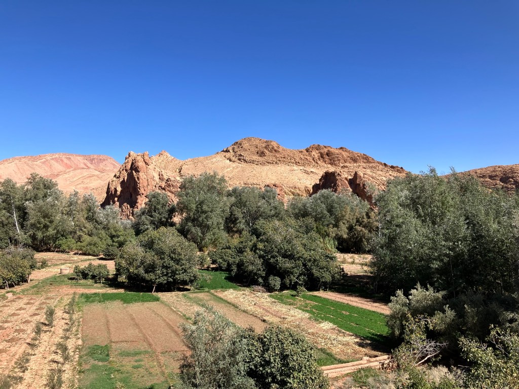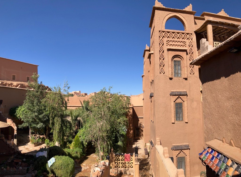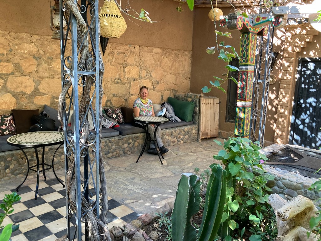 Wo die vielen Rosen wachsen, blieb uns zwar weiterhin verborgen, denn bei unserer Fahrt ins Rosental konnte wir nicht wirklich welche ausmachen. Landschaftlich war´s aber super schön. Zum Hotel Kasbah Tiziri machten wir einen kleinen Abstecher, weil ich noch ein paar Fotos machen wollte, nur von aussen, wir hatten ja kein Zimmer dort gebucht. Die Manager hörten das Motorengeräusch vom Bock, öffneten das Tor und luden uns ein auch drinnen zu fotografieren. Von der Terrasse konnte man die Ruinen der alten Kasbah und die Reste vom jüdischen Viertel sehen. Angeblich sind dort in dem Areal um die Ruinen die vielen Rosenbüsche. Es muss wohl so sein. Wir verbrachten eine Weile in dem wunderbaren Garten, bevor wir uns wieder ins Getümmel* von El-Kelaa M’Gouna stürzten, nicht ahnend, dass uns eine schlaflose Nacht bevorstehen würde. Das Zelt auf der Dachterrasse am Nebenhaus hatten wir beim Frühstück schon gesehen. Wir durften akustisch einer Berberhochzeit mit viel Trommelmusik beiwohnen. Sehr gewöhnungsbedürftig, vor allem wenn man schlafen möchte.