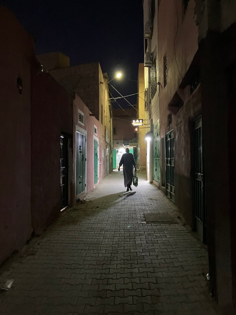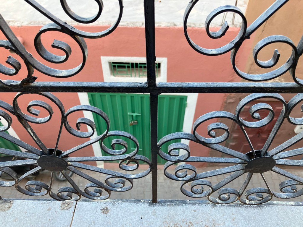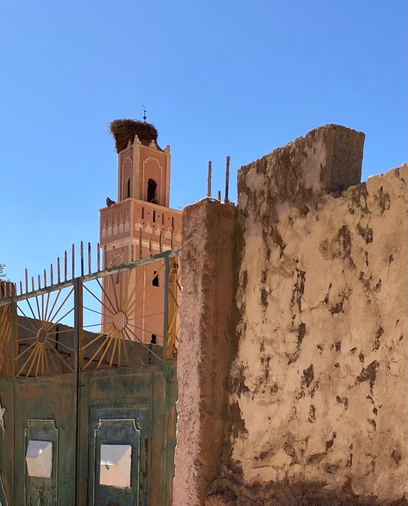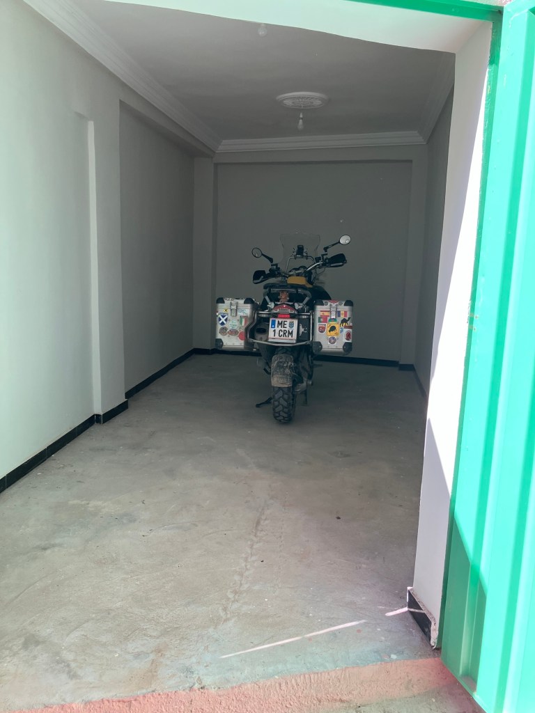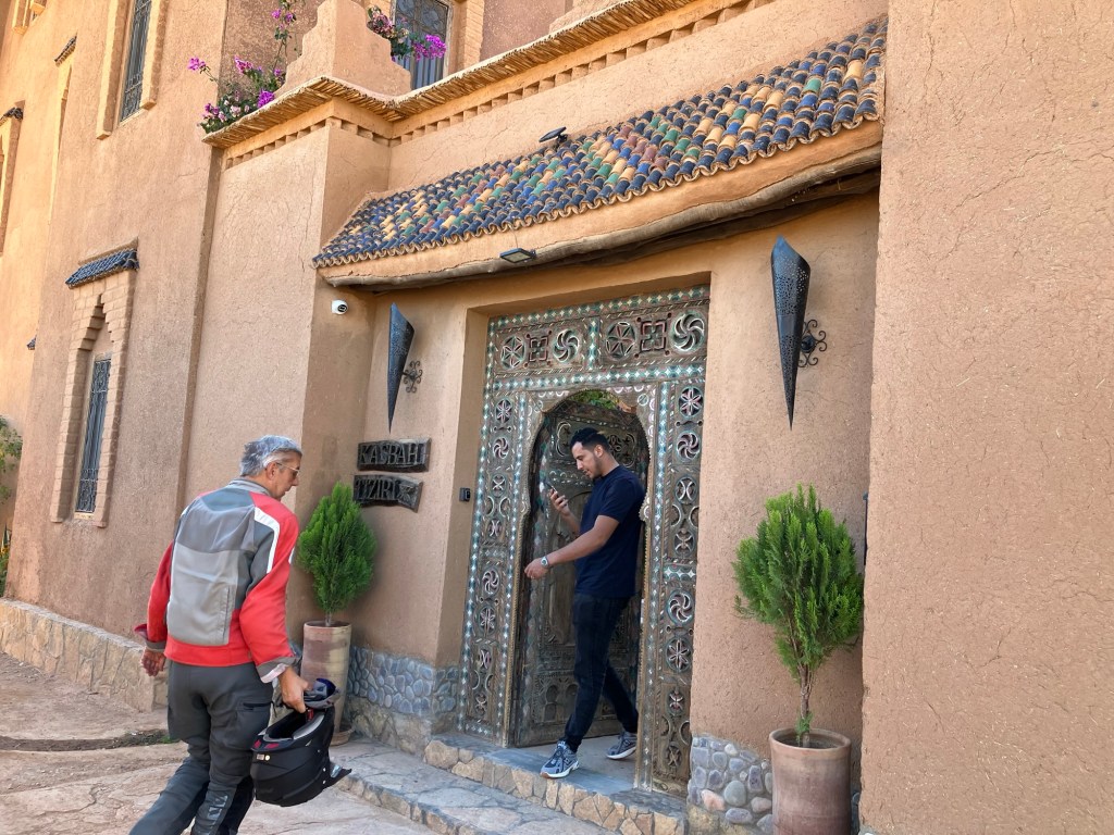 Eigentlich ist der Ort bereits der Hotspot für die marokkanische Rosenöl-Produktion. Auch wenn jetzt nicht Hauptsaison für die Rosenblütenernte war, so war der Ort an sich schon ein Erlebnis. Gefühlt waren wir die einzigen Touristen. In einem wunderschön renovierten kleinen Gästehaus mit nur zwei Zimmern mitten in der Stadt genossen wir das authentische marokkanische Leben. Bei der Ankunft waren wir zwar etwas verärgert über unsere Entscheidung quasi im Souk ein Quartier gebucht zu haben. Die Zufahrt war sehr eng und ich fürchtete, dass sogar der Bock stecken bleiben würde. Die Händler in der Gasse beschwichtigten uns. Nachdem wir alles abgeladen und in unser schickes Zimmer gebracht hatten, kam ein netter älterer Herr des Weges und öffnete das Garagentor vis a vis vom Hotel. Der Bock durfte in eine mit Stuckdekor neu gestrichene Luxusgarage einziehen. Na besser und sicherer geht’s nicht. So ein großes Vorhängeschloss hatte auch ich noch nie gesehen.