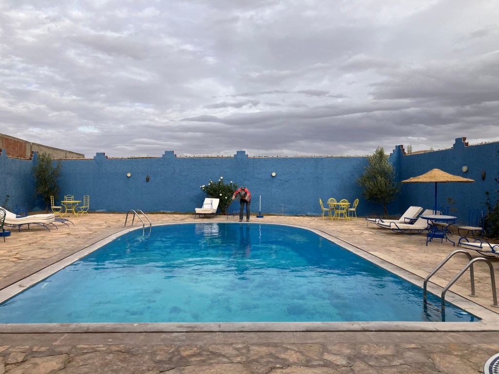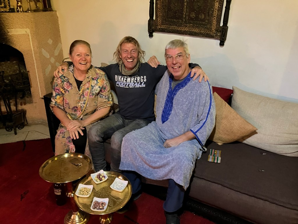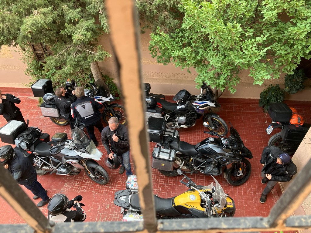 Zurück in dem gebuchten Riad, wo wir schon unser Gepäck abgeladen hatten, damit wir zur Mine nicht so schwer beladen sind, genossen wir die wunderbare Anlage, die diese Oase bot. Es ist erstaunlich, welch wunderbare Schmuckkästchen man in Marokko findet, in Gegenden wo man das gar nicht erwartet. Hinter hohen Mauern verbergen sich die wahren Schätze. Der Bock konnte im begrünten Hof logieren, wo er bald Gesellschaft von weiteren fünf Motorrädern bekam. Australier mit einem belgischen Guide, der in Spanien lebt und in Marokko Touren anbietet, gesellten sich zu uns. Eine coole Truppe. Das Abendessen muss ich erwähnen, weil es einfach köstlich war in dem schönen Ambiente – als add-on gab es auch Wein und Bier. Das hat alle Gäste gefreut.