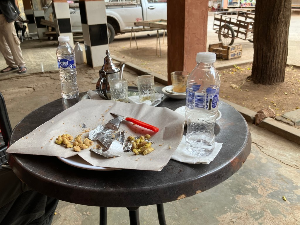 Am nächsten Tag ging es weiter, ein ganz normaler Fahrtag ohne viel Extras. Die Landschaft wurde mit einem Schlag grüner. Der Meister Garmin hatte sich eine schöne kurvige Seitenstraße ausgesucht. In El-Kebab gönnten wir uns eine Pause. Der Ort hat nicht einmal ein Hotel oder eine Herberge. Nichts touristisches, ein Ort mit authentisch marokkanischem Leben. Viele kleine Läden entlang der Straße, der Esel ist ein wichtiges Transportmittel. Es werden dem Tier auch Berge von Ziegel in seine Packtaschen gesteckt. Leider war ich zu langsam zum Fotografieren. Der Schneider hat seine Nähmaschine (sicher 60 Jahre alt das Modell) bei der Eingangstür aufgebaut und immer wieder kommen Leute vorbei und lassen kleine Reparaturen machen. Es ist ein Kommen und Gehen. Wir nahmen an einem Tischchen Platz. Es war nicht klar, zu wem der Tisch gehört. Nun ein netter Herr fühlte sich dafür zuständig. Wir bestellten Tee (was sonst in Marokko). Ob wir auch was essen wollen, er hätte Käse. So richtigen Käse, hatten wir schon lange nicht, oja, fein, wir bestellten. Was kam, frisches Brot mit Streichkäse, den man beim marokkanischen Frühstück meistens bekommt. Wenn schon über die Stränge hauen, dann ordentlich. Oliven? Auf der anderen Straßenseite war ein Olivenhändler, von dort brachte er uns noch Oliven. Was hat der Luxus gekostet, € 5,00, mit Trinkgeld. Gestärkt schwangen wir uns auf den Bock. Bis Bin-El-Ouidane war es noch ein Stück. Die Landschaft wurde grüner, Nadelbäume und Apfelplantagen waren eine willkommene Abwechslung für das Auge. Beni Mellal, eine Großstadt in Zentralmarokko, umschifften wir, indem wir in die Berge rauf fuhren. Noch ein paar Kurven und schon waren wir an unserem neuen Stützpunkt angekommen.