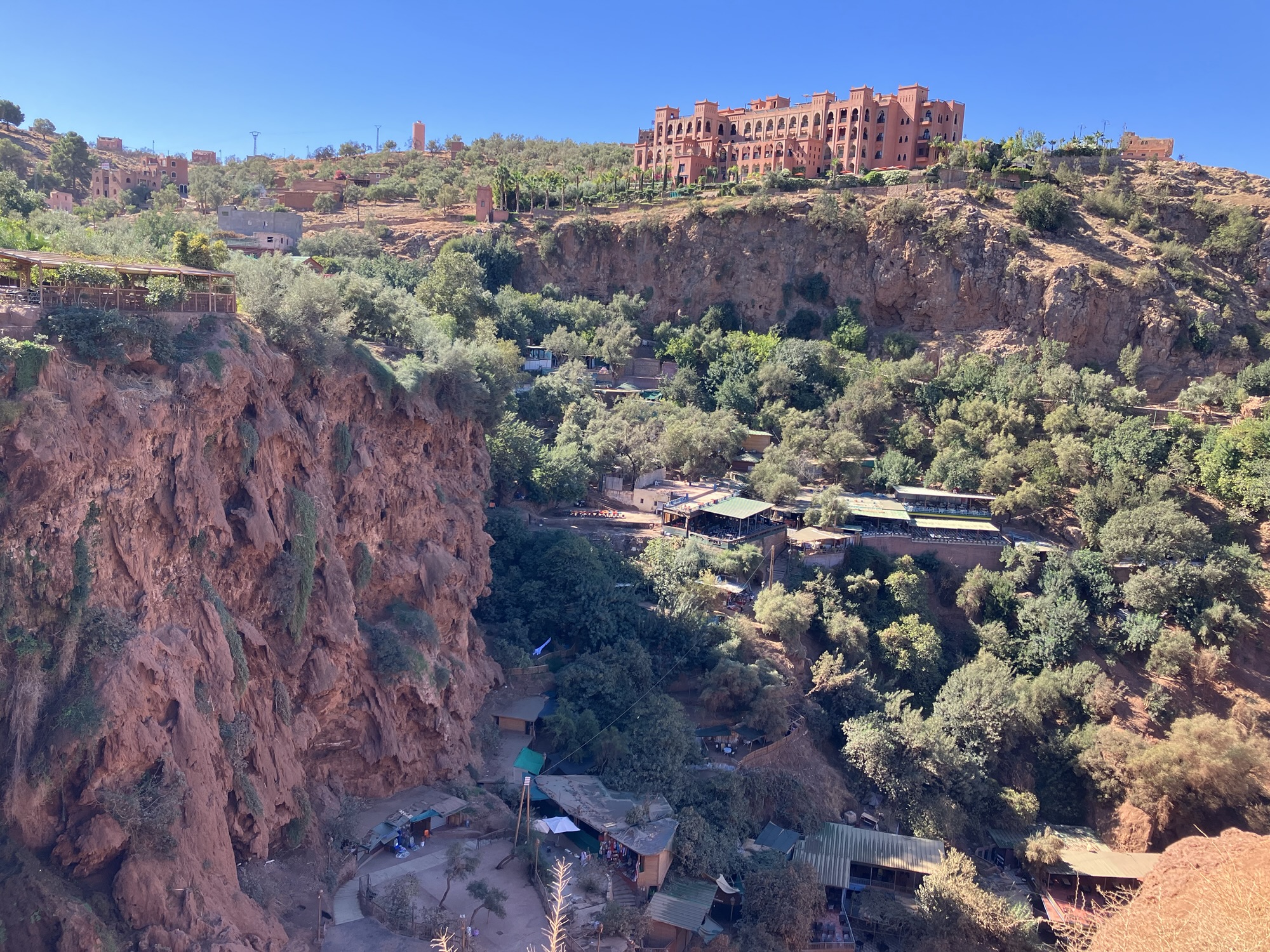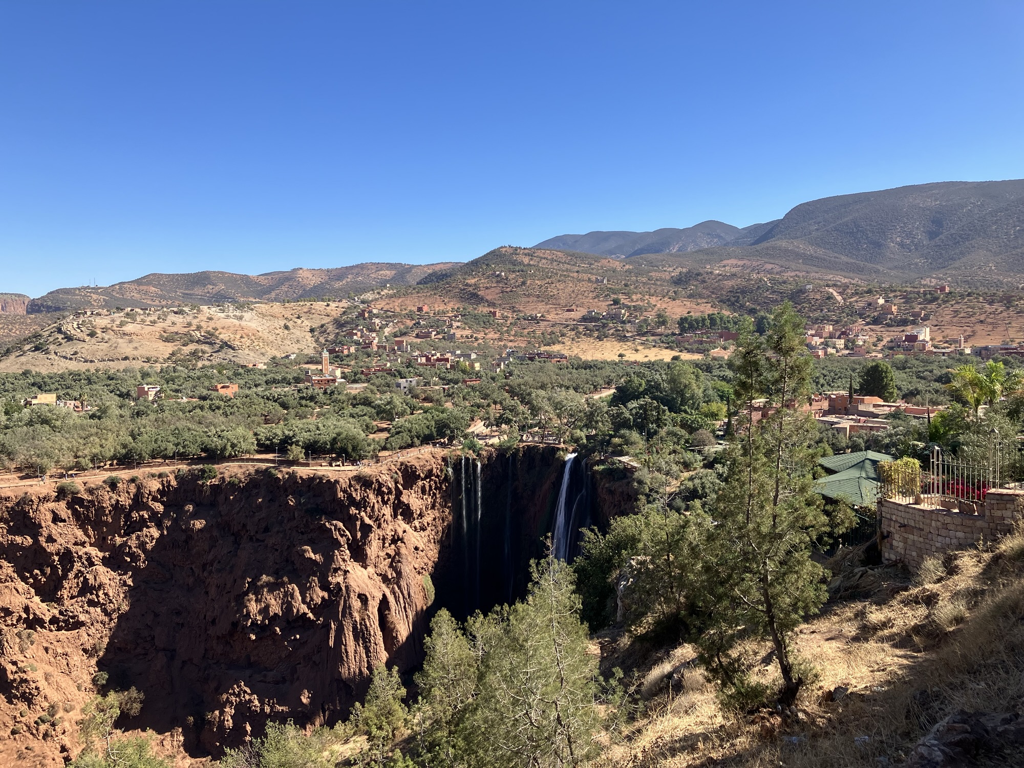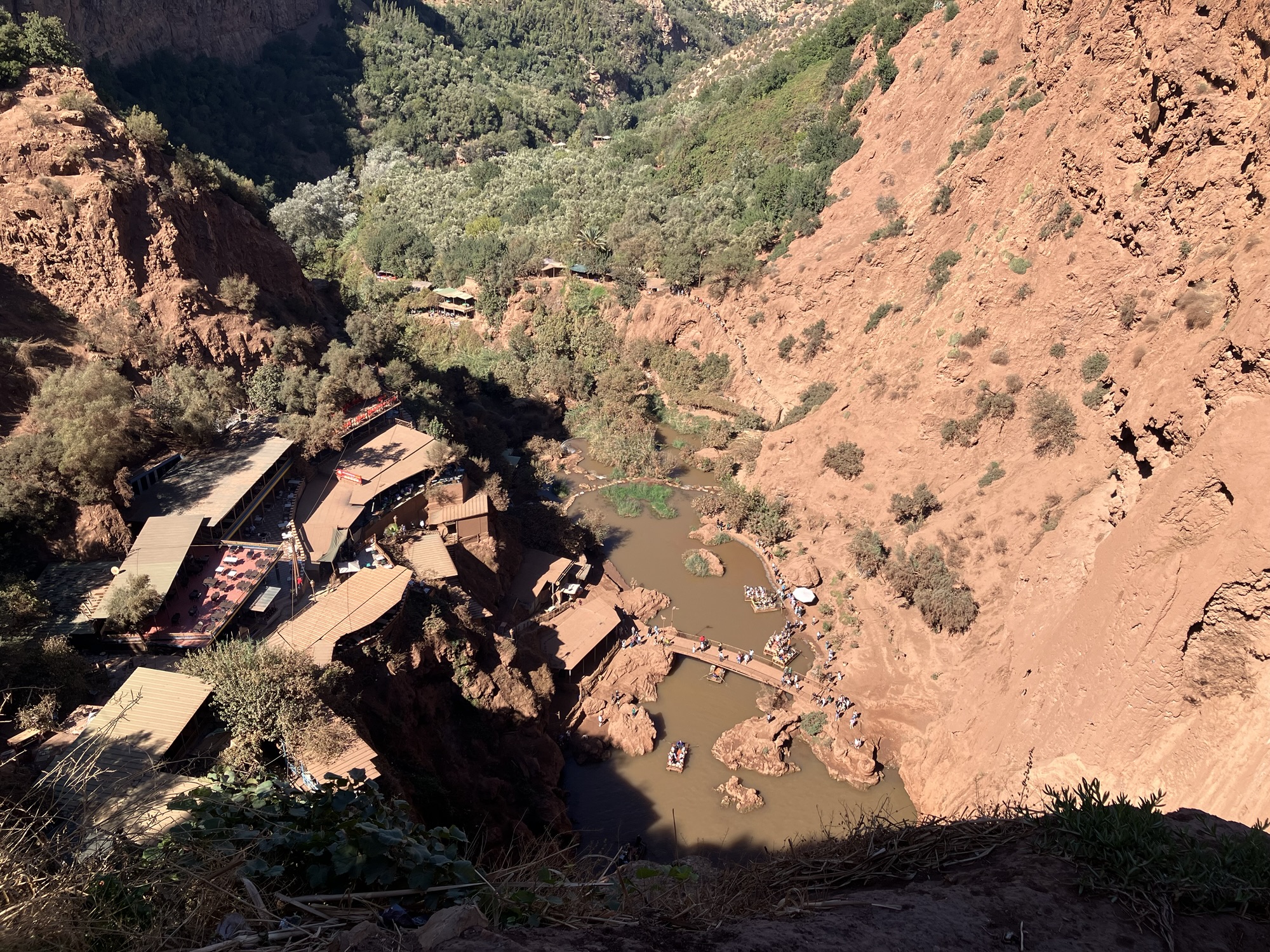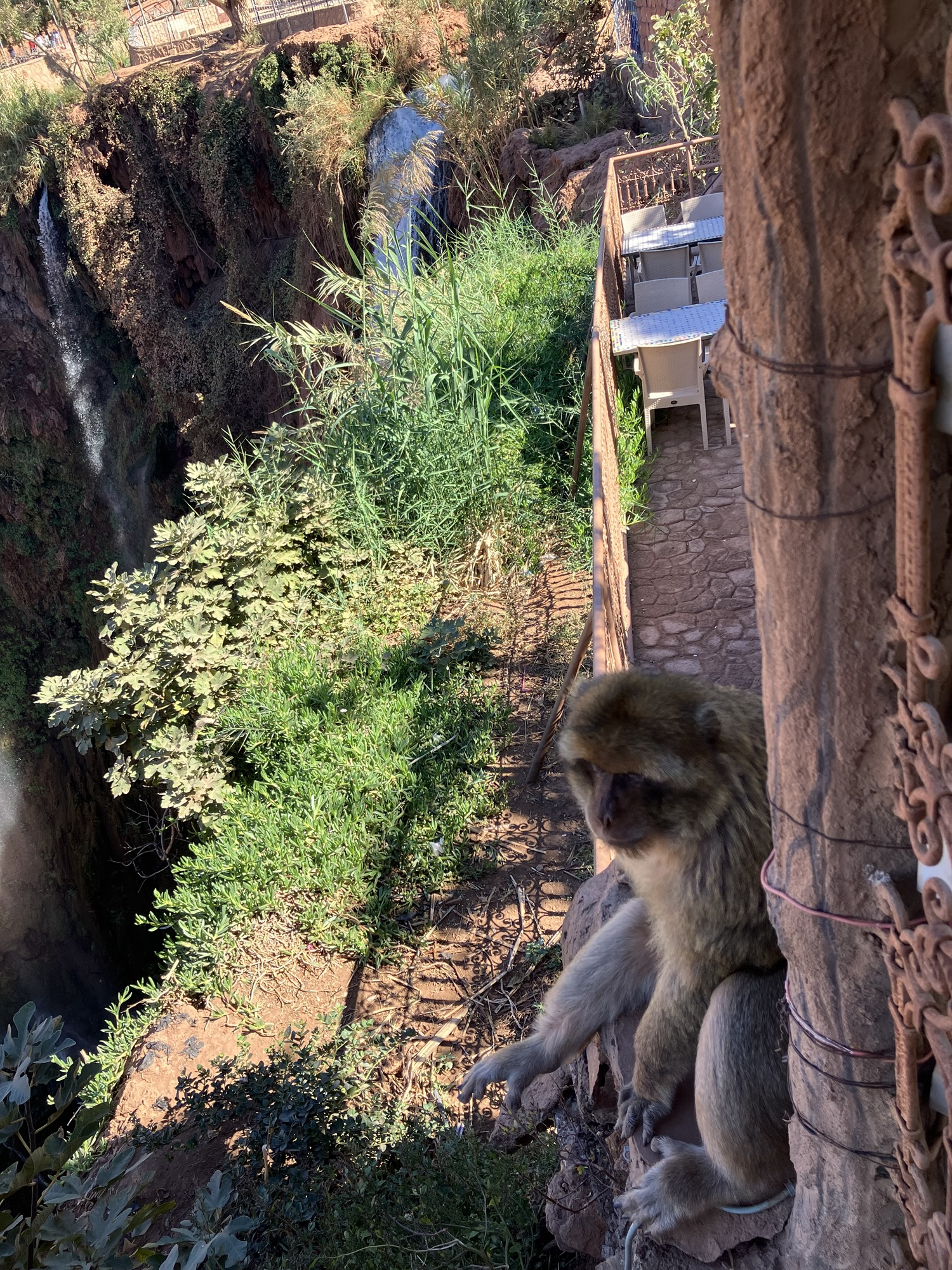 So erfrischt, war ich wieder fit für eine spritzige Tour. Die Cascades d´Ouzoud wurde angesteuert, ein beliebtes Touristenziel. Hinfahren, anschauen und wieder zurück fahren, mehr stand nicht am Plan, an den sich der Bock-Chef auch gehalten hat. Bei der Hinfahrt konnte man in der Ferne die Schnee bedeckten Gipfel des hohen Atlas in der Sonne glitzern sehen. In der Nacht hatte es da oben geschneit. Auch wenn die Bergketten in einiger Entfernung waren, beeindruckend war es trotzdem. Bei den Wasserfällen waren natürlich viele Reisende, die sich die mehrstufige Cascade mit einer Gesamtfallhöhe von 110m nicht entgehen liessen. Von der Besucherplattform hat man einen schönen Blick auf die Cascaden mit dem Regenbogen, der sich im Sprühnebel bildet. Wer runter ins Tal steigt, kann sich in einem der zahlreichen Restaurants laben oder eine Mini-Fahrt mit einem Floß machen. Wir waren bequem und sparten uns den Abstieg, blieben einfach oben und machten von da aus unsere Fotos. Ein Berber-Affe leistete uns kurz Gesellschaft. Zurück im Quartier, entspannten wir uns wieder am Pool in der Sonne. Ins Wasser ging ich nicht mehr.