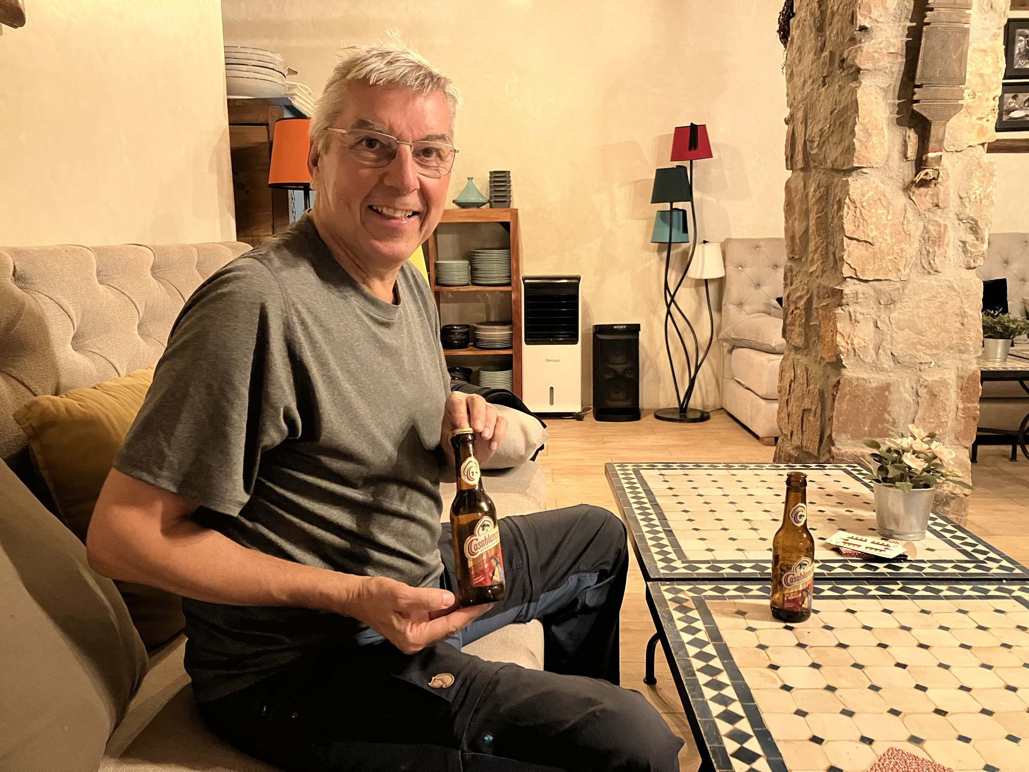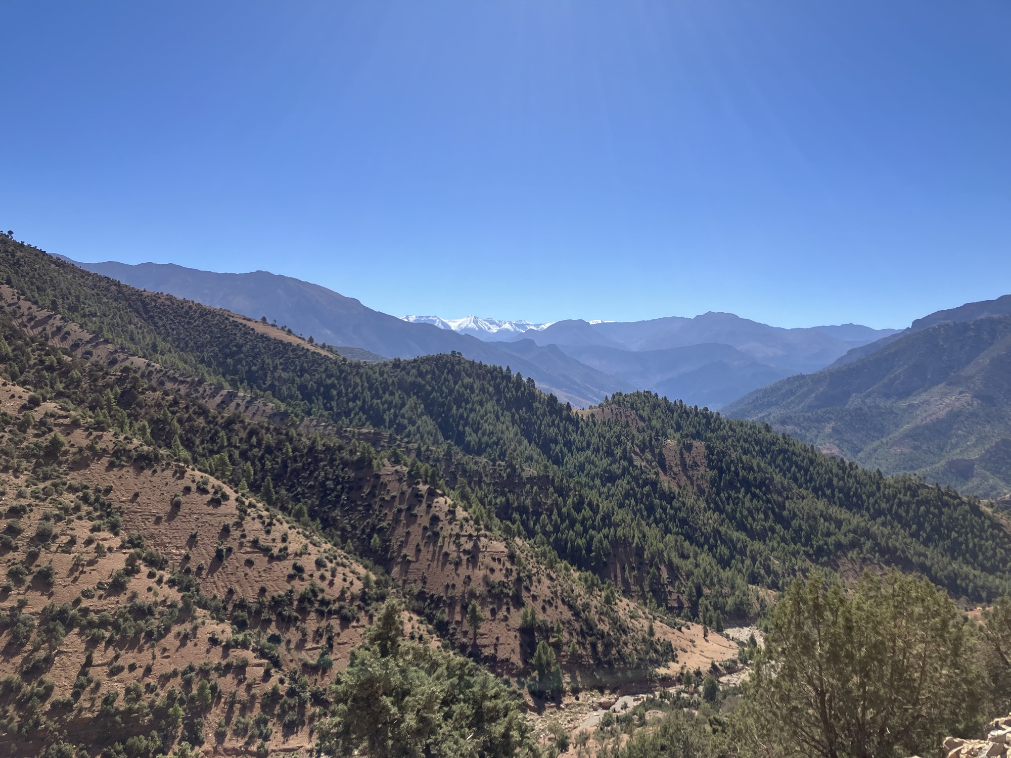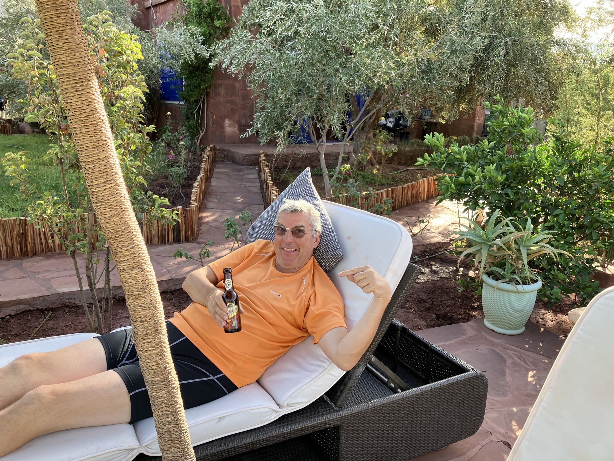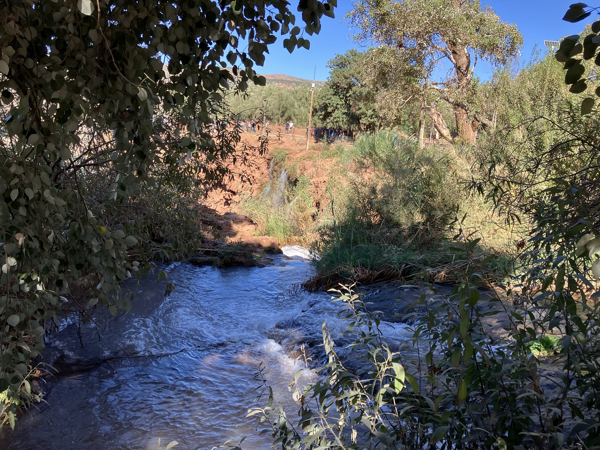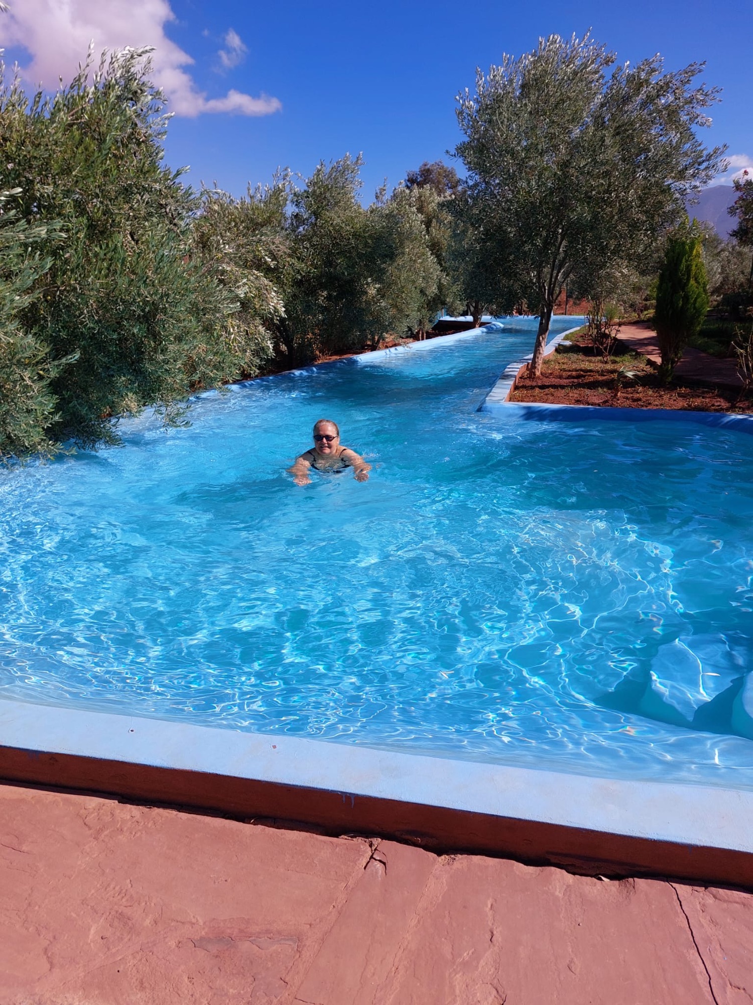 So erfrischt, war ich wieder fit für eine spritzige Tour. Die Cascades d´Ouzoud wurde angesteuert, ein beliebtes Touristenziel. Hinfahren, anschauen und wieder zurück fahren, mehr stand nicht am Plan, an den sich der Bock-Chef auch gehalten hat. Bei der Hinfahrt konnte man in der Ferne die Schnee bedeckten Gipfel des hohen Atlas in der Sonne glitzern sehen. In der Nacht hatte es da oben geschneit. Auch wenn die Bergketten in einiger Entfernung waren, beeindruckend war es trotzdem. Bei den Wasserfällen waren natürlich viele Reisende, die sich die mehrstufige Cascade mit einer Gesamtfallhöhe von 110m nicht entgehen liessen. Von der Besucherplattform hat man einen schönen Blick auf die Cascaden mit dem Regenbogen, der sich im Sprühnebel bildet. Wer runter ins Tal steigt, kann sich in einem der zahlreichen Restaurants laben oder eine Mini-Fahrt mit einem Floß machen. Wir waren bequem und sparten uns den Abstieg, blieben einfach oben und machten von da aus unsere Fotos. Ein Berber-Affe leistete uns kurz Gesellschaft. Zurück im Quartier, entspannten wir uns wieder am Pool in der Sonne. Ins Wasser ging ich nicht mehr.